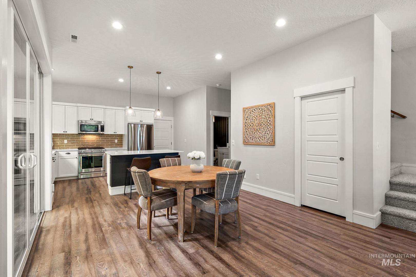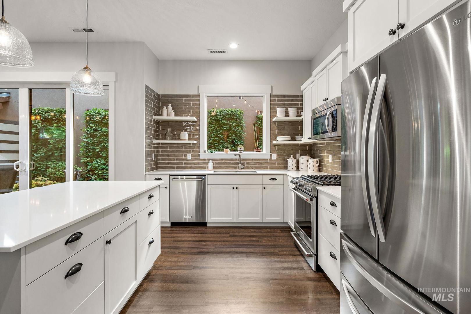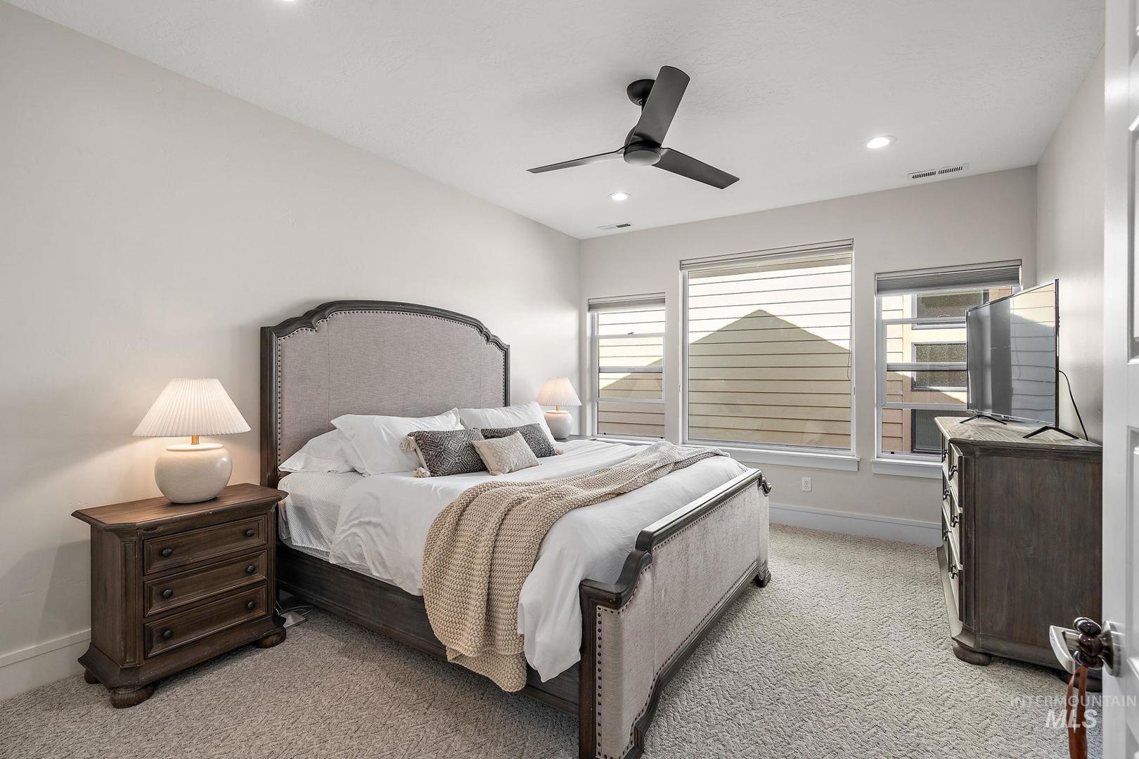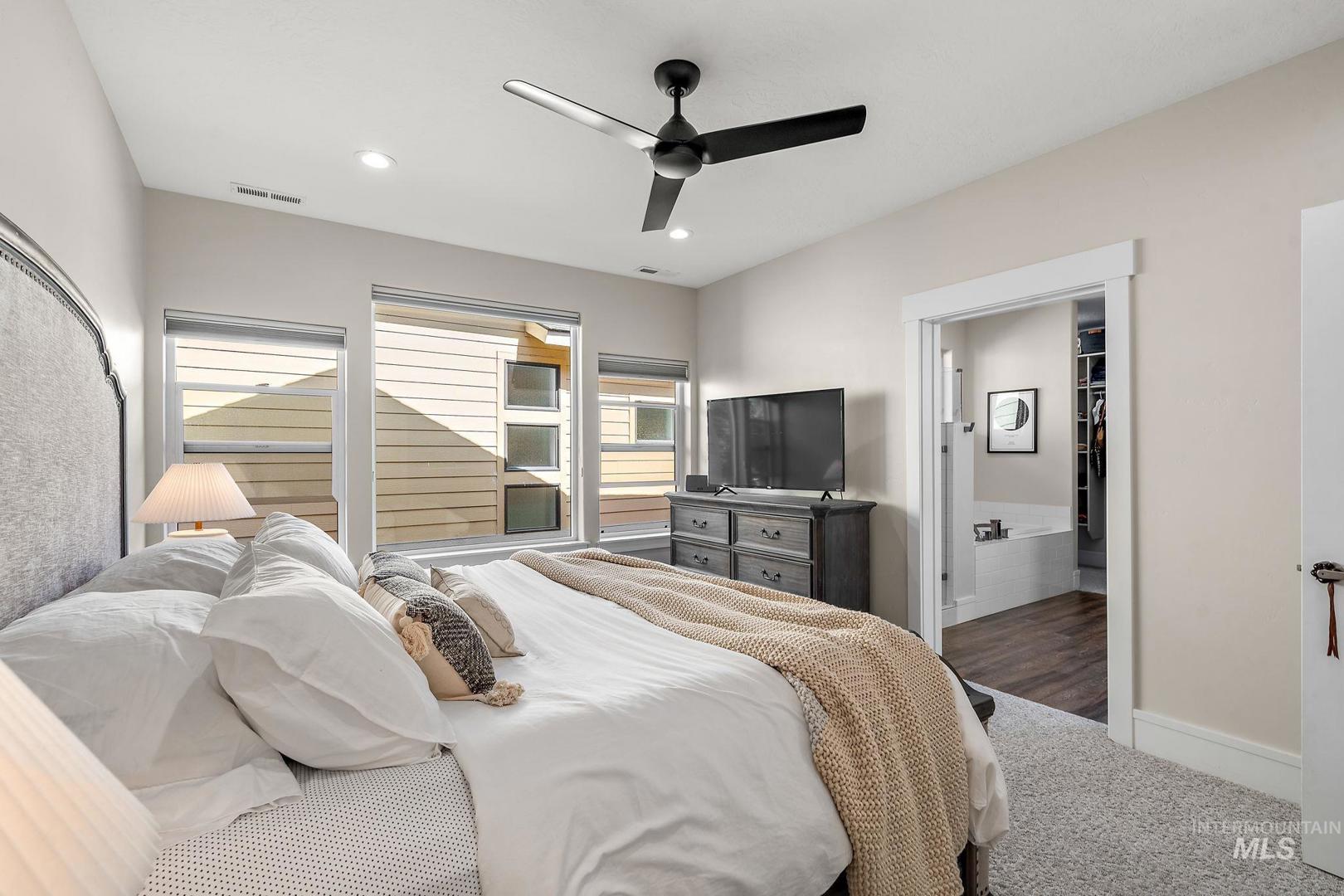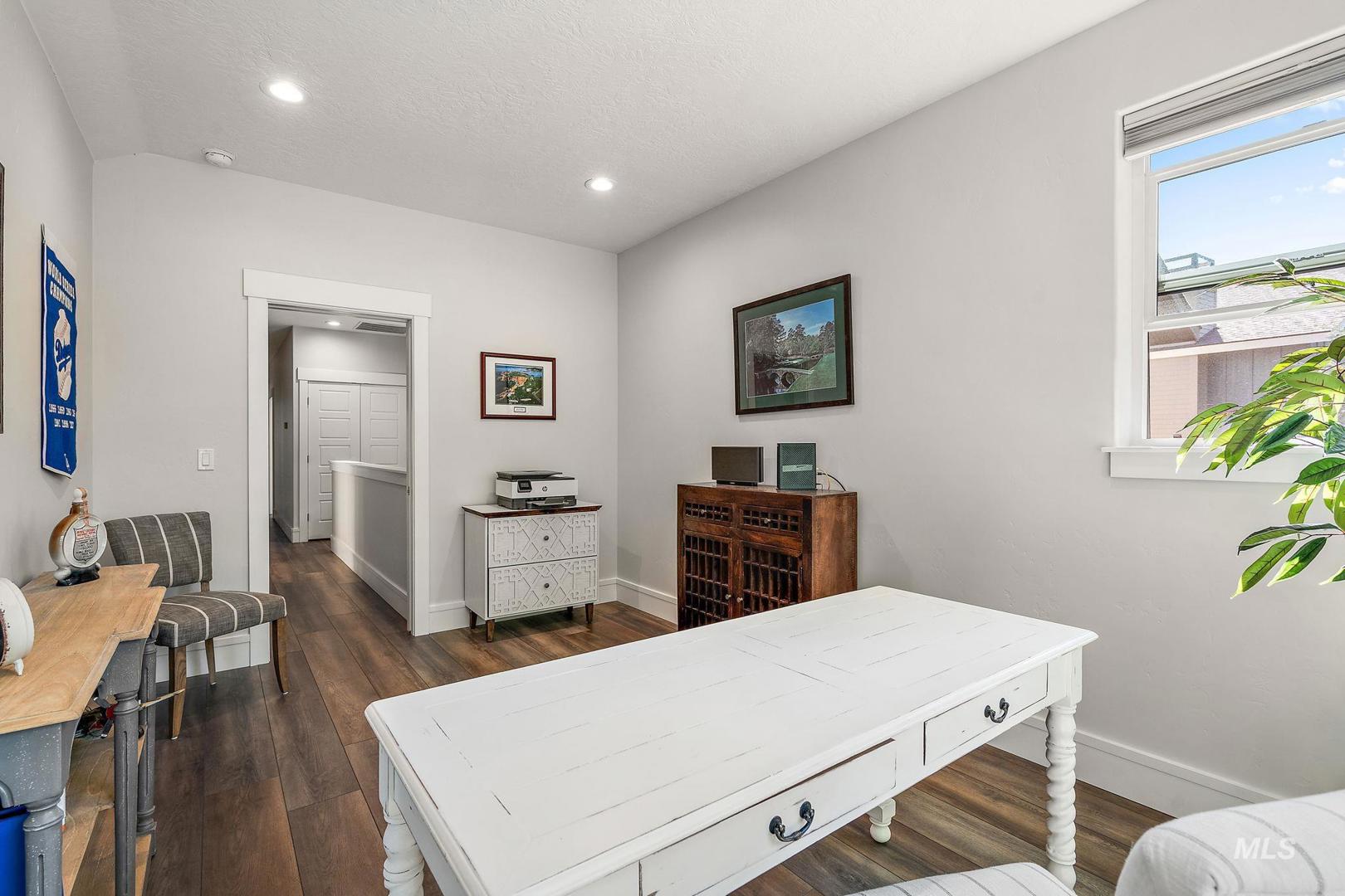 Welcome home to the highly desired River District! This beautifully updated 3-bed, 2-bath carriage-style home with an office offers comfort, style, and lasting value in one of the best locations near the Boise River and greenbelt. Enjoy resort-style living with access to the community pool, clubhouse, and private fishing pond—perfect for relaxation and recreation. The open-concept design features soaring ceilings, expansive windows, and a modern kitchen with quartz countertops, subway tile backsplash, and a walk-in pantry. The inviting great room with a gas fireplace opens to a covered patio and private courtyard, ideal for year-round entertaining and quiet evenings outdoors. Upstairs, the spacious primary suite includes a tiled shower, soaking tub, dual vanities, and a generous walk-in closet. Two additional bedrooms and a bright office/bonus room offer flexibility for family, guests, or remote work. Recent updates include fresh interior paint, LVP flooring, and new carpet. With HOA-maintained landscaping, up/down blinds throughout, and an extra-deep garage with alley access, this home combines modern convenience with low-maintenance living. Close to parks, shopping, and dining—this is the perfect place to settle in and enjoy Boise living at its best.