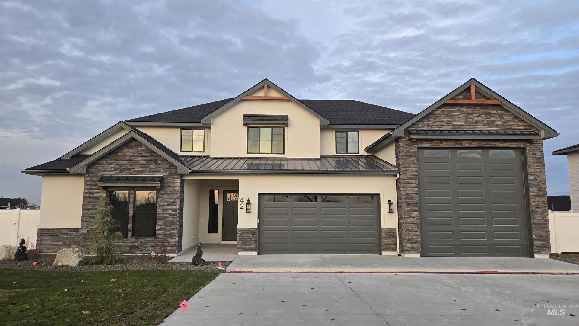 ASK ABOUT the $50k Holiday Promo thru 12/20! Rate buy-down, upgrades, closing costs-the choice is yours! The awesome Monaco floor plan offering a functional layout with main level primary and junior suite, crowned with a 45’ RV garage on nearly 3/4 acre! Spacious living/great room with cozy stone fireplace with built-ins and shelving. Kitchen boasts large eating area with accent wall, island and breakfast bar, beverage cooler, tons of cabinetry plus walk-in pantry and Bosch appliance package. Beautiful, main level primary with beamed, vaulted ceiling, shiplap walls and walk-in closet that conveniently opens to the laundry room w/deep sink. Relax in the soaker tub and enjoy stunning tilework throughout. Split bedroom plan w/2nd main level suite perfectly situated. Mud bench/drop zone for convenience and several feature walls throughout. Upstairs 3 large bedrooms, 2 with walk-in closets and one large enough, to be a possible bonus room. Upstairs bathroom with dual vanity and private water closet. 1374sqft finished garage with epoxy`d floors. Tankless water heater and smart home wiring as well. AMAZING North facing backyard with oversized covered patio plus space to put in a pool or just to enjoy the room to breathe! Beautiful home by local builder Eaglewood Homes!