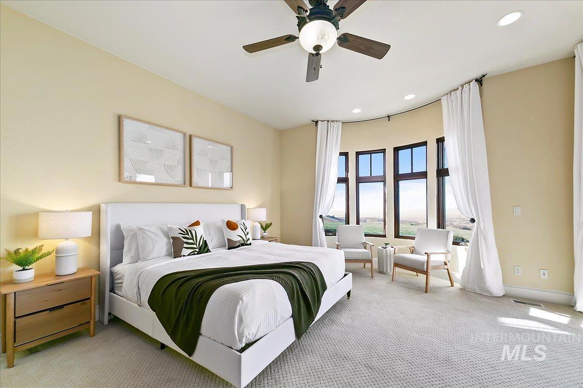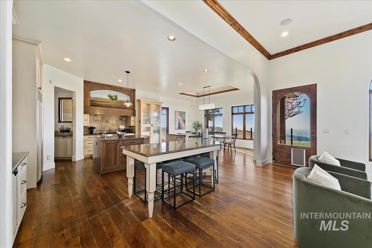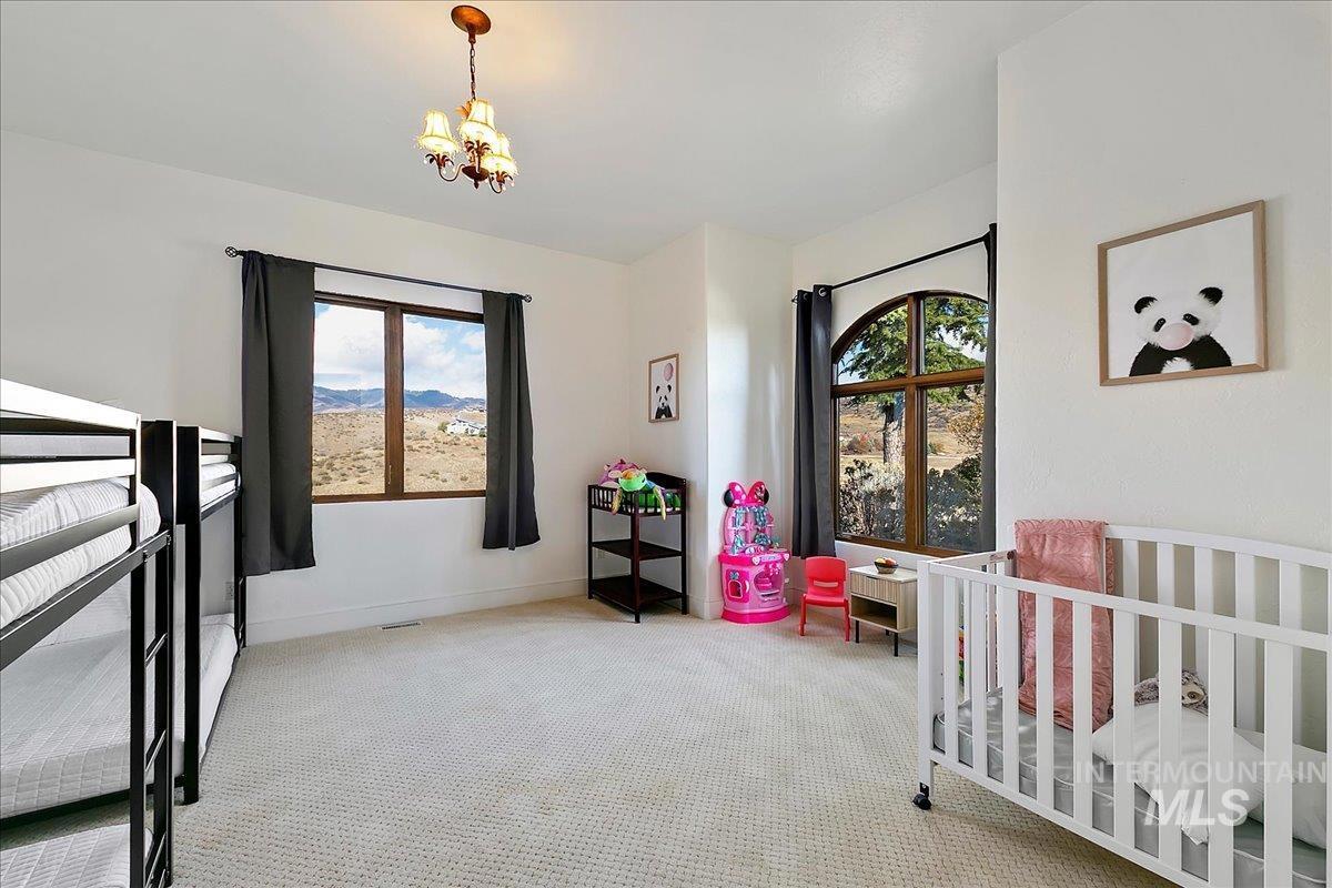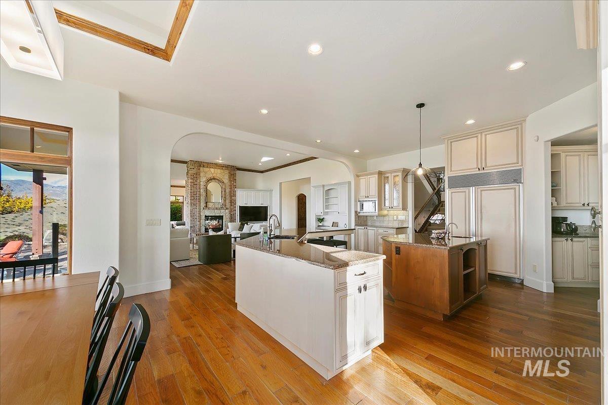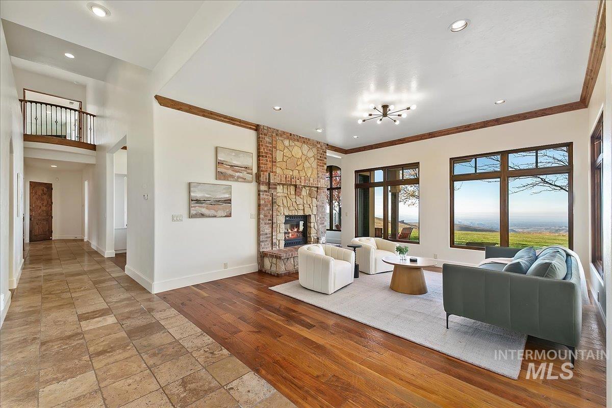Drink in peace & serenity: breathtaking sunsets and 360° views of rolling hillsides and city lights from this 1-of-a-kind luxury home. Comfortably nestled on 4 acres, next door to trails, ~10 mins from downtown Boise, and situated within the coveted gated community of Wildhorse Ranch. This home is a perfect blend of functionality and aesthetics! Custom-built to connect the interior with landscape views throughout. Versatile floorplan, warm & inviting, with fine craftsmanship and multiple living, work, & play areas. Main level owner’s suite w/adjacent Jr. suite. Great room w/adjacent parlor, 1st-class office, state-of-the-art indoor basketball/racquetball court, spacious upstairs family room, & a bonus room w/walk-out balcony. Well-designed stylish gourmet kitchen w/veggie washing station, dbl islands for expansive prep & serving space, built-in buffet, breakfast bar, custom cabinetry, & serving pantry. Search home address in browser to view drone & video tour!