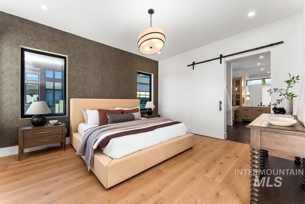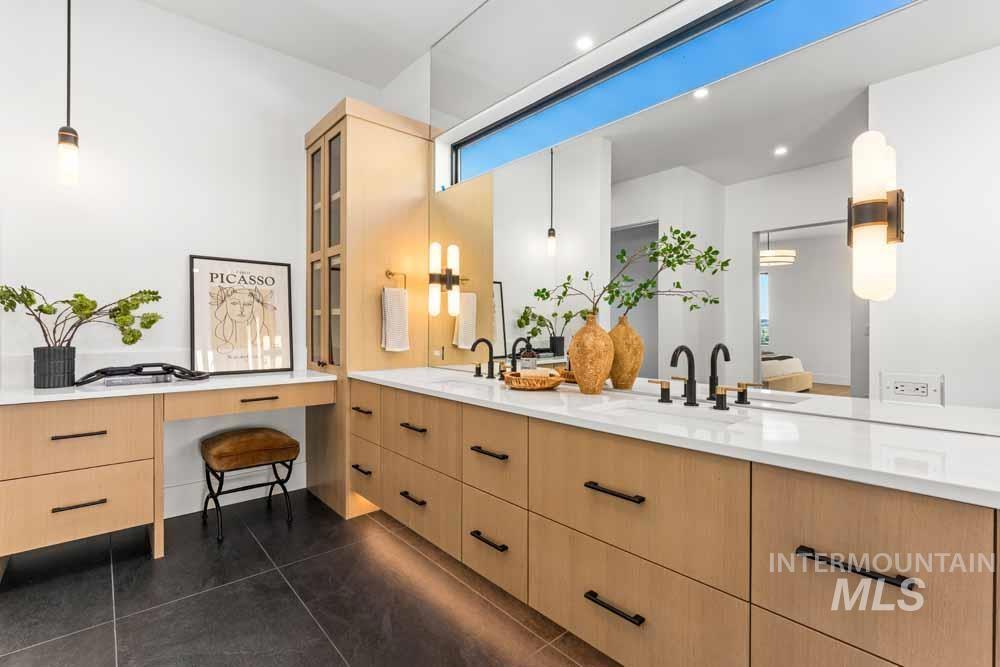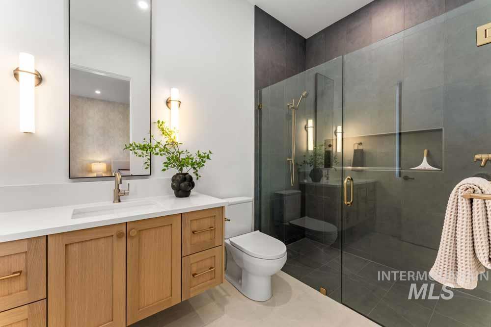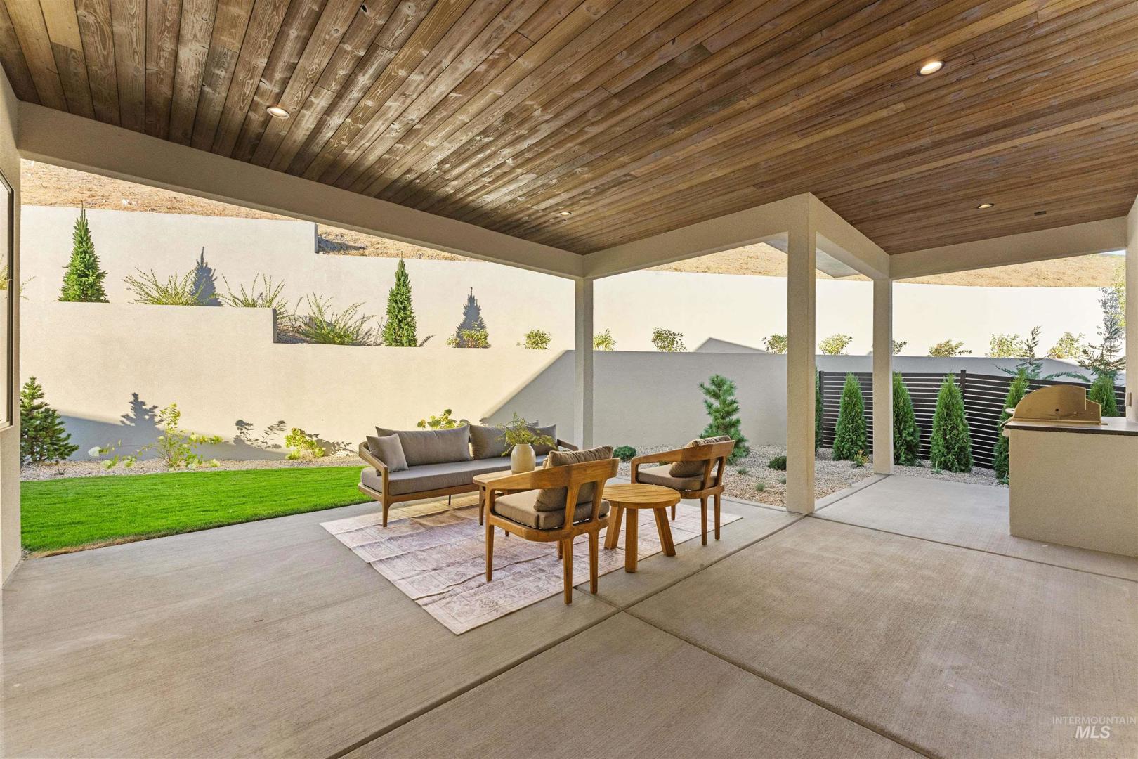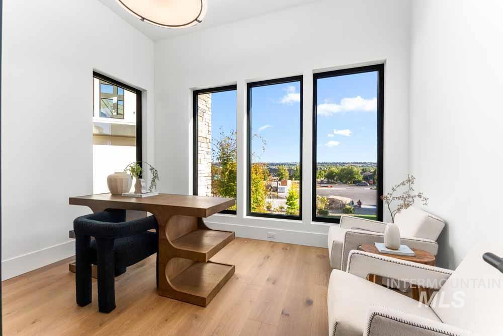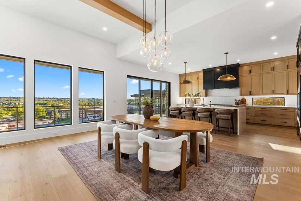 Striking modern architecture, brought to life by Teal Point Custom Homes. Set against the foothills with expansive valley views, every detail surpasses the standard of new construction. Inside, warm white oak flooring and smooth hand-plastered walls provide a sophisticated canvas for designer lighting & curated finishes. The showpiece kitchen is centered around a waterfall-edge marble island, complemented by two-toned cabinetry, stainless steel appliances, & paneled full-size refrigerator, freezer, & wine cooler. Retreat to the primary suite, where a spa-like bathroom awaits with dual vanities, a freestanding tub with a privacy wall, an oversized shower, & direct access to a private patio. True to Teal Point’s signature style, each bedroom includes its own en suite. Entertainment and work needs are met with a private home theater and a dedicated office. The sprawling outdoor covered living room is complete with a built-in kitchen for exceptional entertaining. Set in SE Boise just minutes from downtown Boise!
