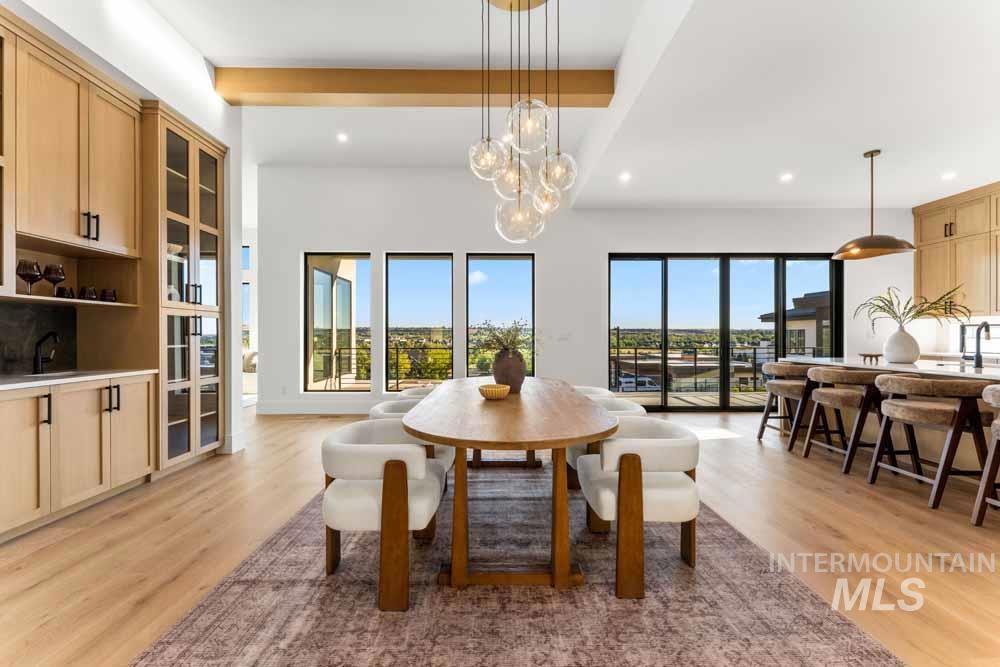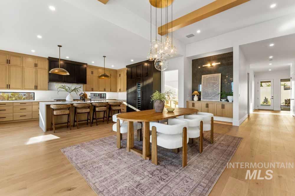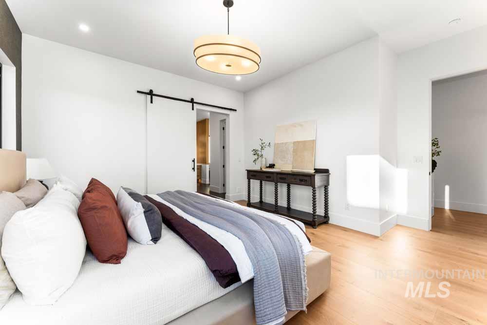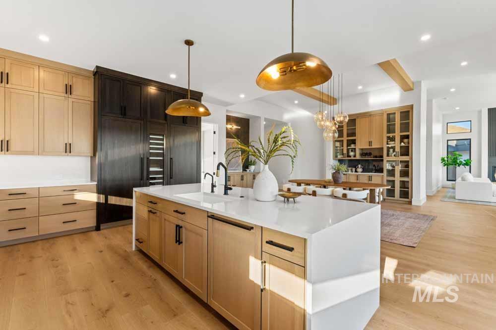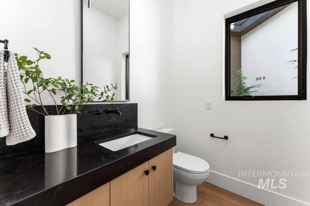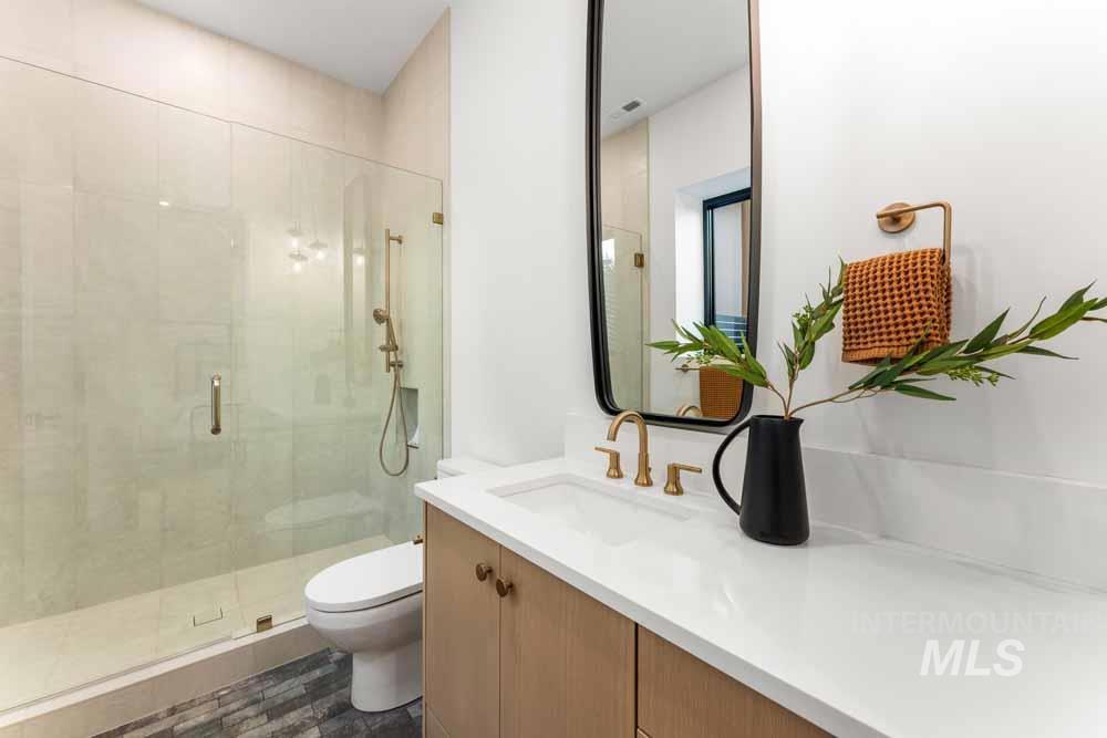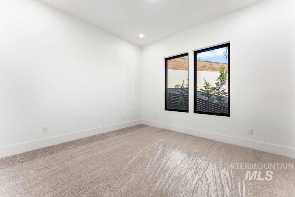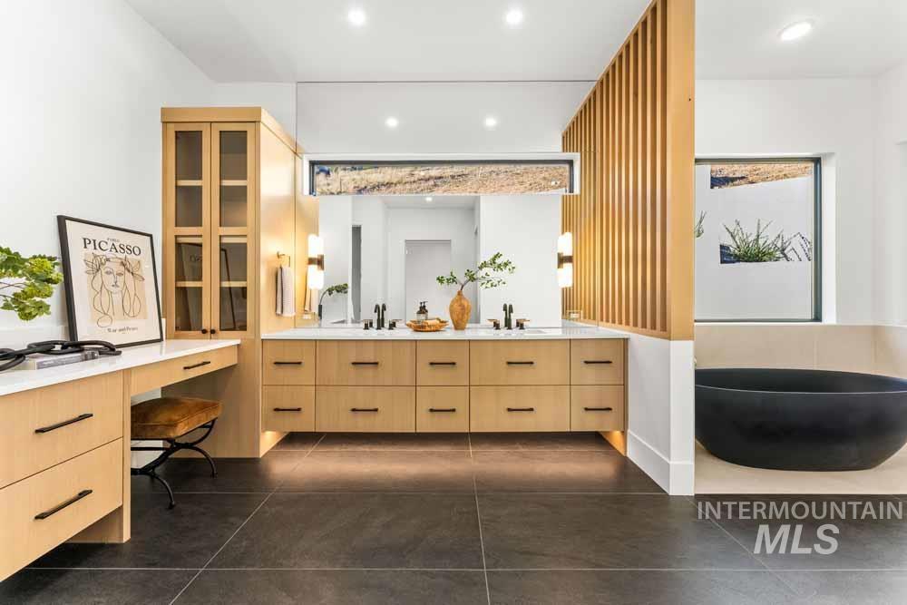 Striking modern architecture, brought to life by Teal Point Custom Homes. Set against the foothills with expansive valley views, every detail surpasses the standard of new construction. Inside, warm white oak flooring and smooth hand-plastered walls provide a sophisticated canvas for designer lighting & curated finishes. The showpiece kitchen is centered around a waterfall-edge marble island, complemented by two-toned cabinetry, stainless steel appliances, & paneled full-size refrigerator, freezer, & wine cooler. Retreat to the primary suite, where a spa-like bathroom awaits with dual vanities, a freestanding tub with a privacy wall, an oversized shower, & direct access to a private patio. True to Teal Point’s signature style, each bedroom includes its own en suite. Entertainment and work needs are met with a private home theater and a dedicated office. The sprawling outdoor covered living room is complete with a built-in kitchen for exceptional entertaining. Set in SE Boise just minutes from downtown Boise!