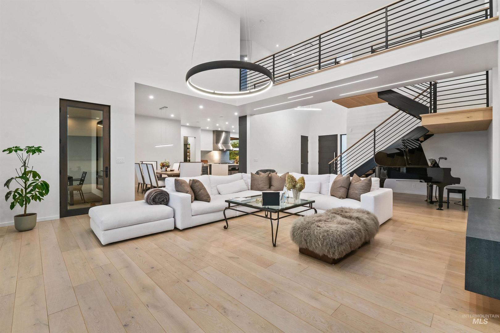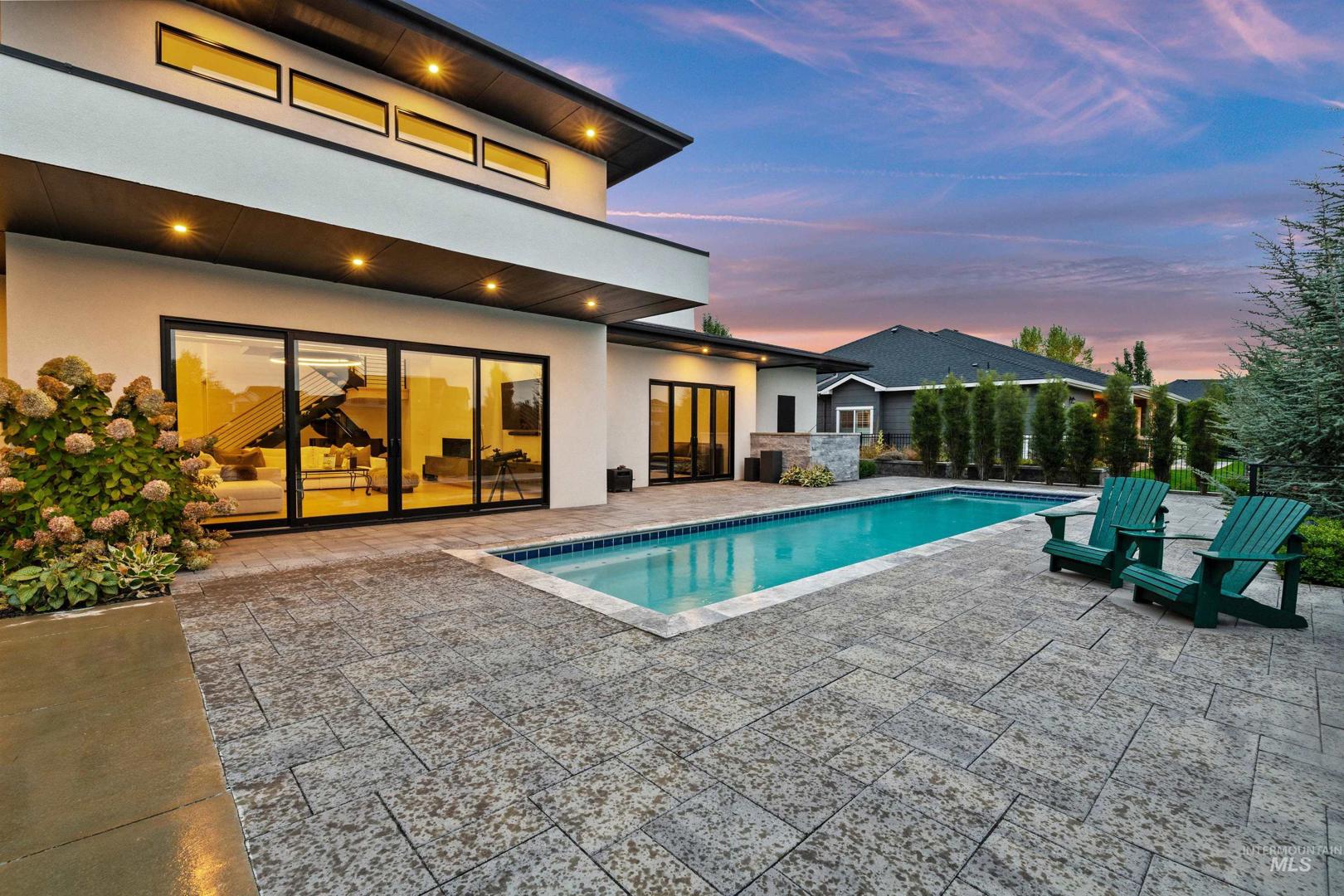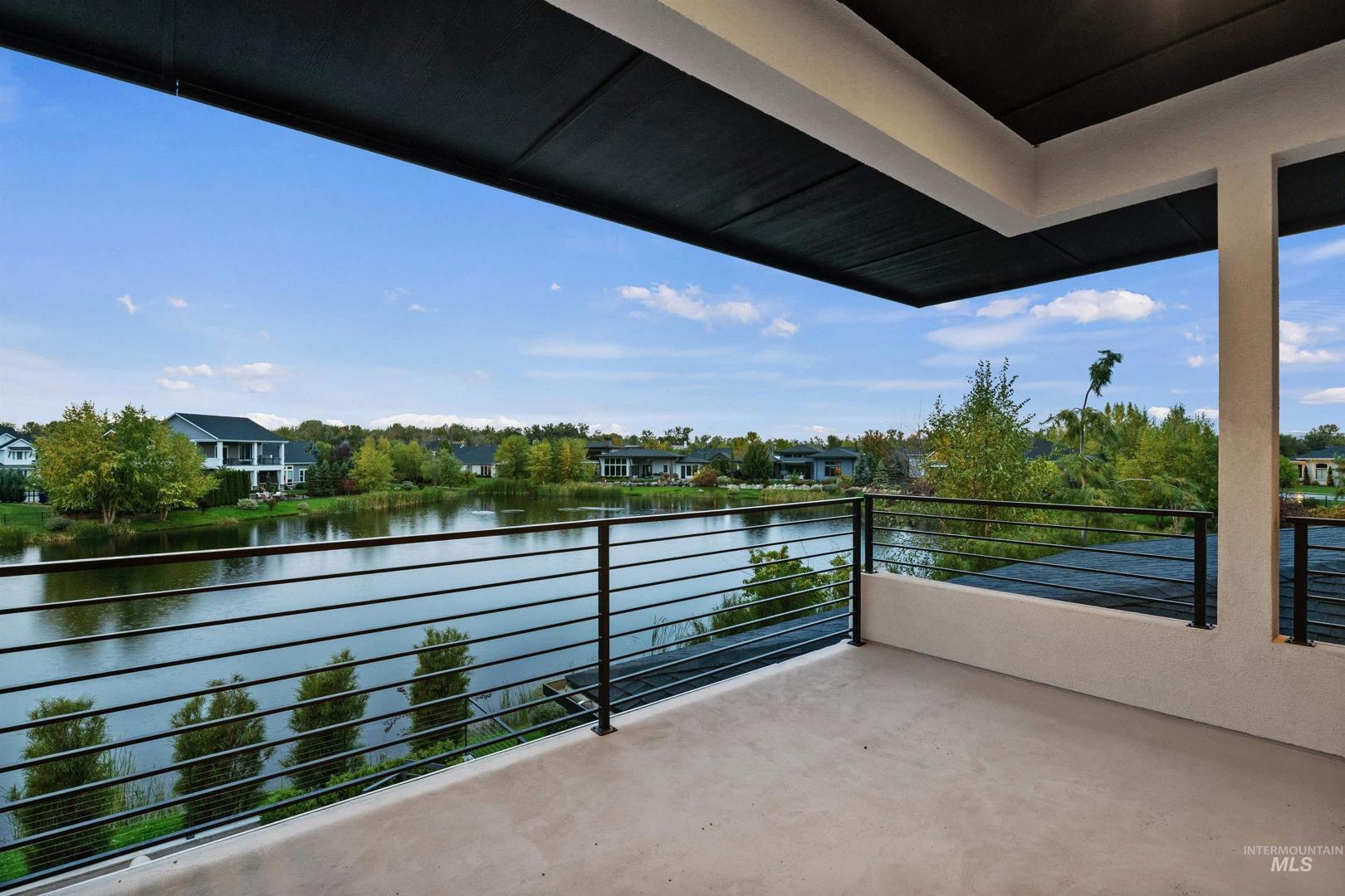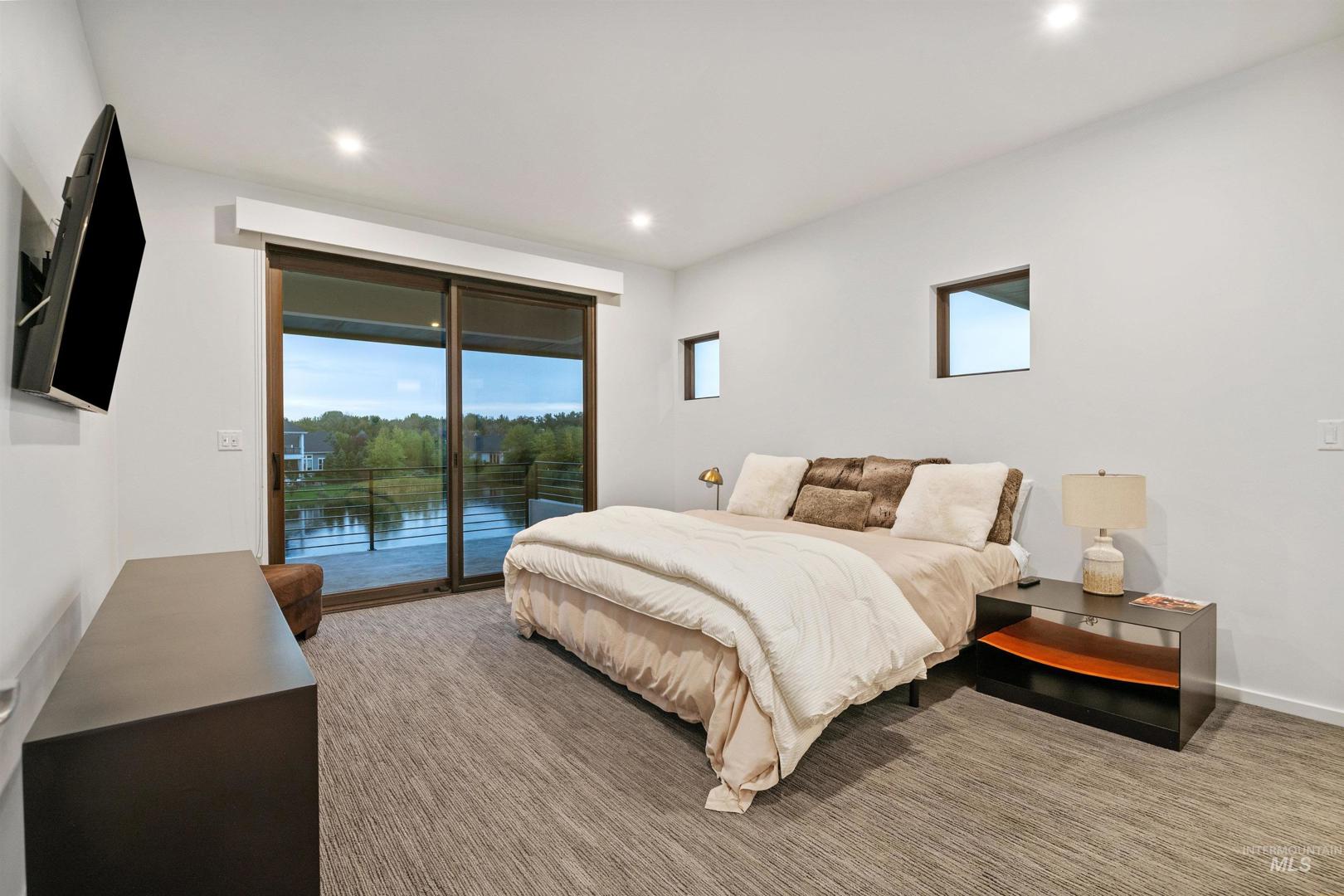 Set on a peaceful lake in the gated section of Mace River Ranch along the Boise River, this modern architectural masterpiece captures the essence of refined waterfront living. Clean lines, warm textures, and expansive glass frame mountain and water views from every angle. The great room is the heart of the home—soaring ceilings, a floating staircase, and seamless indoor/outdoor flow create an atmosphere of calm sophistication. Designed for connection, the living spaces open to a private outdoor retreat with heated saltwater pool, paver terrace, and multiple areas to relax or entertain. The chef’s kitchen combines form and function with custom cabinetry, statement lighting, and a generous island perfect for gatherings. Two main-level suites offer comfort and privacy, while the upper level provides flexible spaces for work, guests, theatre room, and workout areas. Theatre room is the 4th bedroom. Every finish, every line, every view reflects an uncompromising attention to detail. This is lakefront living—modern, effortless, and breathtaking.