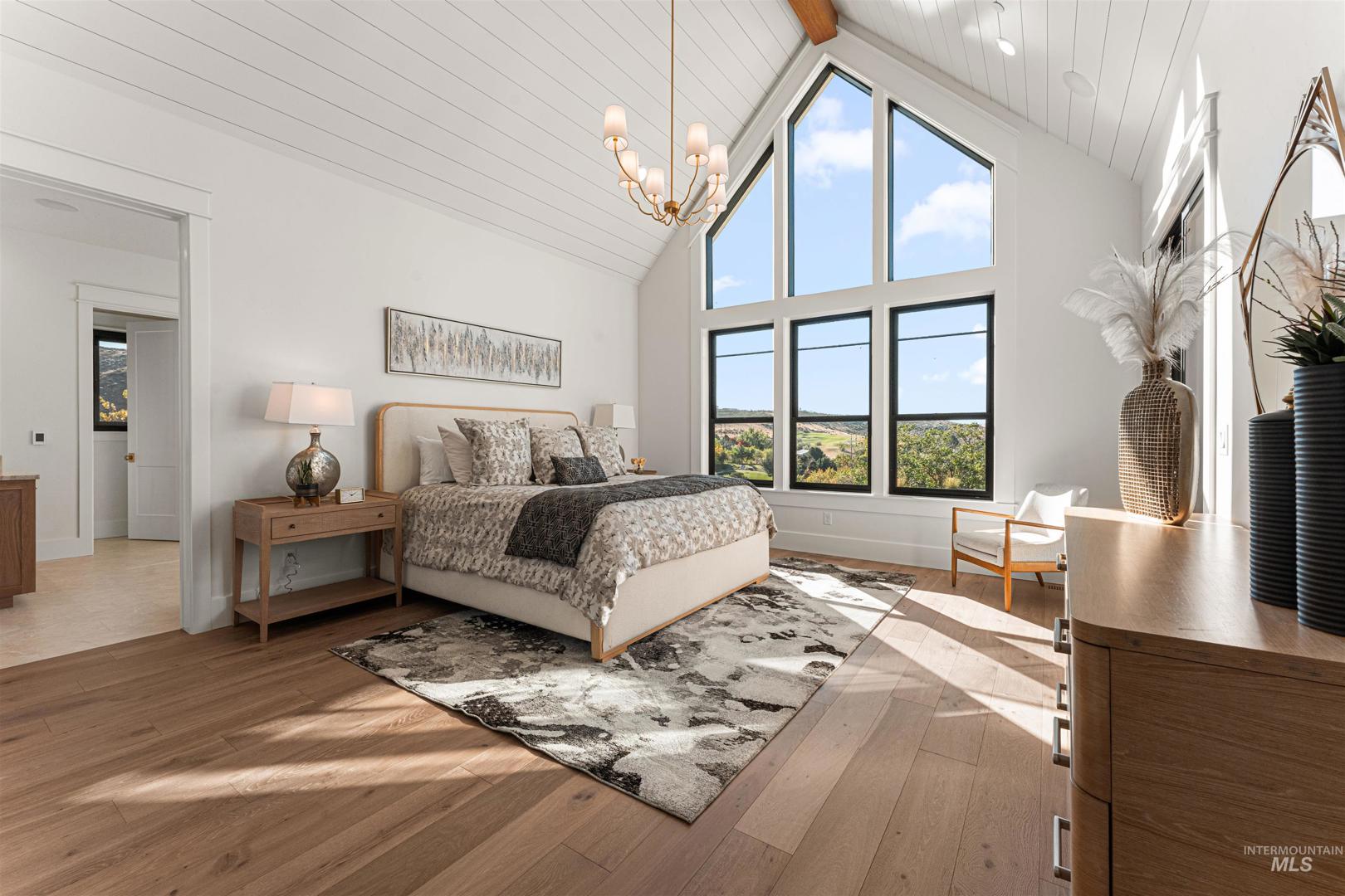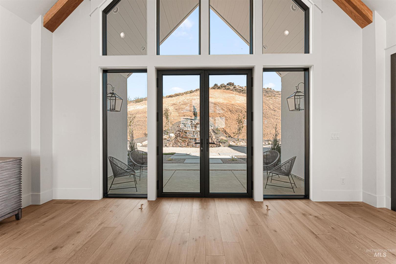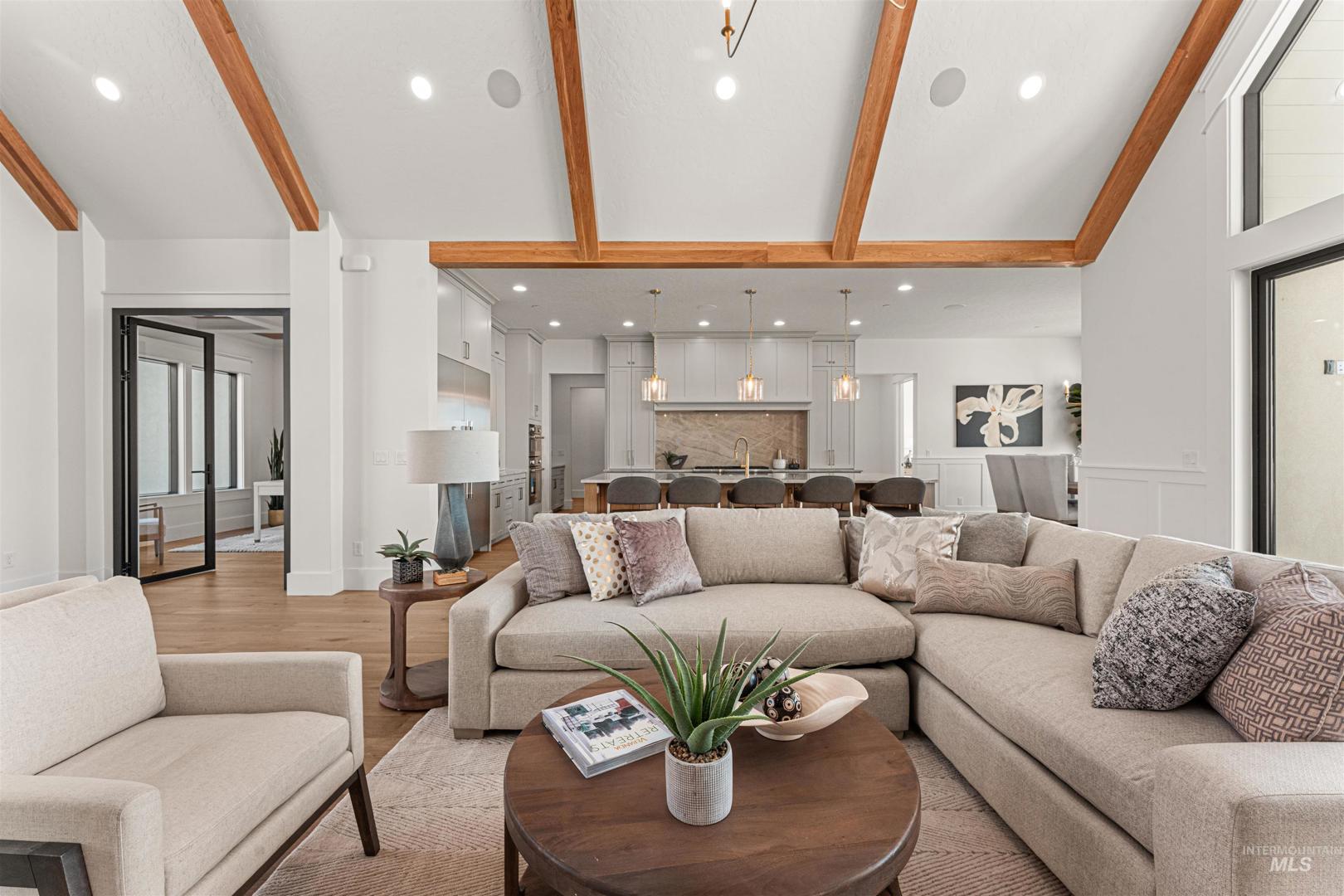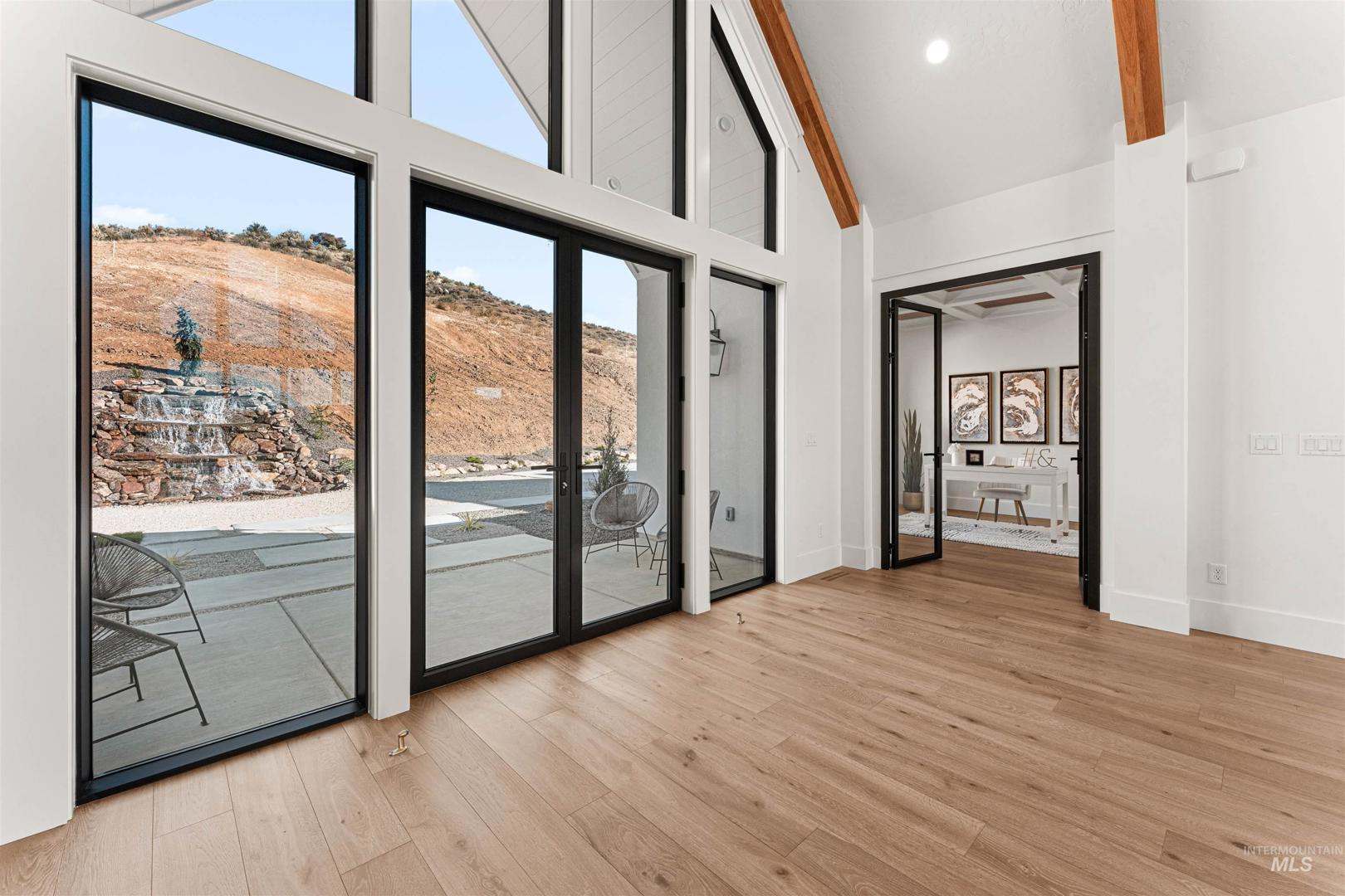 Acreage. Privacy. Views that linger. Welcome to a design-forward, new construction Eagle estate set on 10 private acres with a front-row panorama of the foothills and Shadow Valley Golf course. Inside, glass and light lead the way: a wall of bifold doors opens the great room to an elevated entertaining patio, framing sunrise coffees and sunset horizons. The chef’s kitchen anchors the home with a statement island of Taj Mahal granite, Thermador appliances, hidden/working pantry options, and bespoke lighting; the sleek linear fireplace and white oak floors add quiet luxury. The primary suite is a retreat—serene bedroom, spa-caliber bath (dual vanities, generous shower), and custom-ready closets. A true multi-gen/guest suite offers independence and comfort for long stays. Flexible spaces accommodate office, game, or fitness needs. Purpose-built for Idaho living, the property pairs acreage freedom with modern resilience: EV-charger, Generac generator, premium window package, efficient mechanicals, and a heated 2-car garage/RV bay for toys and travel. Thoughtful drive/parking and gear-friendly storage make weekend adventures effortless. Within reach of Eagle/Boise, beyond the everyday-open the doors and let the cinematic views set the scene.