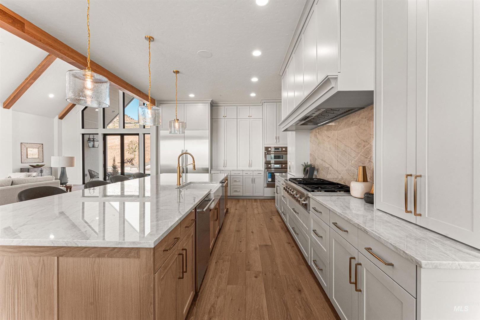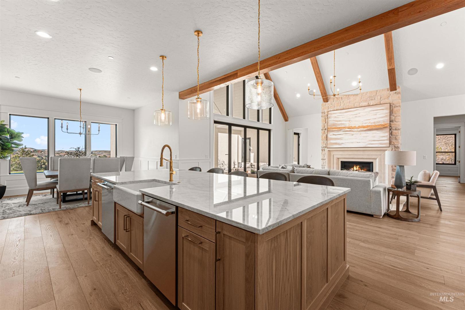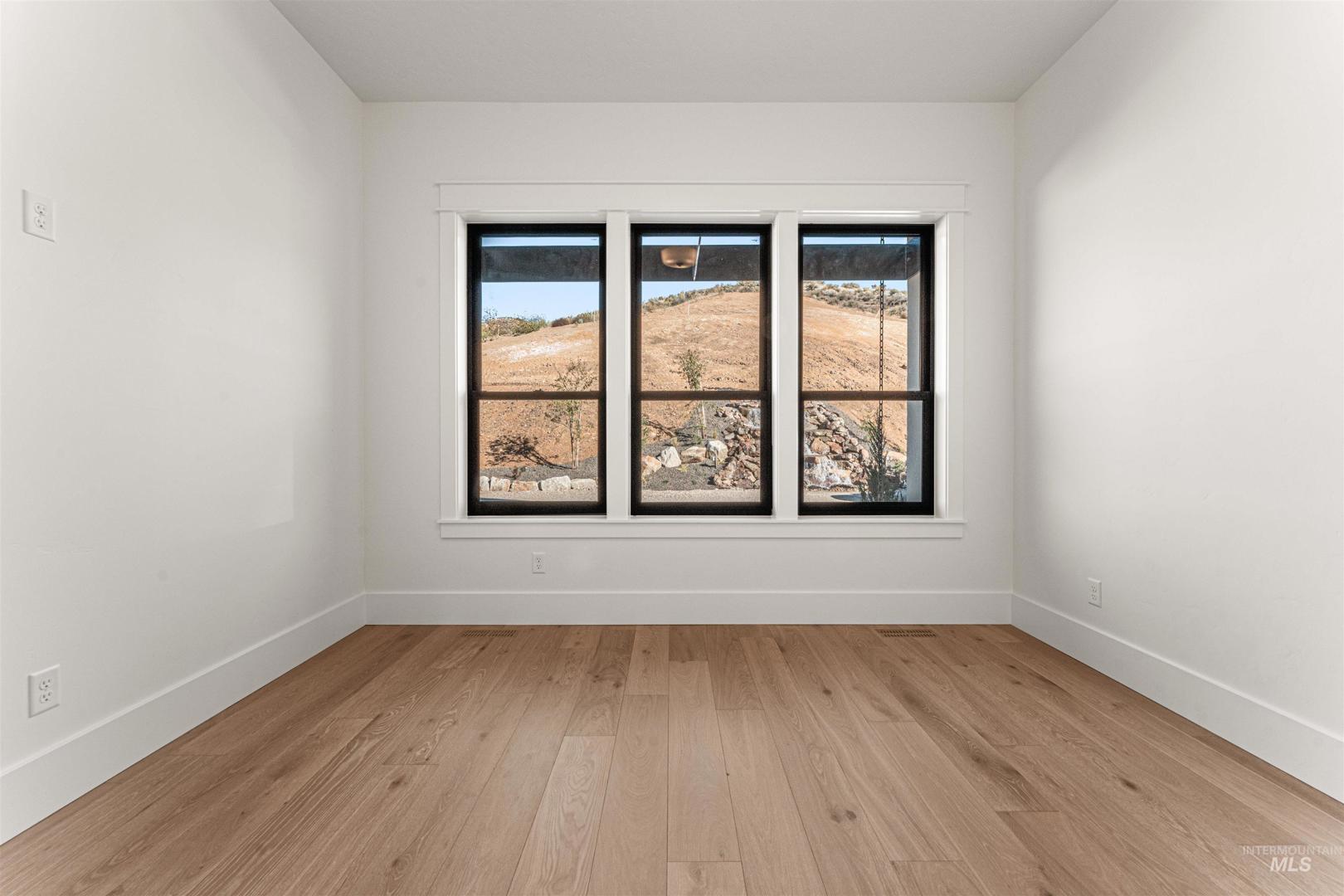 Acreage. Privacy. Views that linger. Welcome to a design-forward, new construction Eagle estate set on 10 private acres with a front-row panorama of the foothills and Shadow Valley Golf course. Inside, glass and light lead the way: a wall of bifold doors opens the great room to an elevated entertaining patio, framing sunrise coffees and sunset horizons. The chef’s kitchen anchors the home with a statement island of Taj Mahal granite, Thermador appliances, hidden/working pantry options, and bespoke lighting; the sleek linear fireplace and white oak floors add quiet luxury. The primary suite is a retreat—serene bedroom, spa-caliber bath (dual vanities, generous shower), and custom-ready closets. A true multi-gen/guest suite offers independence and comfort for long stays. Flexible spaces accommodate office, game, or fitness needs. Purpose-built for Idaho living, the property pairs acreage freedom with modern resilience: EV-charger, Generac generator, premium window package, efficient mechanicals, and a heated 2-car garage/RV bay for toys and travel. Thoughtful drive/parking and gear-friendly storage make weekend adventures effortless. Within reach of Eagle/Boise, beyond the everyday-open the doors and let the cinematic views set the scene.