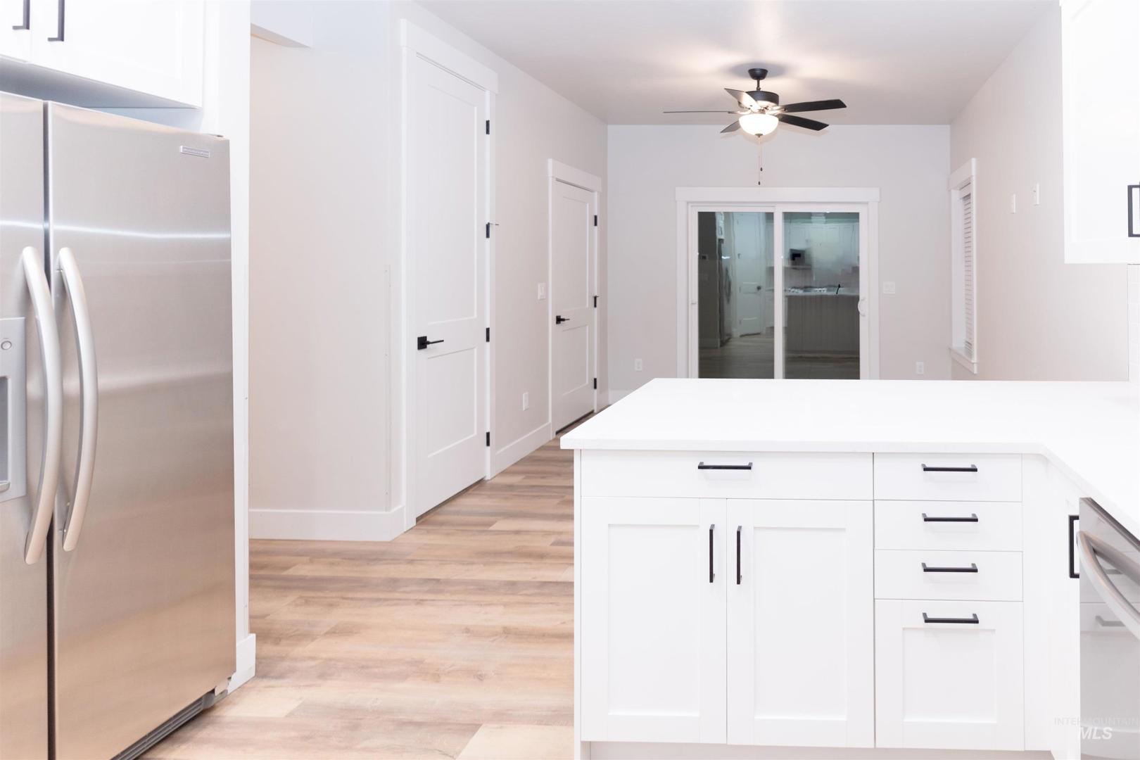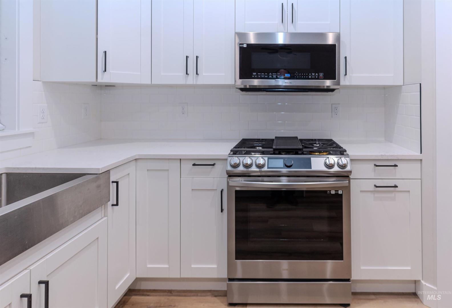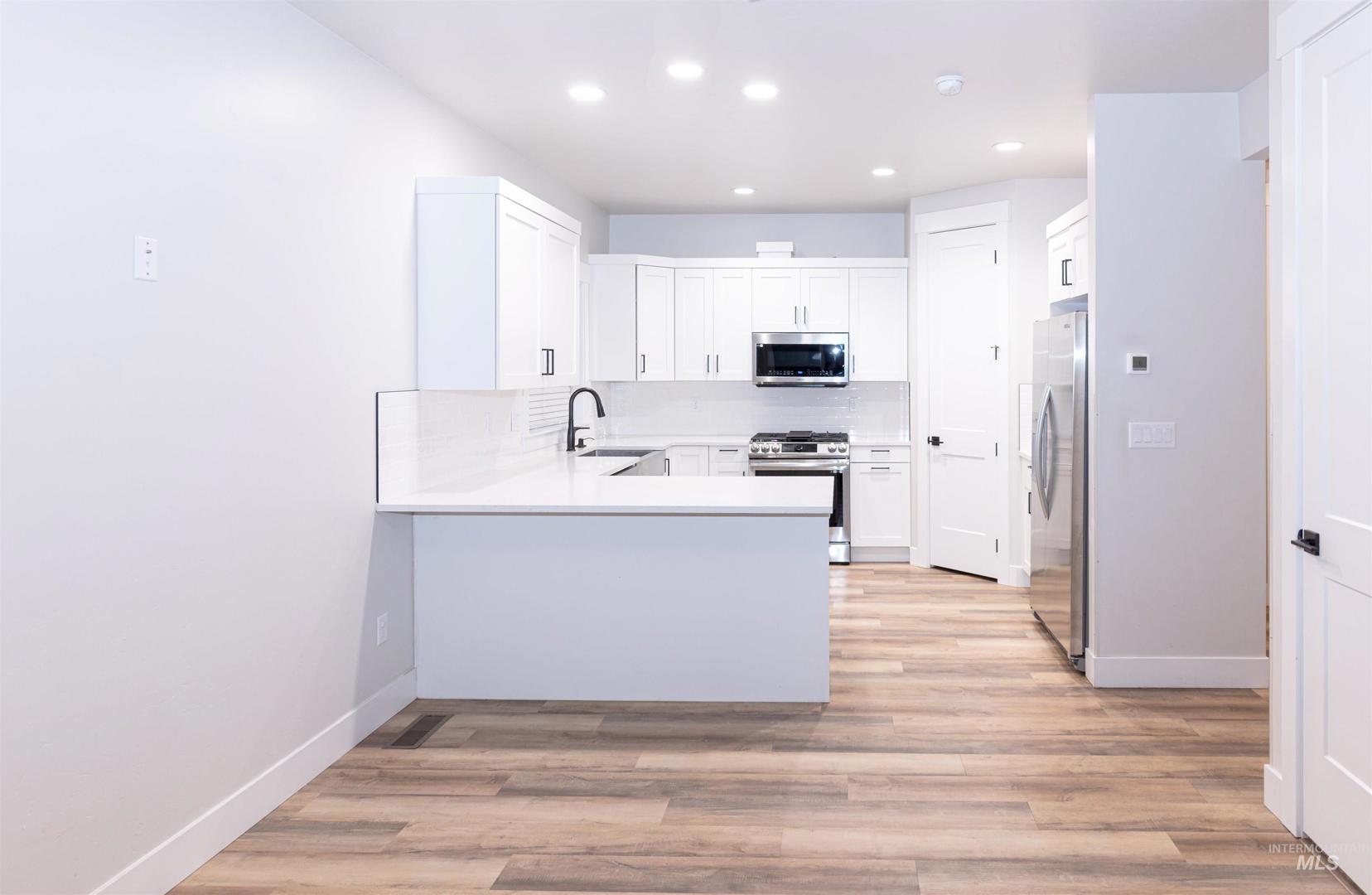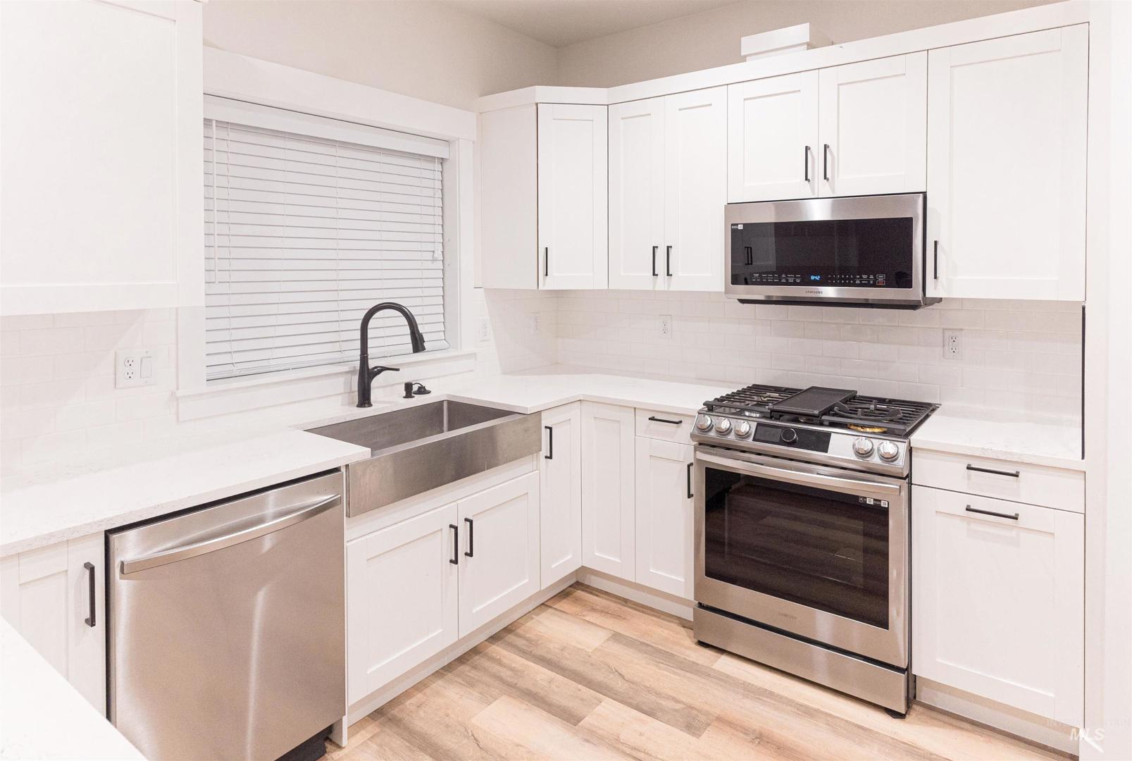 Discover the charm & comfort of this like-new, full of upgrades, 3 BD 2.5 BA home, where timeless character meets modern convenience & No HOA`s. Built by local Idaho Builder, Bear Homes! The Kitchen boasts quartz countertops, custom soft-close cabinetry, full tile backsplash, gas range, high-end stainless steel appliances, & a lg. Pantry! Beautiful LVP flooring throughout the main level, with high ceilings & upgraded trim. Upstairs Master BD features a coffered ceiling & spacious walk-in closet. Master BA has dual vanities, quartz countertops, & a floor to ceiling tiled shower. The second level also has nice 2nd & 3rd BDs with a large Utility RM with a folding counter. Dual Zone AC & Premium 2-inch Blinds. This attractive home includes full vinyl fencing, professional landscaping, & a covered Patio with outdoor fan. 2-car garage. Come check out the quality of this move-in ready standout! You won`t be disappointed! Excellent, private location!