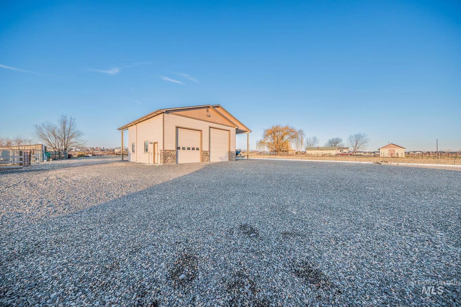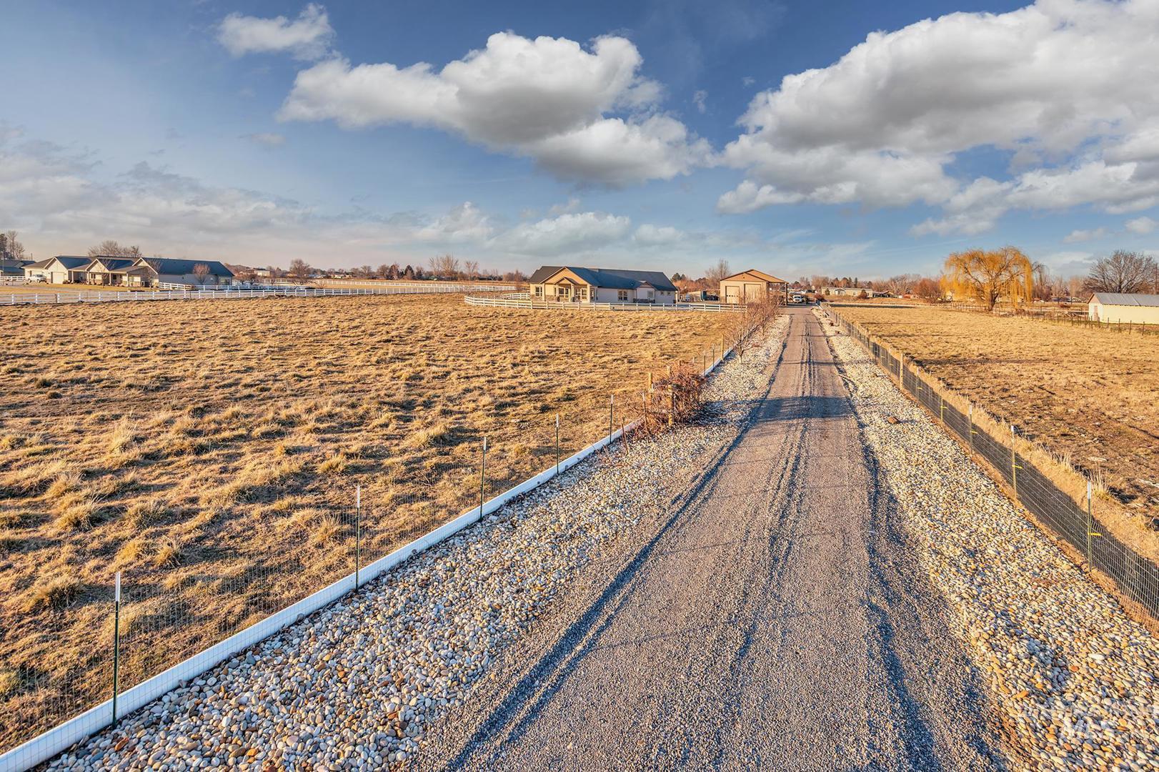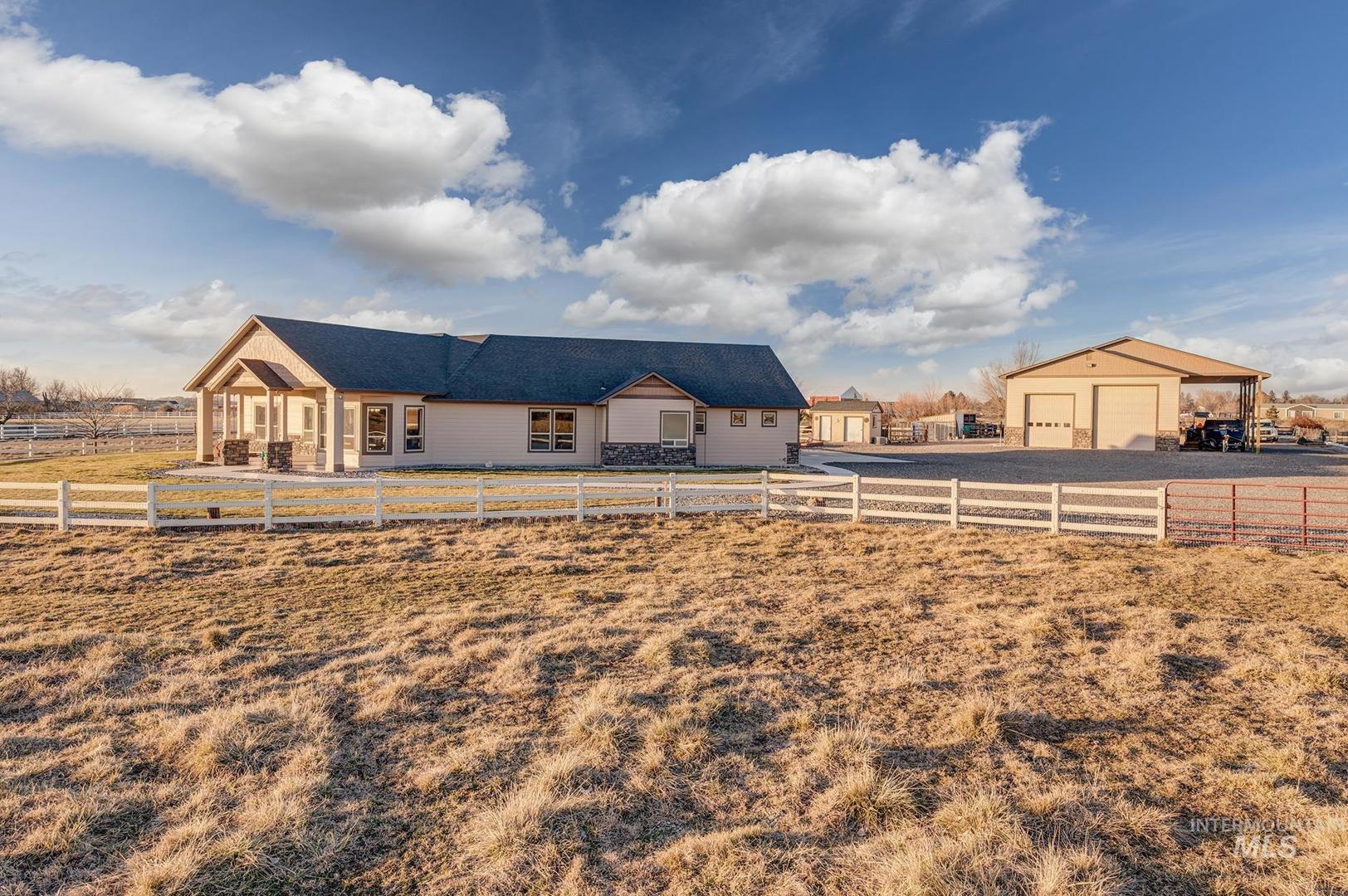 This stunning, custom single-level home and shop are situated on 5.01 acres down a private lane, offering a quiet country setting with the convenience of being close to town. This 2,352 sq ft, open-concept home, features 4 bedrooms, 2.5 baths, and no HOA. The interior boasts exquisite finish work with fully cased windows and gorgeous LVP flooring throughout. The kitchen is a chef’s dream, complete with custom cabinets, a double oven cooktop, two pantries, and a large Caesarstone island with bar seating. The expansive primary suite includes a deep walk-in closet, oversized walk-in tile shower, and an extra-large vanity. The home is also equipped with a whole-house water filtration system, a water softener, a plumbed central vacuum system, and a spacious laundry room with a sink. The exterior features large covered patios, low-maintenance landscaping, and wonderful views. In addition to the attached oversized 3 car garage with a half bath, the property includes a detached 34x36 heated and cooled shop with drive thru garage doors and a lean-to that provides a total of 48x48 feet of covered space. Additional amenities include RV hookup, a 8x10 garden shed, raised garden beds, and a 12x36 loafing shed. The property also features a fully fenced pasture with irrigation, gated pipe, and frost-free hydrants.