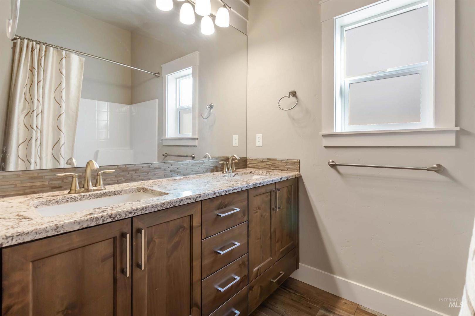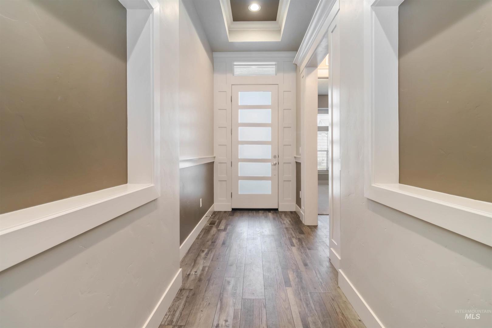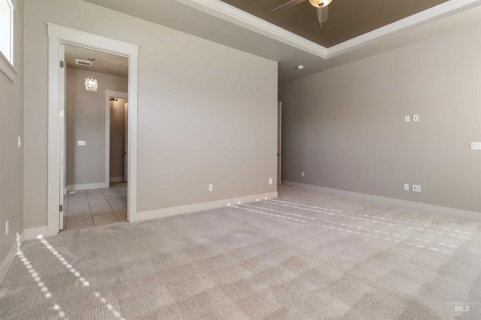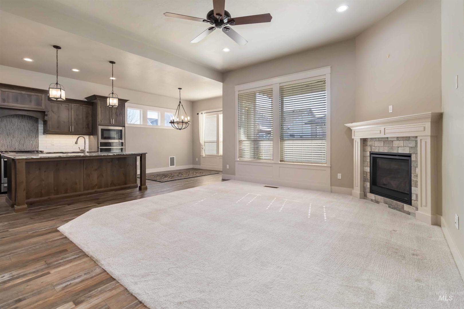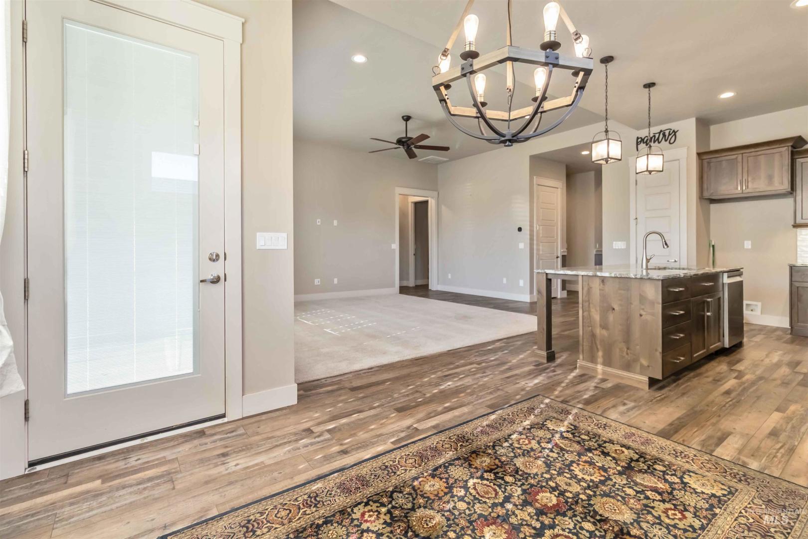 Vaulted ceilings and oversized windows create a bright, open atmosphere throughout the home, filling the space with natural light. Thoughtful construction includes a controlled crawlspace and ENERGY STAR efficiency, resulting in impressively low utility costs and year-round comfort. The kitchen is both functional and refined, featuring upscale cabinetry, stunning hard-surface countertops, luxury LVP flooring, and a layout well suited for everyday living or entertaining. The adjoining living area is warm and inviting, centered around a cozy gas fireplace that adds both comfort and character. The spacious primary suite offers a true retreat with a spa-like bathroom and an oversized walk-in closet. Each additional bedroom also includes its own walk-in closet, providing excellent storage and privacy throughout the home. Enjoy outdoor living on the covered back patio, ideal for relaxing or hosting guests. An oversized RV/5th-wheel garage and abundant storage add exceptional versatility. Residents also enjoy access to a private community pool and park. Conveniently located near shopping, golf courses, paddleboarding, fishing, and downtown Kuna, this home offers the feel of country living with easy access to modern amenities.