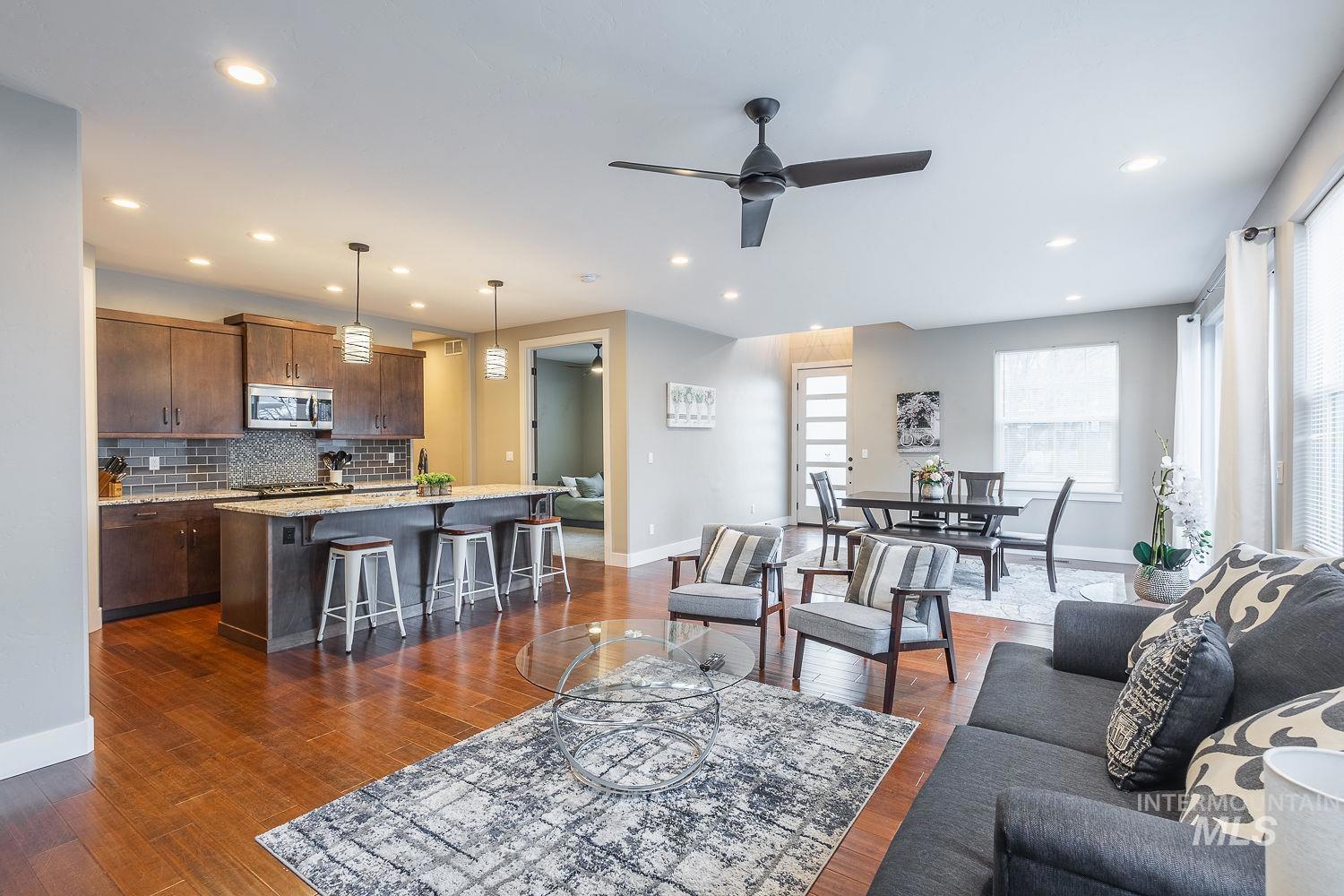 Located on the Boise River Greenbelt in the heart of Harris Ranch, this home offers rare, immediate access to miles of paths right out your door. Enjoy being just moments from the river, foothill trails, and the neighborhood’s beloved restaurants, coffee, and local gathering spots. This floor plan delivers an ideal blend of open living and privacy, with a bright great room flowing into the kitchen featuring granite counters, stainless appliances, gas range, pantry, and a central island, perfect for everyday life and entertaining alike. Engineered hardwood floors, abundant natural light, and a cozy fireplace add warmth and style. A main-level flexible room serves as an office or guest suite, while upstairs includes a spacious primary retreat with a huge walk-in closet and walk-in tile shower, plus a versatile loft bonus space, additional bedrooms, guest bath, and conveniently located laundry. Relax on the private patio and take in the peaceful setting that makes this location so special. A rare opportunity to live right on one of Boise’s most treasured outdoor corridors while still enjoying easy access to dining, recreation, and community amenities.