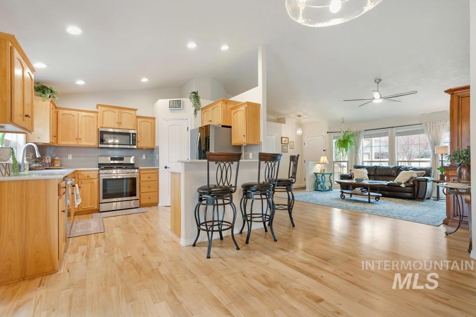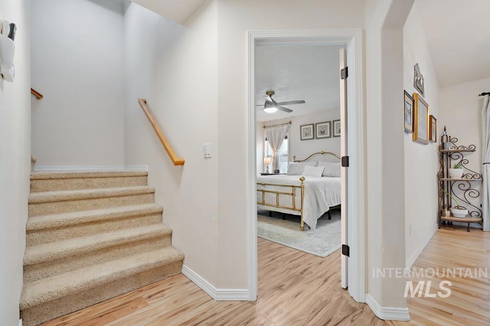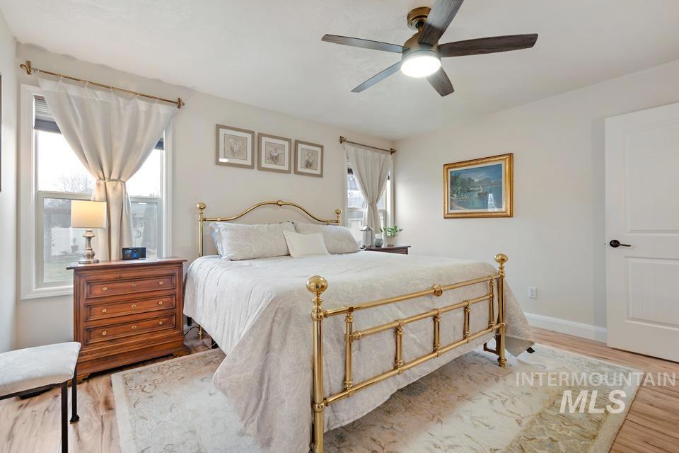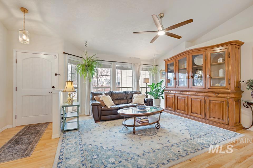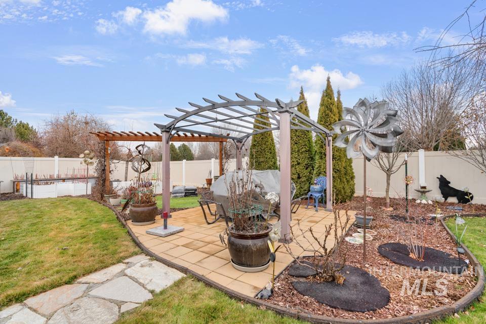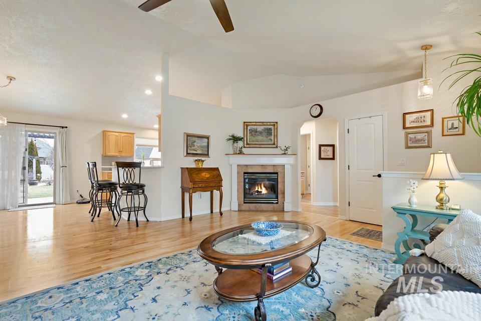 A fabulous opportunity for effortless living in a beautifully maintained, move-in-ready home in Northwest Meridian. Set in a charming and established neighborhood with tree-lined sidewalks, it`s easy to picture settling in and putting down roots here. Thoughtful updates, quality finishes, and a functional floor plan create a home of comfort & convenience at an attractive price point. Inside, an open and light filled living room offers plenty of space, real hardwood flooring, and is anchored by a cozy gas fireplace. The kitchen features stainless steel appliances, quartz countertops, hickory cabinets, bar seating, and a casual dining area that opens to the back patio for seamless indoor-outdoor flow. The main level primary suite includes dual vanities, accessible walk-in shower and an oversized walk in closet. The main level also includes 2 more bedrooms and a full bathroom. The second floor features a huge bonus room as well as a full bedroom and bathroom, offering plenty of space for family and company. The backyard is a dream with its raised garden boxes, gazebos, fruit trees and bushes, firepit area, and a large shed with power. With no rear neighbors, the backyard borders a peaceful walking path and neighborhood park, offering immediate access for morning walks or evening strolls. Conveniently located near Ten Mile Rd for shopping, dining, and The Village.