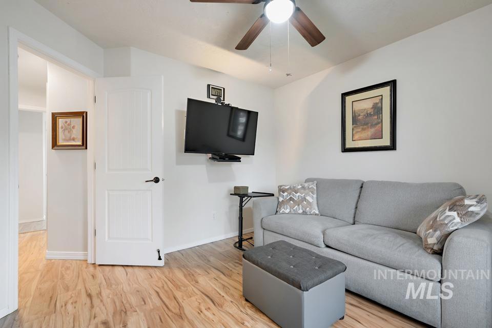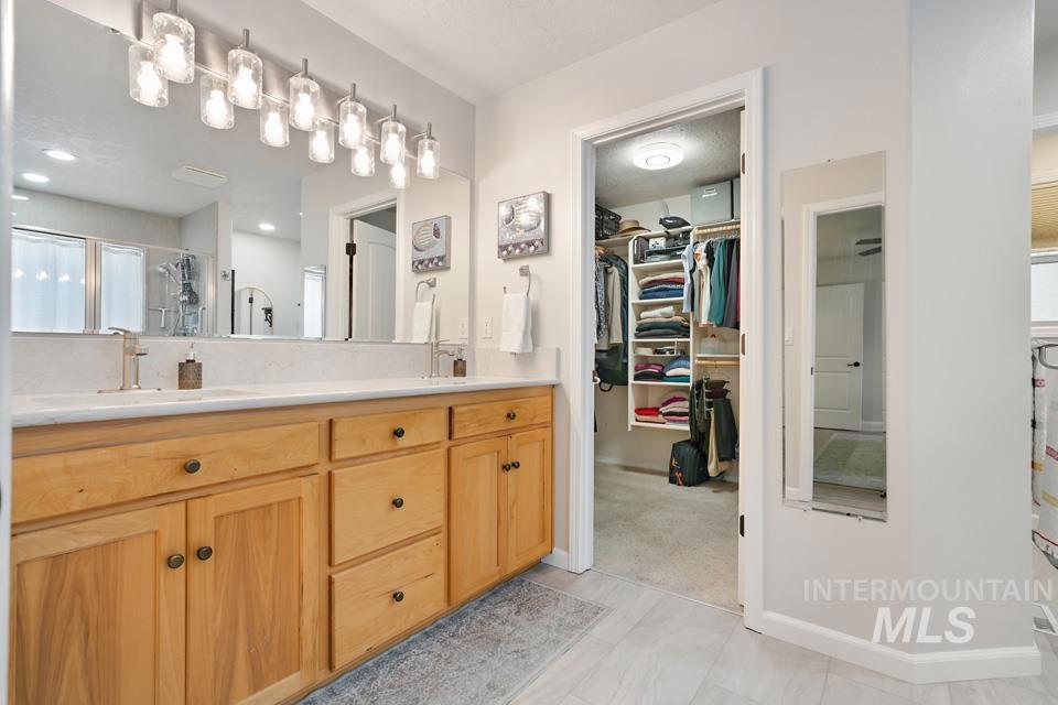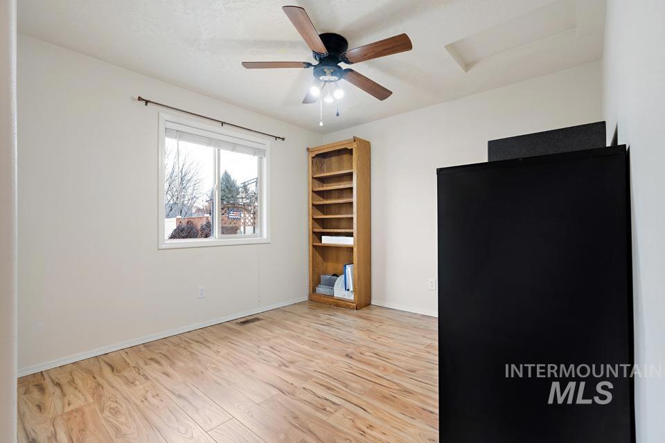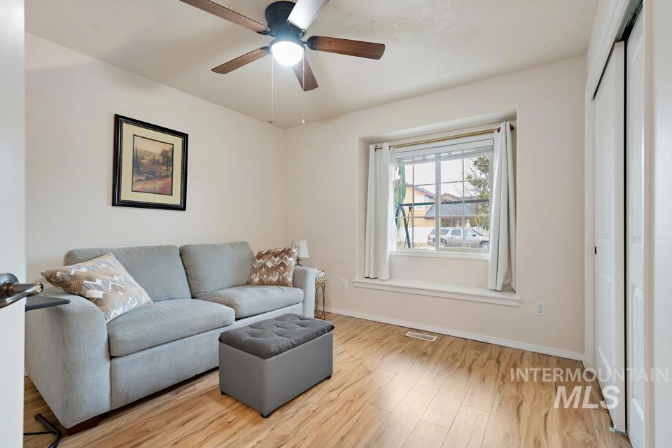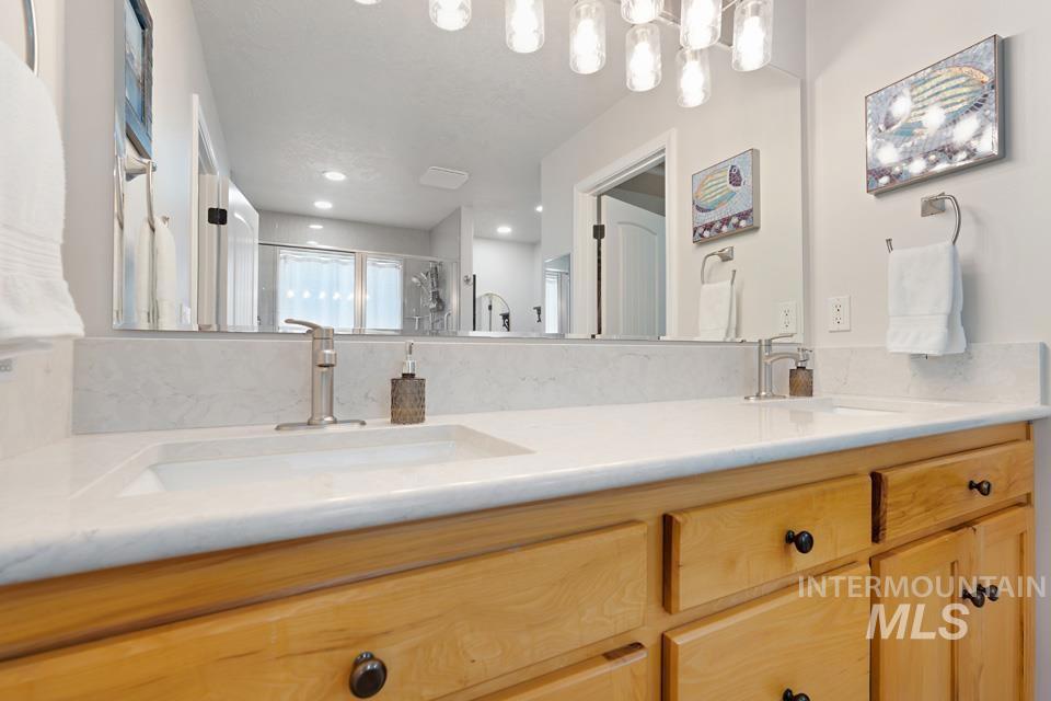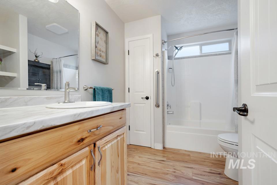 A fabulous opportunity for effortless living in a beautifully maintained, move-in-ready home in Northwest Meridian. Set in a charming and established neighborhood with tree-lined sidewalks, it`s easy to picture settling in and putting down roots here. Thoughtful updates, quality finishes, and a functional floor plan create a home of comfort & convenience at an attractive price point. Inside, an open and light filled living room offers plenty of space, real hardwood flooring, and is anchored by a cozy gas fireplace. The kitchen features stainless steel appliances, quartz countertops, hickory cabinets, bar seating, and a casual dining area that opens to the back patio for seamless indoor-outdoor flow. The main level primary suite includes dual vanities, accessible walk-in shower and an oversized walk in closet. The main level also includes 2 more bedrooms and a full bathroom. The second floor features a huge bonus room as well as a full bedroom and bathroom, offering plenty of space for family and company. The backyard is a dream with its raised garden boxes, gazebos, fruit trees and bushes, firepit area, and a large shed with power. With no rear neighbors, the backyard borders a peaceful walking path and neighborhood park, offering immediate access for morning walks or evening strolls. Conveniently located near Ten Mile Rd for shopping, dining, and The Village.