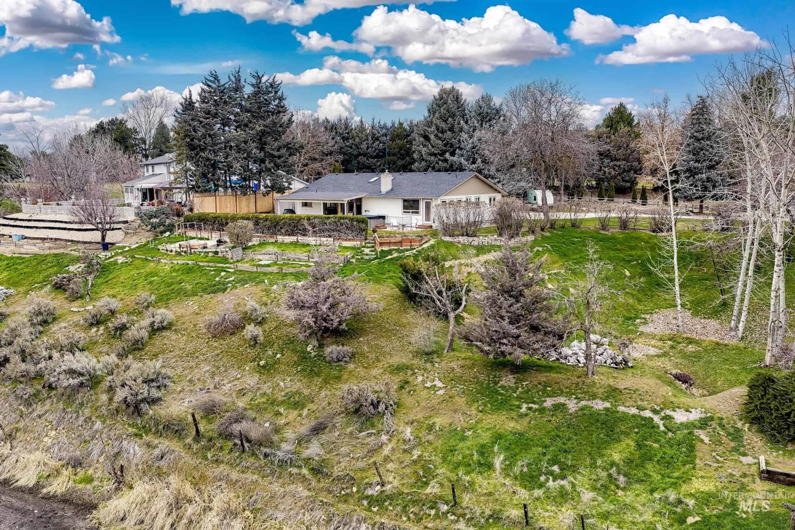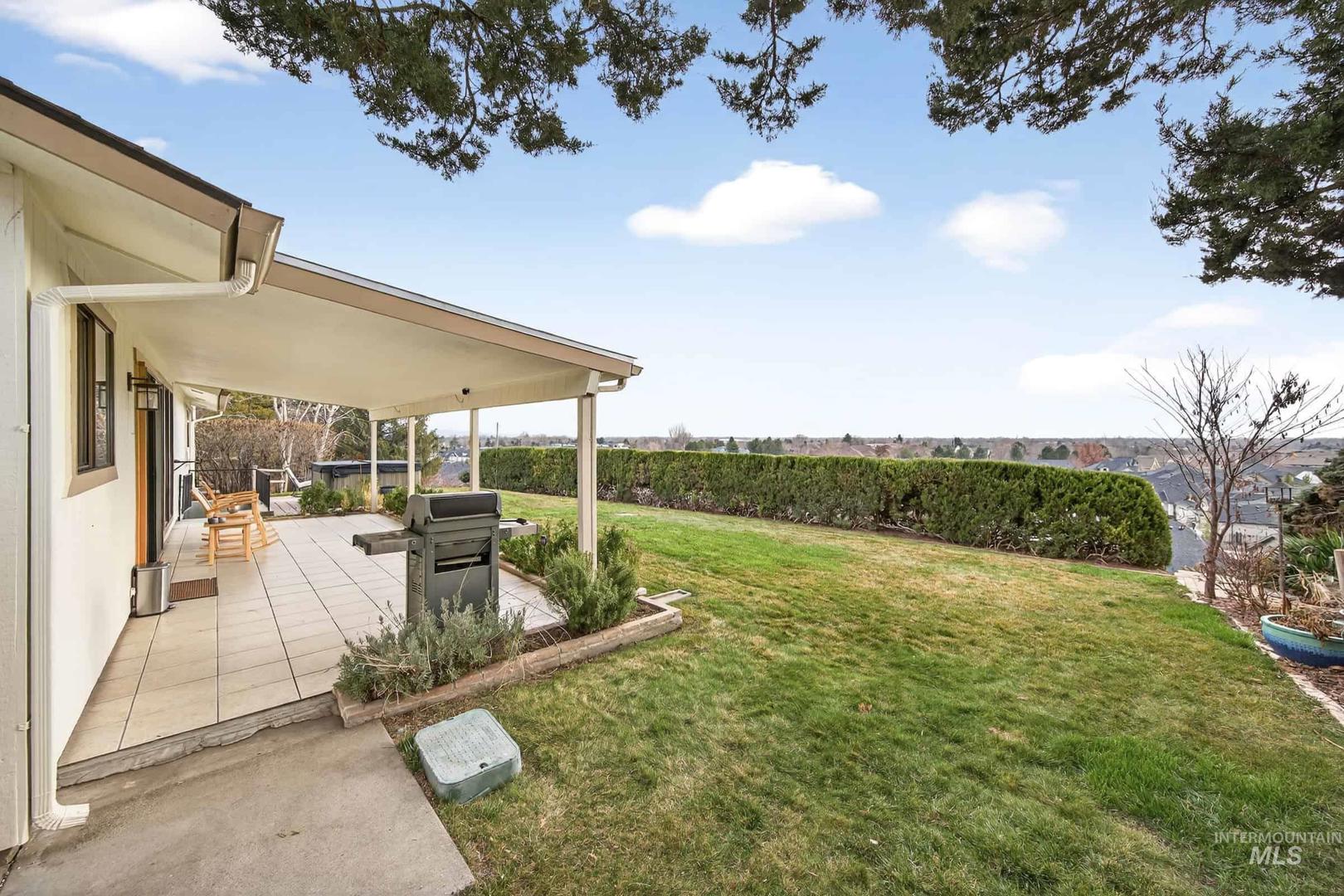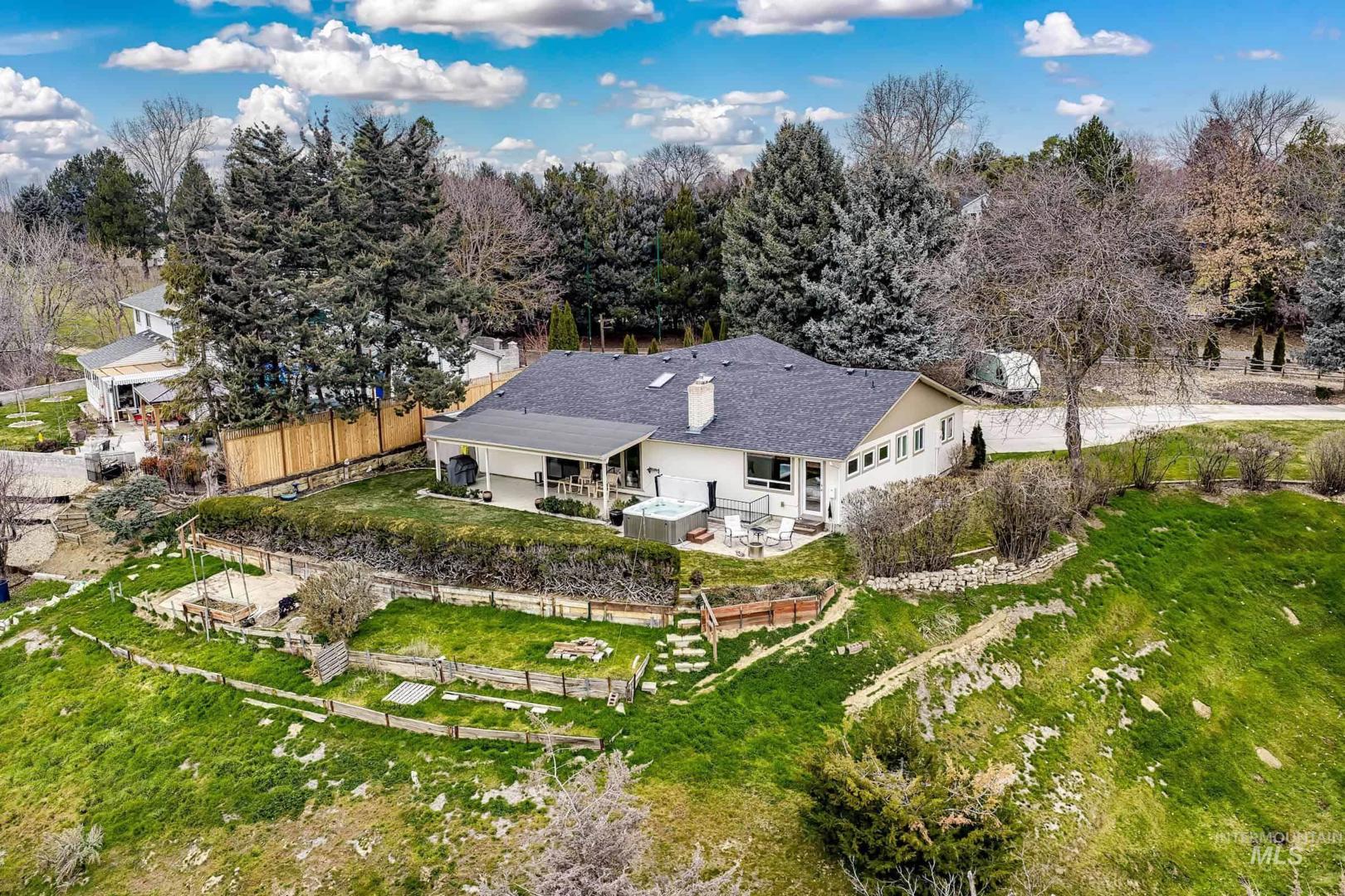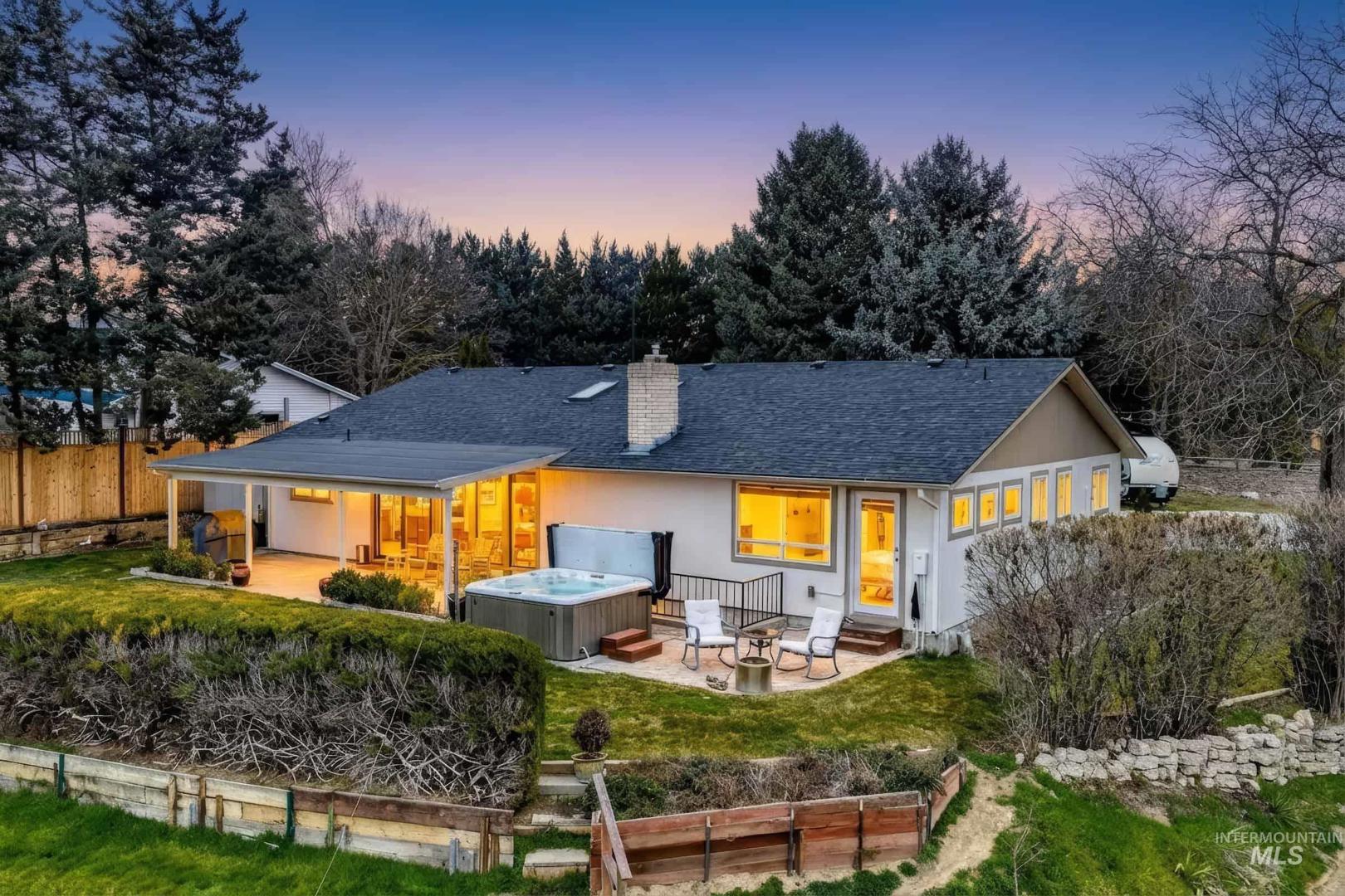 Escape to a private retreat perched above the valley in the timeless Eagle Hills golf course community. Nestled on a quiet Cul-d-sac, this residence enjoys ultimate privacy and a sense of seclusion that’s naturally provided from being set on your own enchanting hillside. The peaceful backyard oasis boasts unobstructed views of the Owyhee Mountains, gorgeous sunrise & sunset views, firework shows from all directions, a terraced vegetable garden, and a plethora of beautiful perennial flowers. The interior is designed to capture the scenery, featuring a highly functional layout where the great room, open kitchen, and dining areas seamlessly incorporate sweeping vistas into your daily living experience. This connection to the outdoors extends to the generous primary suite, a personal sanctuary complete with its own captivating views and direct patio access where a hot tub awaits to unwind. While still enjoying the benefits of a well kept neighborhood, this property offers no HOA dues or CC&Rs, granting you the freedom to utilize the RV parking and the expansive driveway. Exceptional utility is found in the OVERSIZED GARAGE plus a massive BASEMENT/STORAGE room below the home accessed from the backyard. Located minutes from the golf course, foothills and downtown Eagle, this is a unique opportunity to enjoy easy living and a quiet, view-inspired lifestyle.