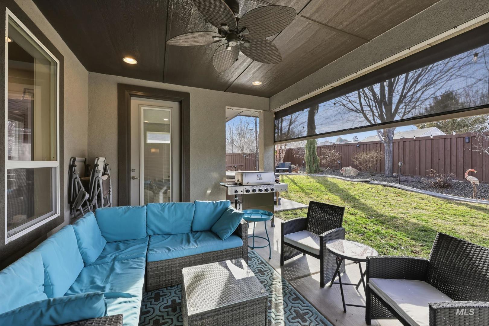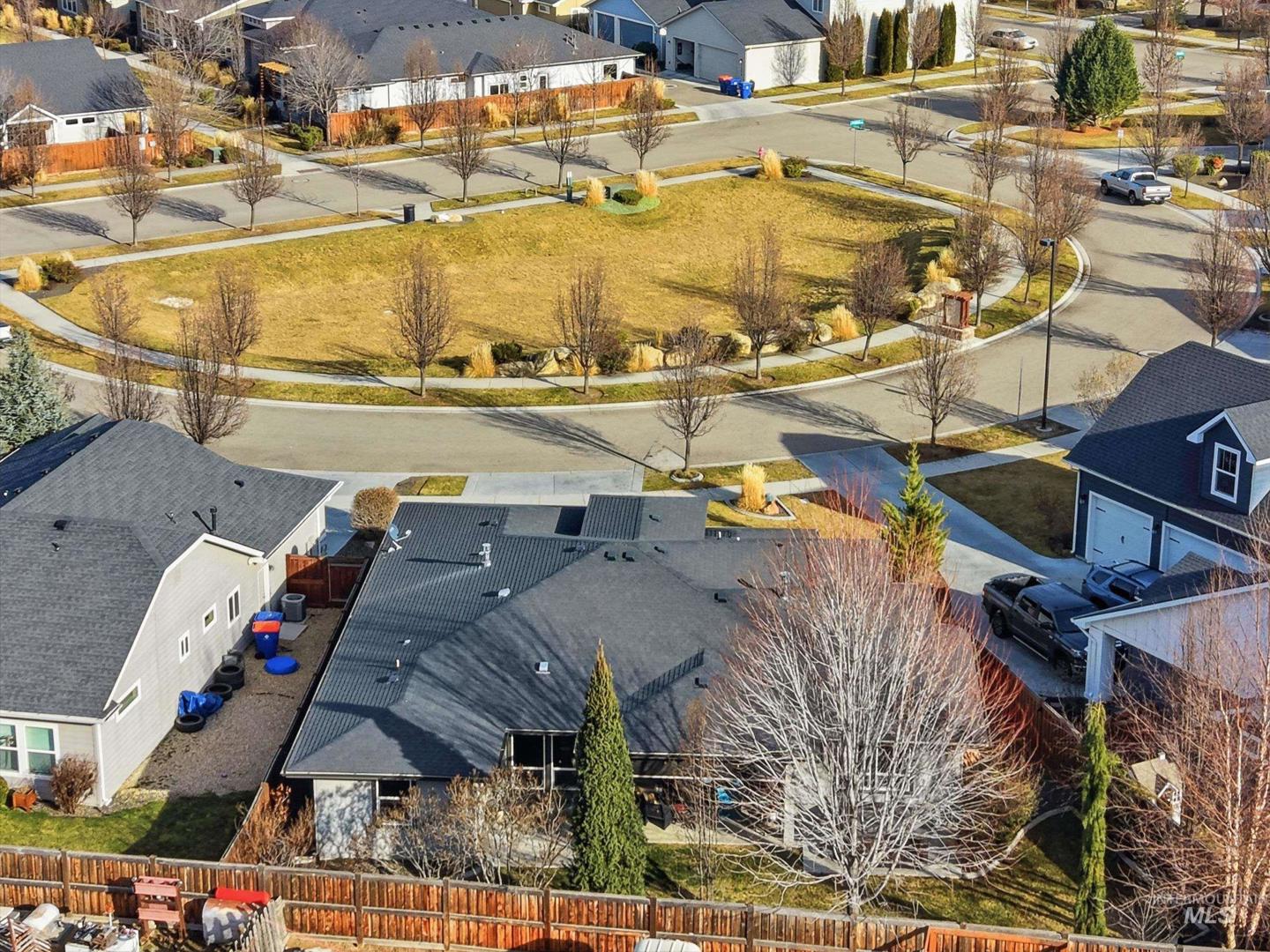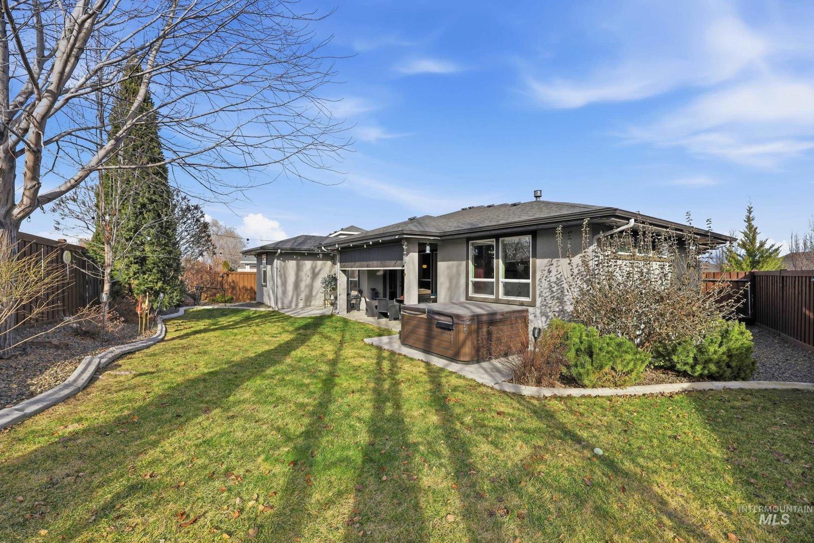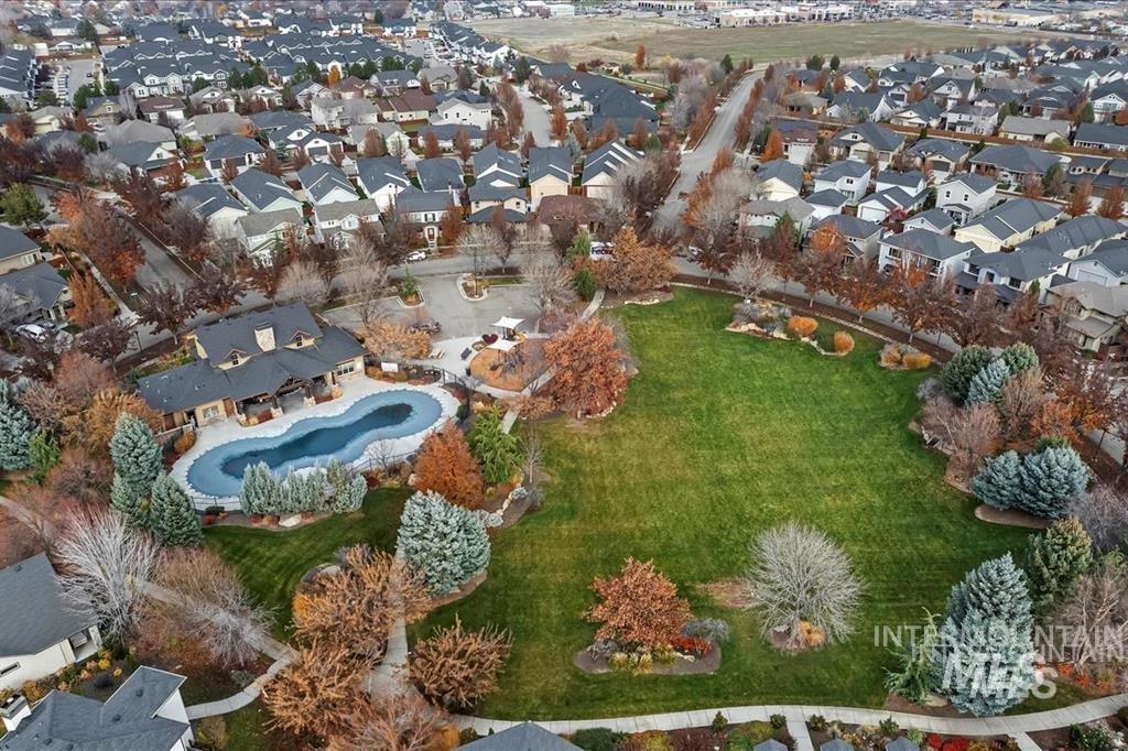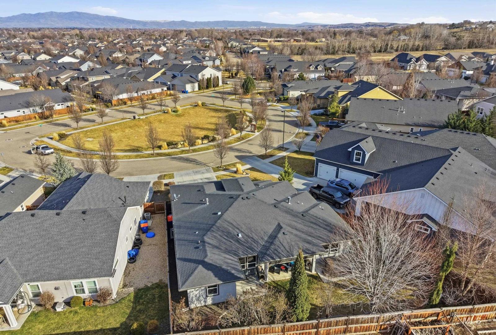 Custom-built single-level residence located in Hazelwood Village. This home offers 3 bedrooms, 2 bathrooms, and a spacious office. The open great room includes a gas fireplace with built-in cabinets. The kitchen features a breakfast bar, walk-in pantry with a wine and coffee bar. The spacious primary bdrm offers recessed lighting and has access to the covered patio. Ensuite includes a large closet and walk-in shower. The functional floor plan provides comfortable living and work-from-home flexibility. The covered patio opens to a private backyard which includes a custom sun screen, and a professionally installed mister system. The front of the home faces a park with mountain views, creating a welcoming and scenic setting. Perfect for relaxing or entertaining indoors and out. Home includes whole house water purifying system. The community includes two salt water pools, a clubhouse, scheduled concerts in the park, and weekly food truck events, dog park, and garden boxes. Conveniently located near shopping, dining, and recreation in **Boise**. Seller is an Idaho Licensed Real Estate Broker