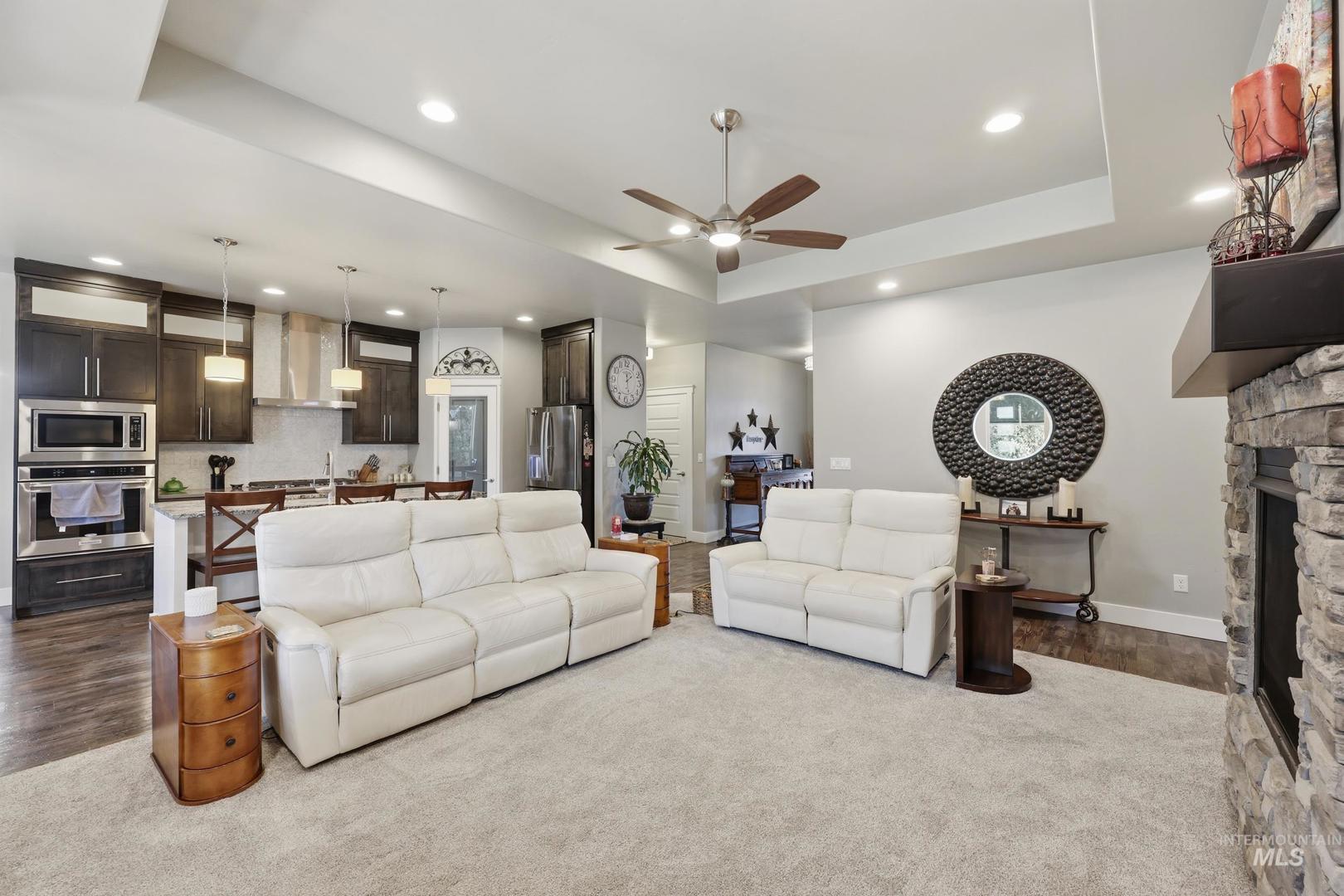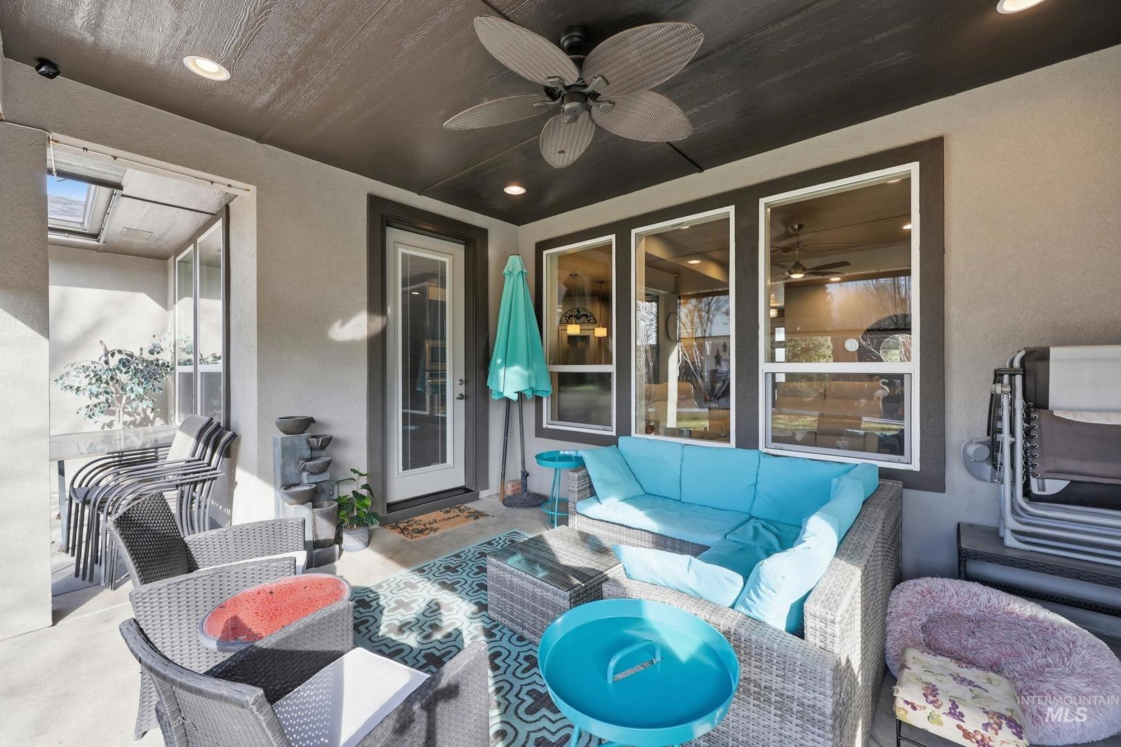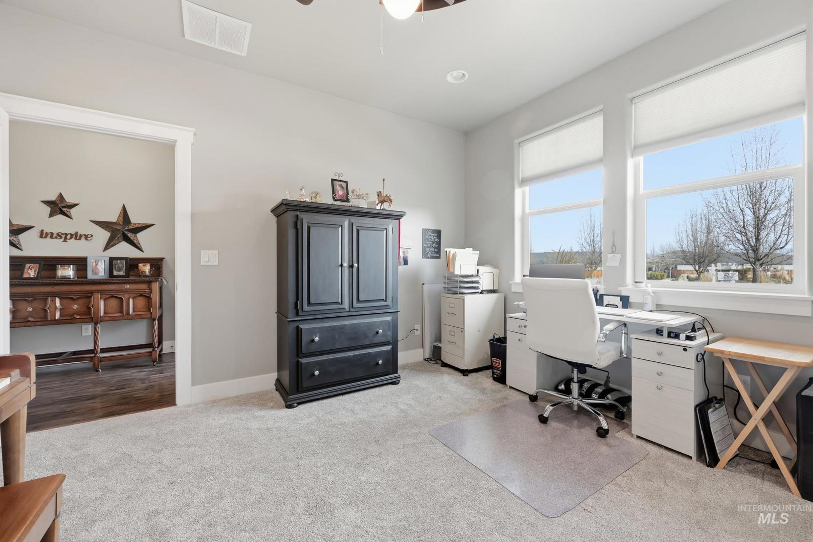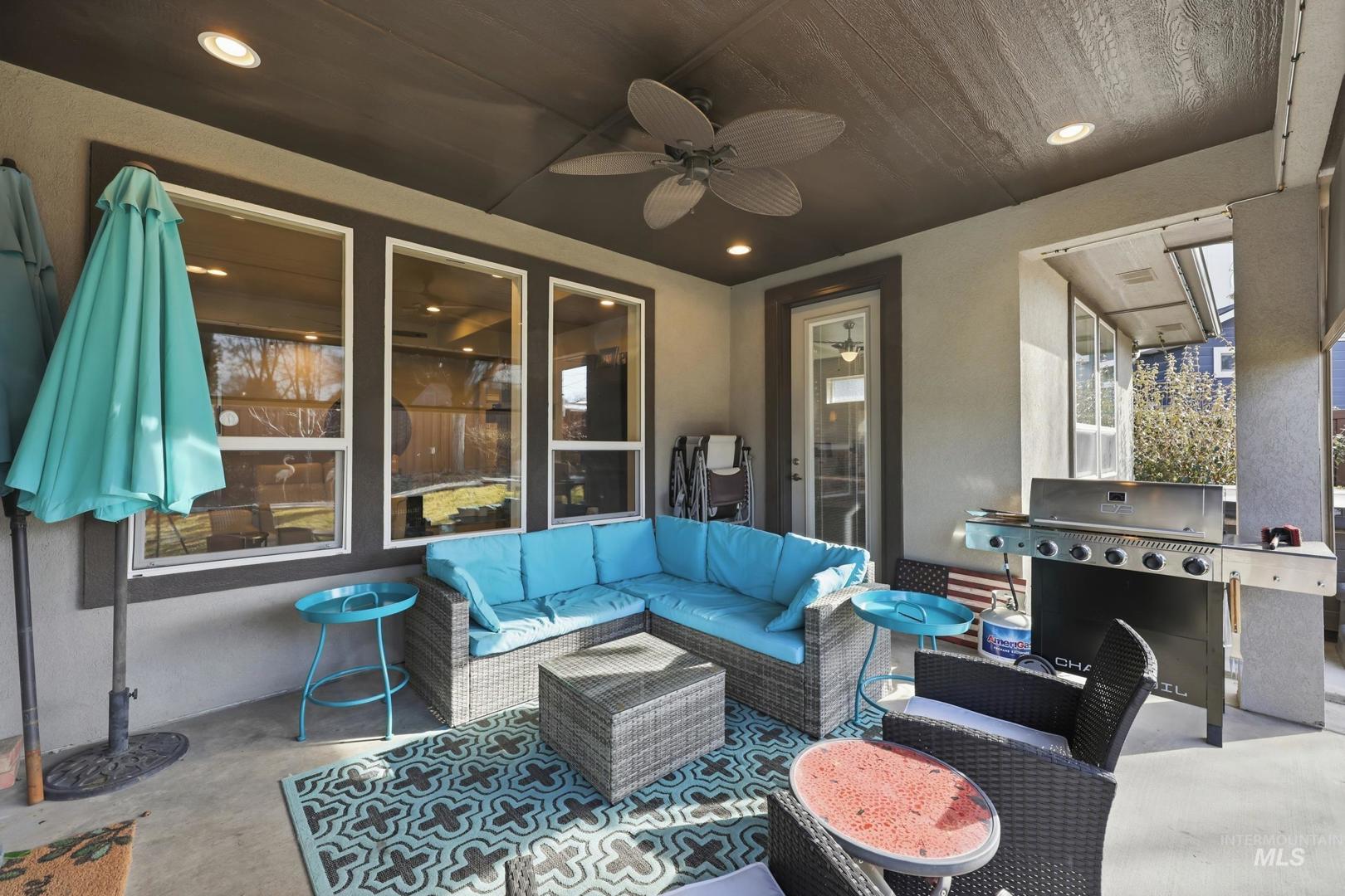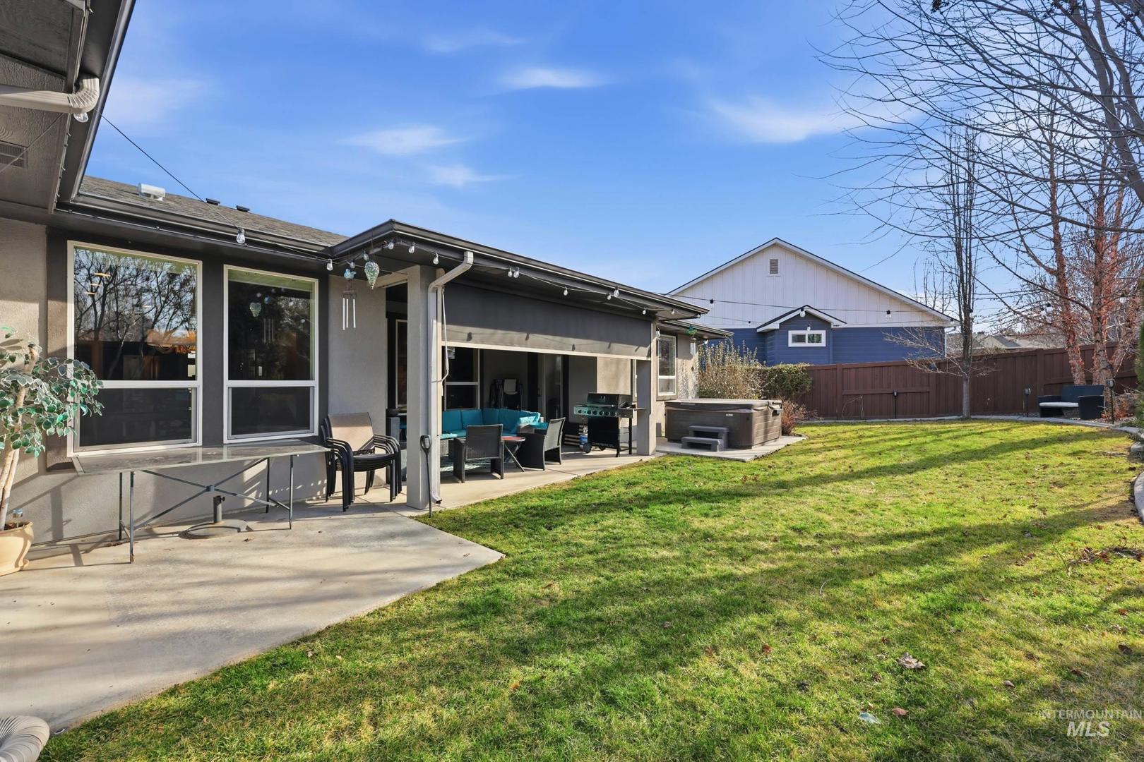 Custom-built single-level residence located in Hazelwood Village. This home offers 3 bedrooms, 2 bathrooms, and a spacious office. The open great room includes a gas fireplace with built-in cabinets. The kitchen features a breakfast bar, walk-in pantry with a wine and coffee bar. The spacious primary bdrm offers recessed lighting and has access to the covered patio. Ensuite includes a large closet and walk-in shower. The functional floor plan provides comfortable living and work-from-home flexibility. The covered patio opens to a private backyard which includes a custom sun screen, and a professionally installed mister system. The front of the home faces a park with mountain views, creating a welcoming and scenic setting. Perfect for relaxing or entertaining indoors and out. Home includes whole house water purifying system. The community includes two salt water pools, a clubhouse, scheduled concerts in the park, and weekly food truck events, dog park, and garden boxes. Conveniently located near shopping, dining, and recreation in **Boise**. Seller is an Idaho Licensed Real Estate Broker