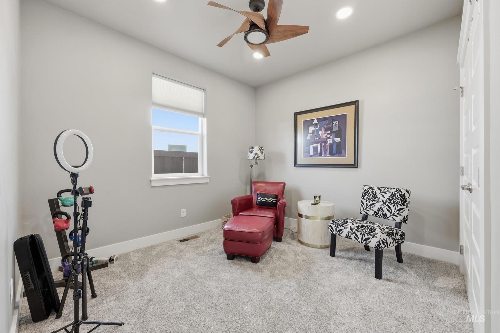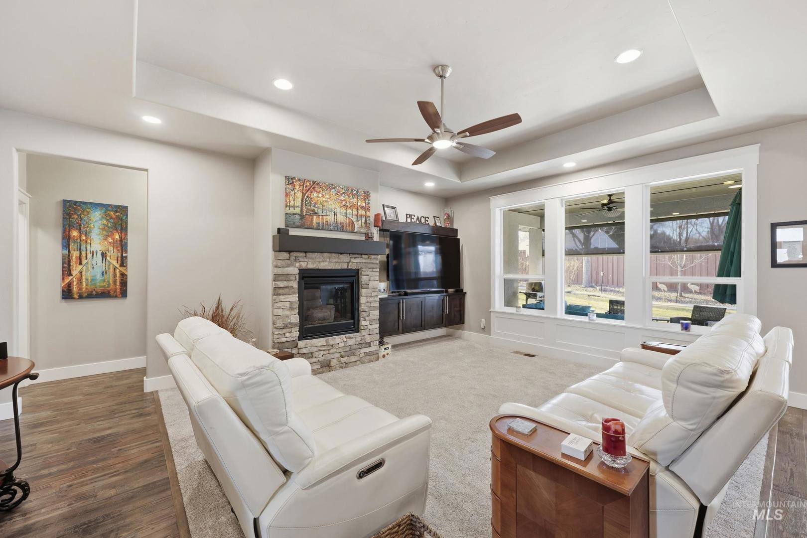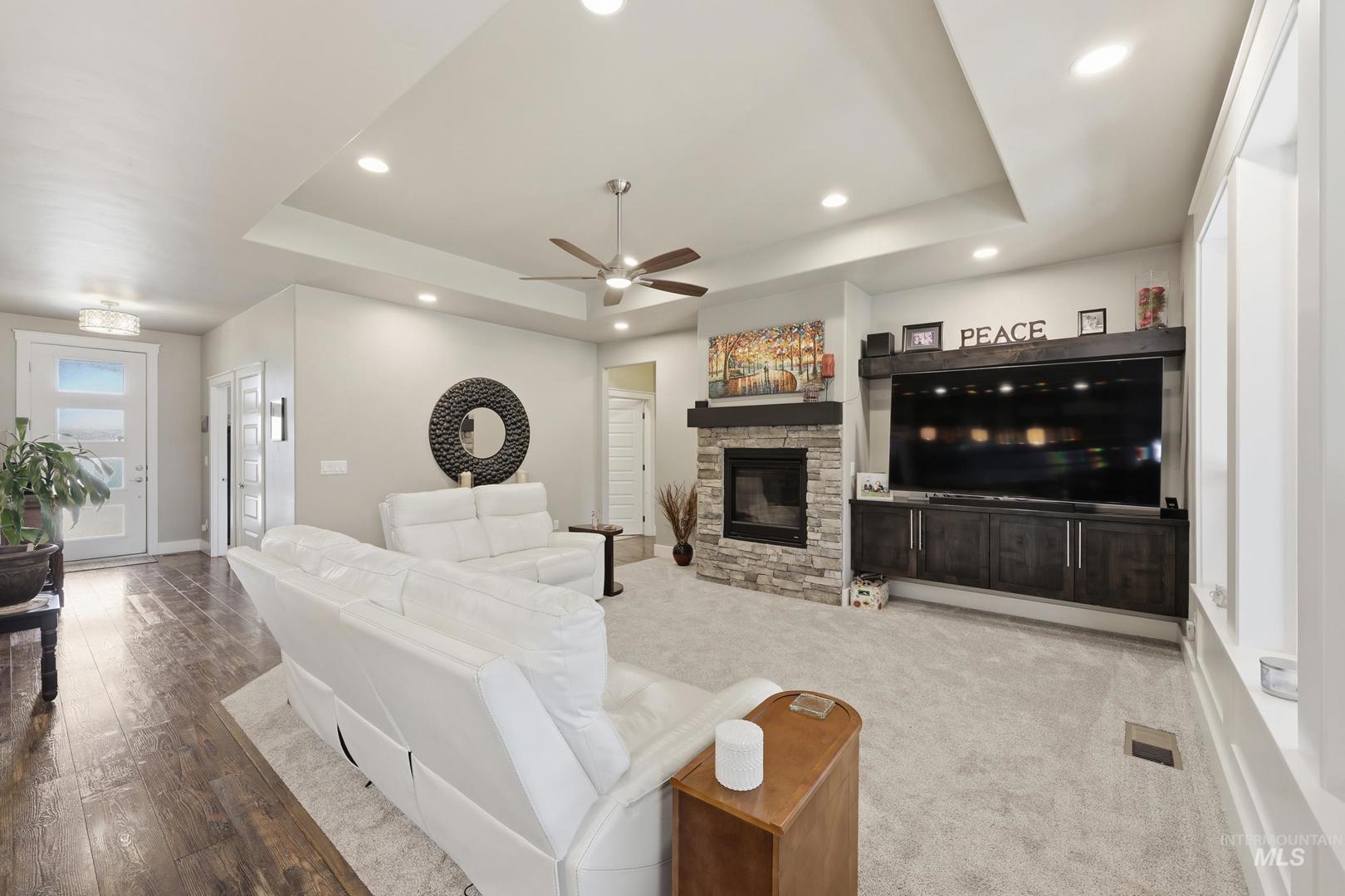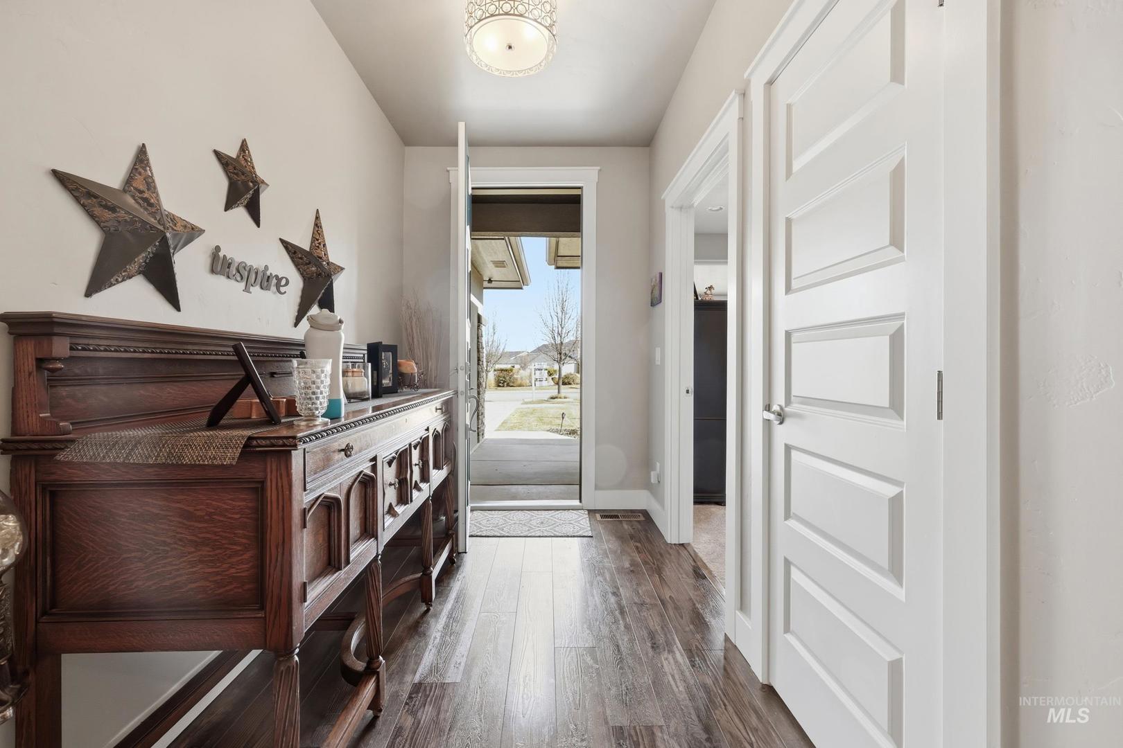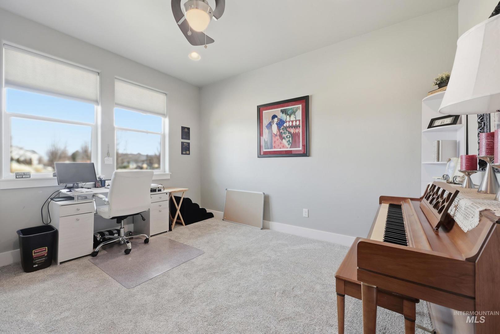 Custom-built single-level residence located in Hazelwood Village. This home offers 3 bedrooms, 2 bathrooms, and a spacious office. The open great room includes a gas fireplace with built-in cabinets. The kitchen features a breakfast bar, walk-in pantry with a wine and coffee bar. The spacious primary bdrm offers recessed lighting and has access to the covered patio. Ensuite includes a large closet and walk-in shower. The functional floor plan provides comfortable living and work-from-home flexibility. The covered patio opens to a private backyard which includes a custom sun screen, and a professionally installed mister system. The front of the home faces a park with mountain views, creating a welcoming and scenic setting. Perfect for relaxing or entertaining indoors and out. Home includes whole house water purifying system. The community includes two salt water pools, a clubhouse, scheduled concerts in the park, and weekly food truck events, dog park, and garden boxes. Conveniently located near shopping, dining, and recreation in **Boise**. Seller is an Idaho Licensed Real Estate Broker