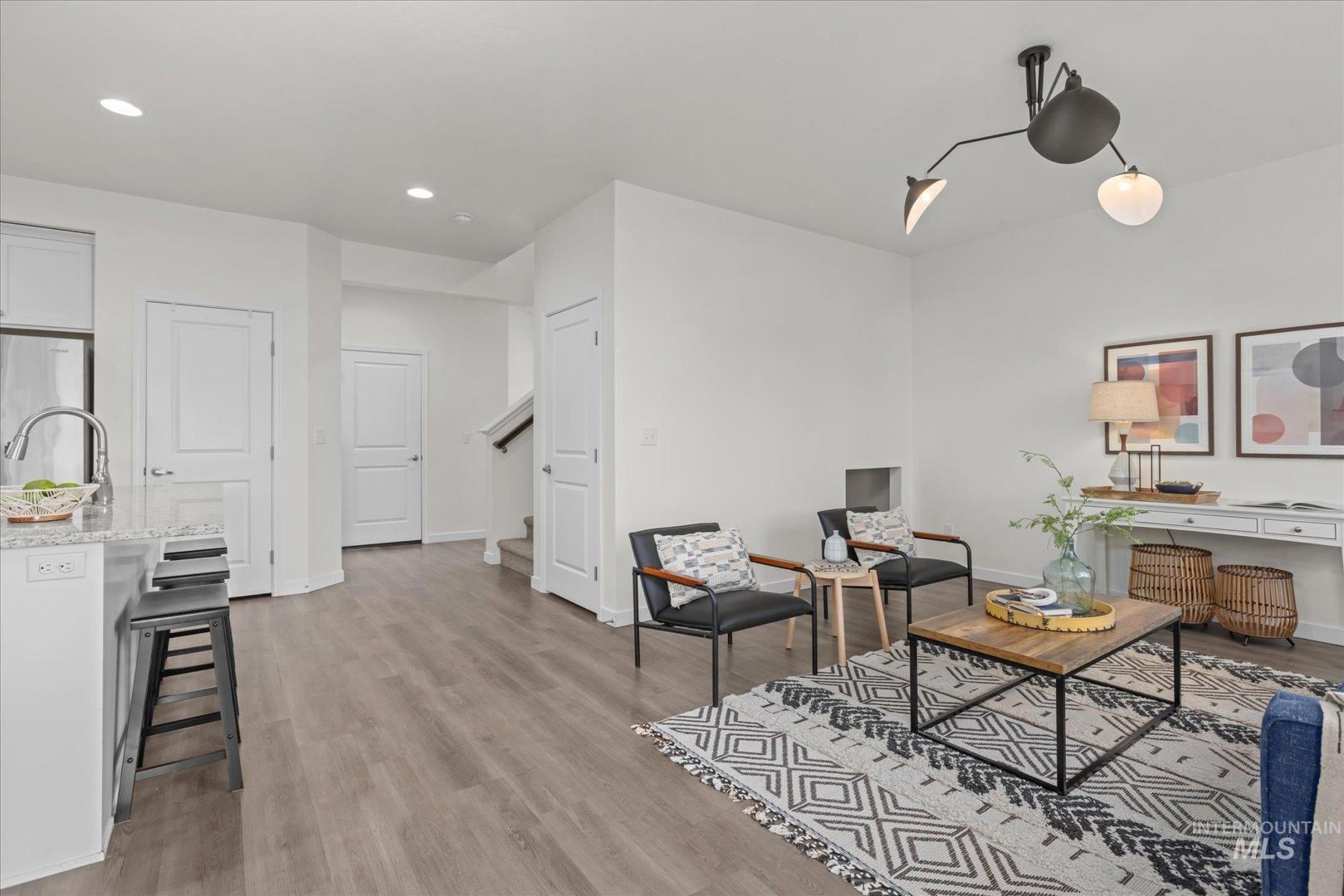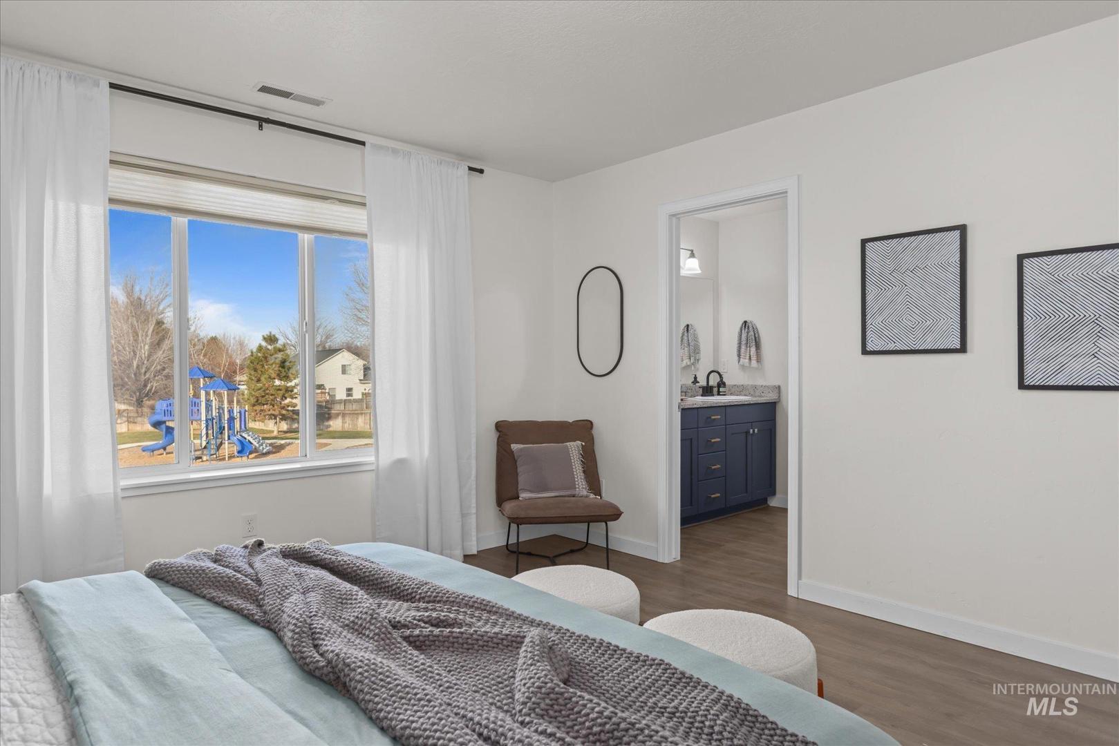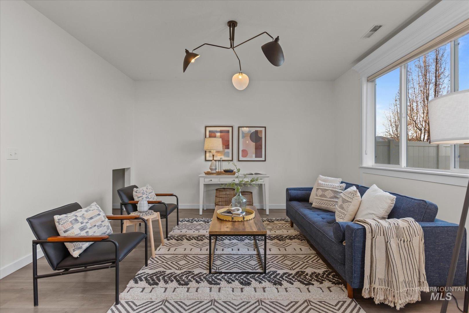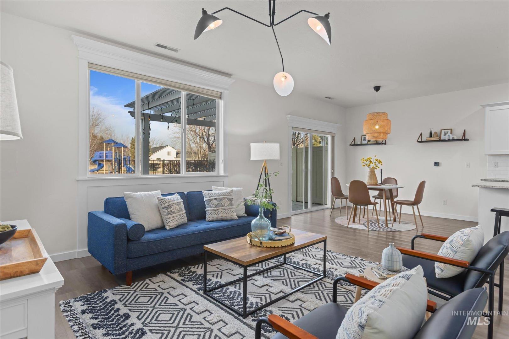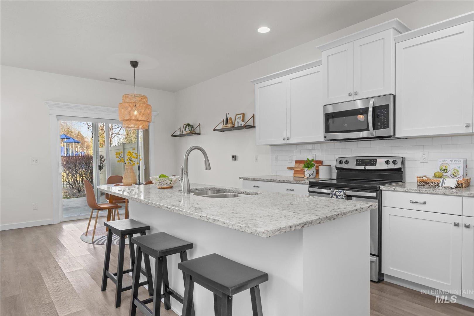 Welcome to this stylishly updated home backing to a lush greenbelt and park with no rear neighbors. Inside, the open-concept main floor showcases luxury vinyl plank flooring, crisp white cabinetry, granite countertops, and stainless steel appliances—perfect for everyday living or entertaining. Step outside to a fully fenced backyard with a charming pergola-covered patio, string lights, and direct views of the park and playground. Upstairs, the spacious primary suite is filled with natural light and offers serene views of the greenery beyond. Fresh, modern finishes throughout make this home move-in ready—combined with below-market financing, this is a value-packed opportunity you won’t want to miss.
