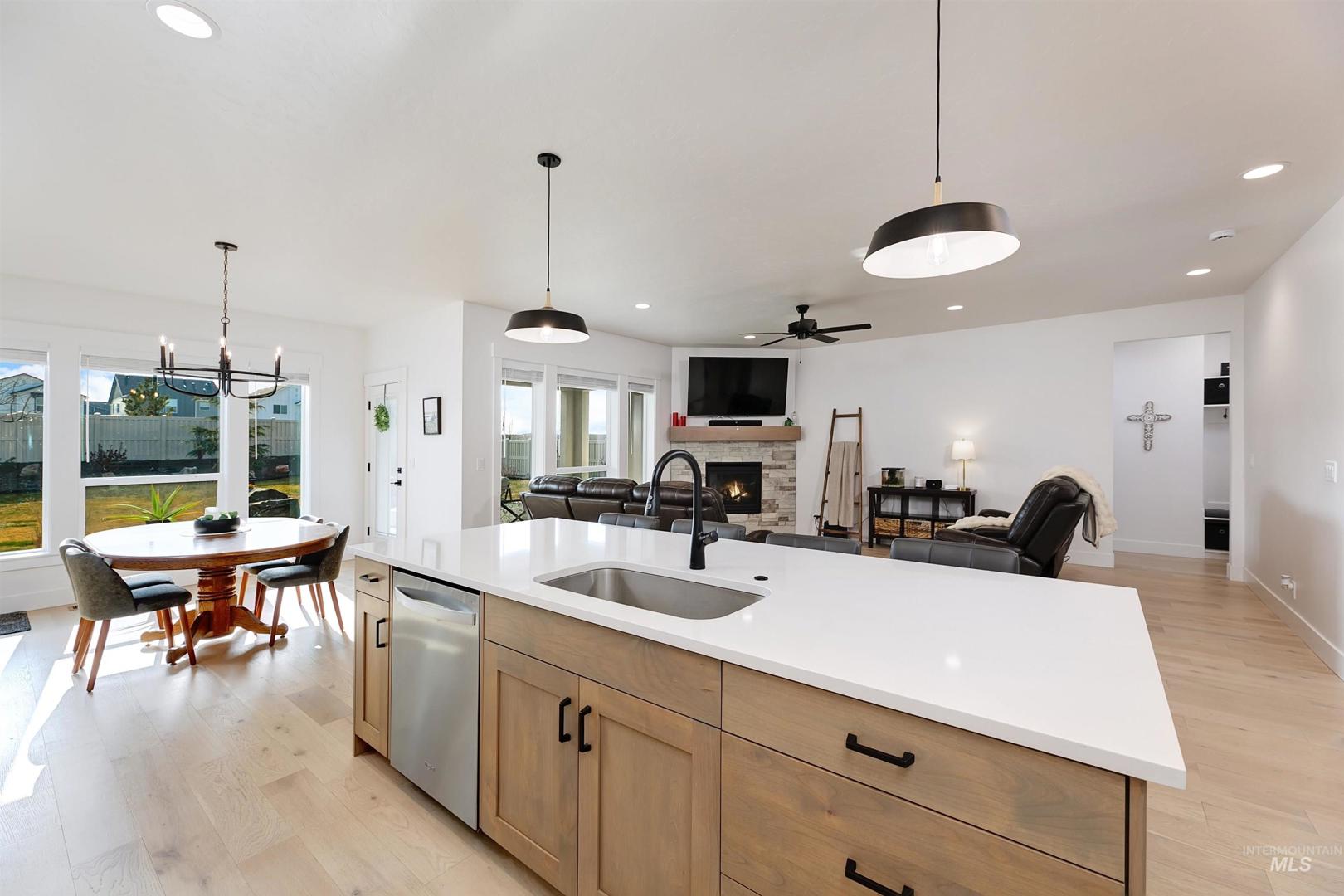 Experience refined living in the Shearwater Bonus, a thoughtfully designed 5-bedroom, 3-bathroom home with a 3-car garage, offering approximately 3,000 square feet of luxury. The gourmet kitchen is a showstopper, featuring quartz slab countertops, a full tile backsplash, and stainless steel appliances, wall oven, built-in microwave, dishwasher, and cabinet vent hood. Engineered hardwood flooring flows through the kitchen, dining, entry, mud room, pantry, and main-level hallways, creating a warm and cohesive feel. Retreat to a primary bedroom & spa inspired bathroom showcasing adult-height vanity, walk-in tile shower, and a luxurious soaker tub. Near YMCA, Indian Lakes Golf Course & Discovery Park.