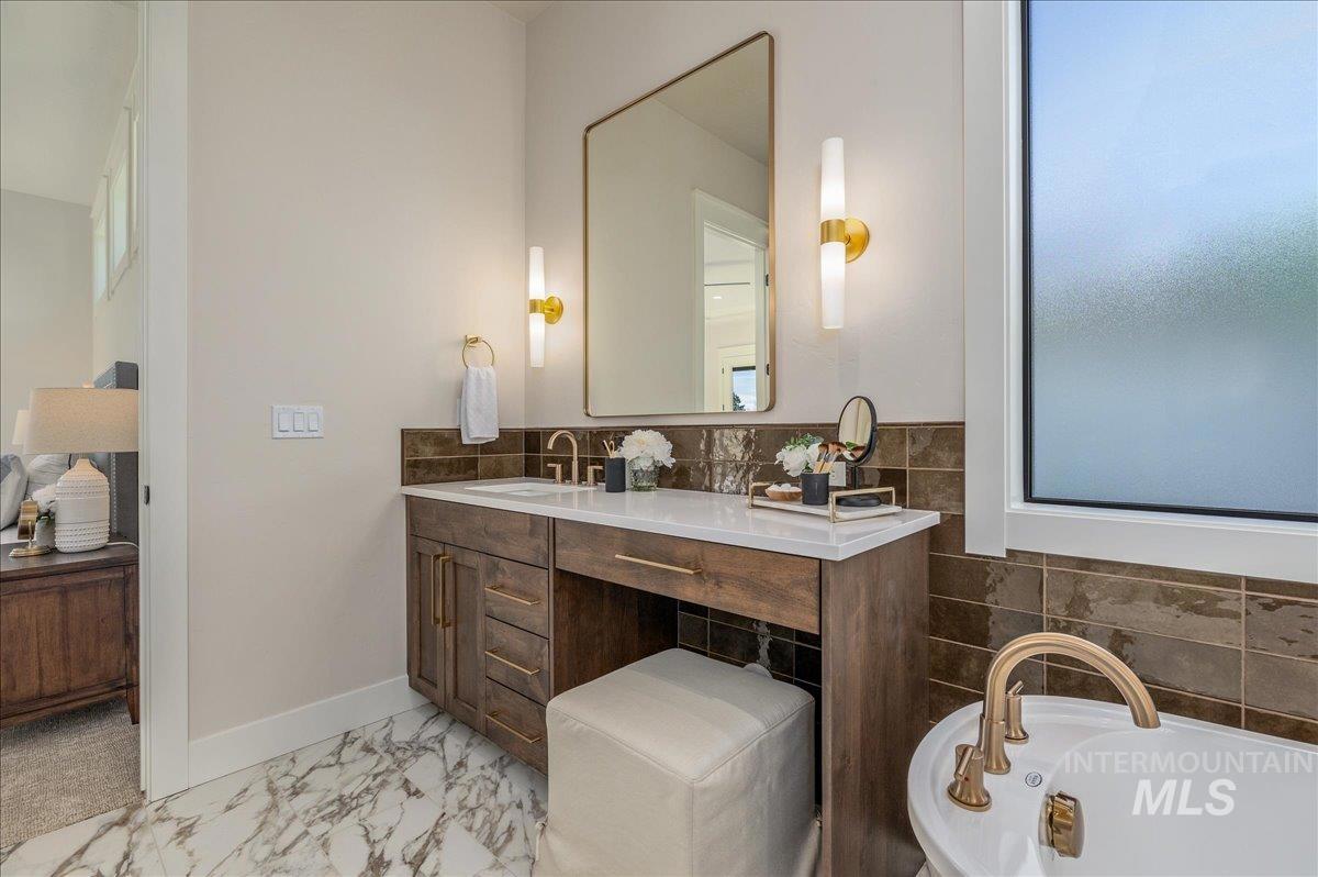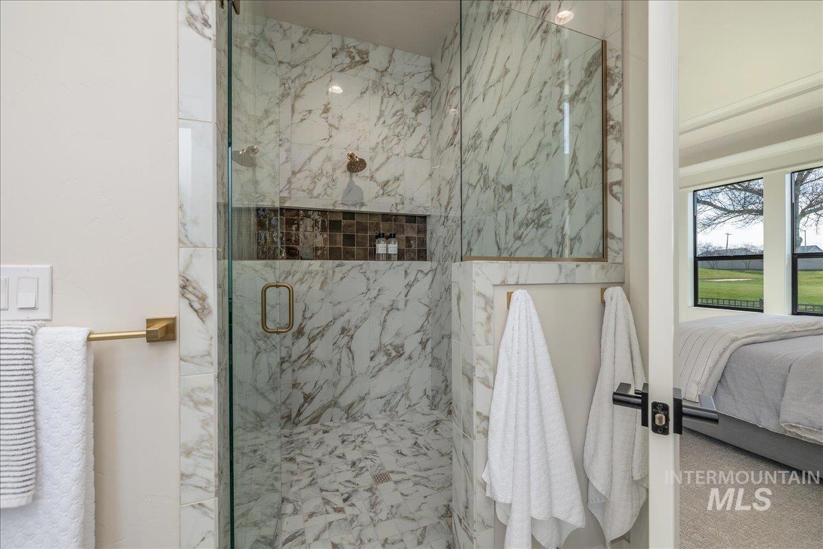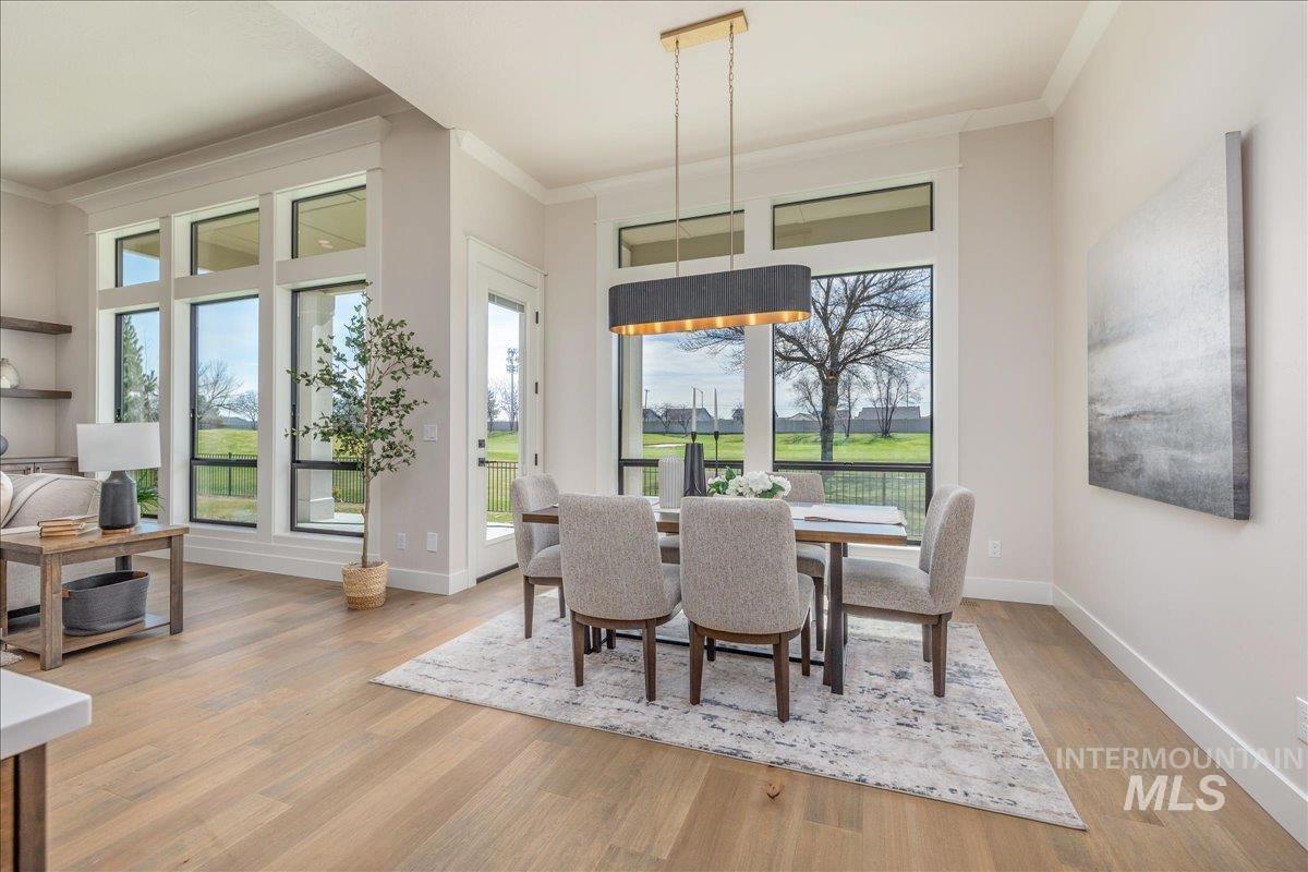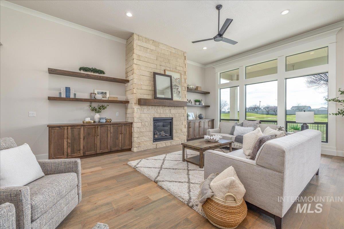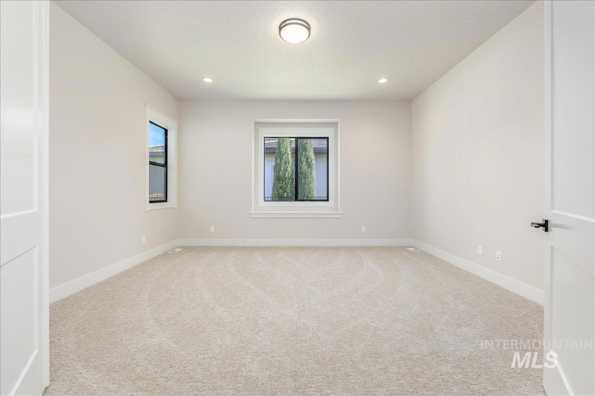 JUST FINISHED, this gorgeous single-level luxury living is in right in the heart of Meridian’s coveted Spurwing. Beautiful architectural details greet you immediately—from the inviting front courtyard to soaring ceilings illuminated by oversized, dramatic windows. Inside, thoughtful design meets everyday comfort with secondary en-suite bedrooms and a spacious bonus/media room, creating an ideal private wing for guests or multigenerational living. The chef’s kitchen is a true showpiece, featuring an expansive quartz island, WOLF® and SUBZERO® appliances, double ovens, a gas range, custom ceiling-height cabinetry, and abundant counter space. The great room offers a seamless place to gather, anchored by a beautiful gas fireplace & elevated by Todd Campbell Custom Homes’ signature trim work, moldings, and wood-wrapped windows. Retreat to the secluded primary suite, a calming oasis complete with a spa-inspired ensuite bath boasting a soaking tub, dual vanities, makeup vanity, & a beautifully tiled walk-in shower. Car enthusiasts and hobbyists will love the fully finished and insulated 1,272 SF RV garage, complete with a 12-ft door and epoxy flooring. Situated on nearly a quarter acre, the property comes fully landscaped and move-in ready—one of the final opportunities to own a new home in Olive Tree at Spurwing. PHOTOS ARE OF THE ACTUAL HOME.