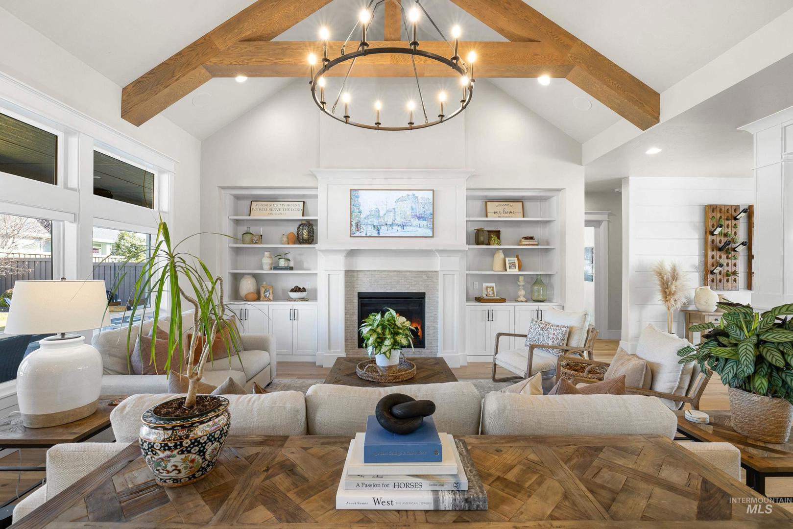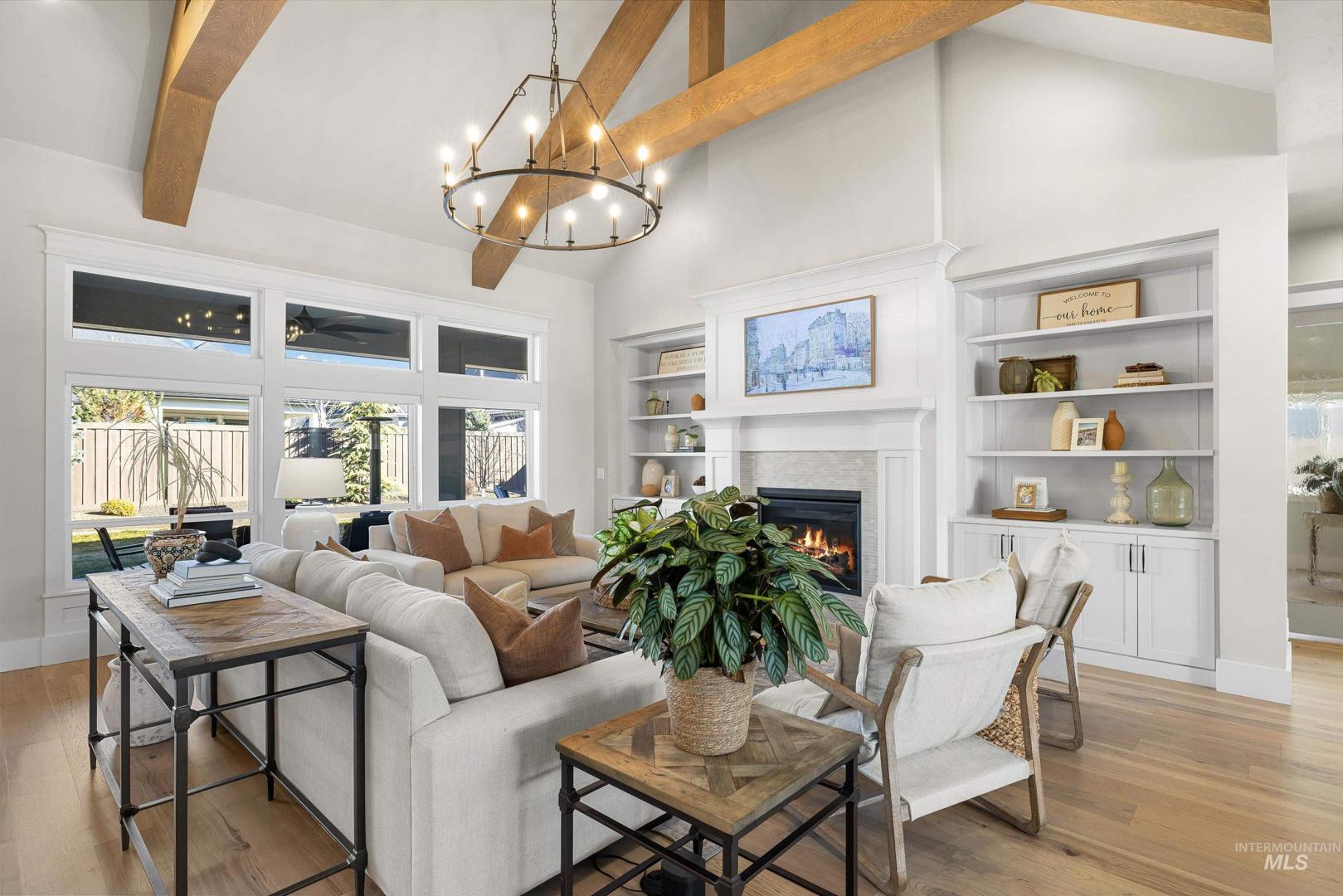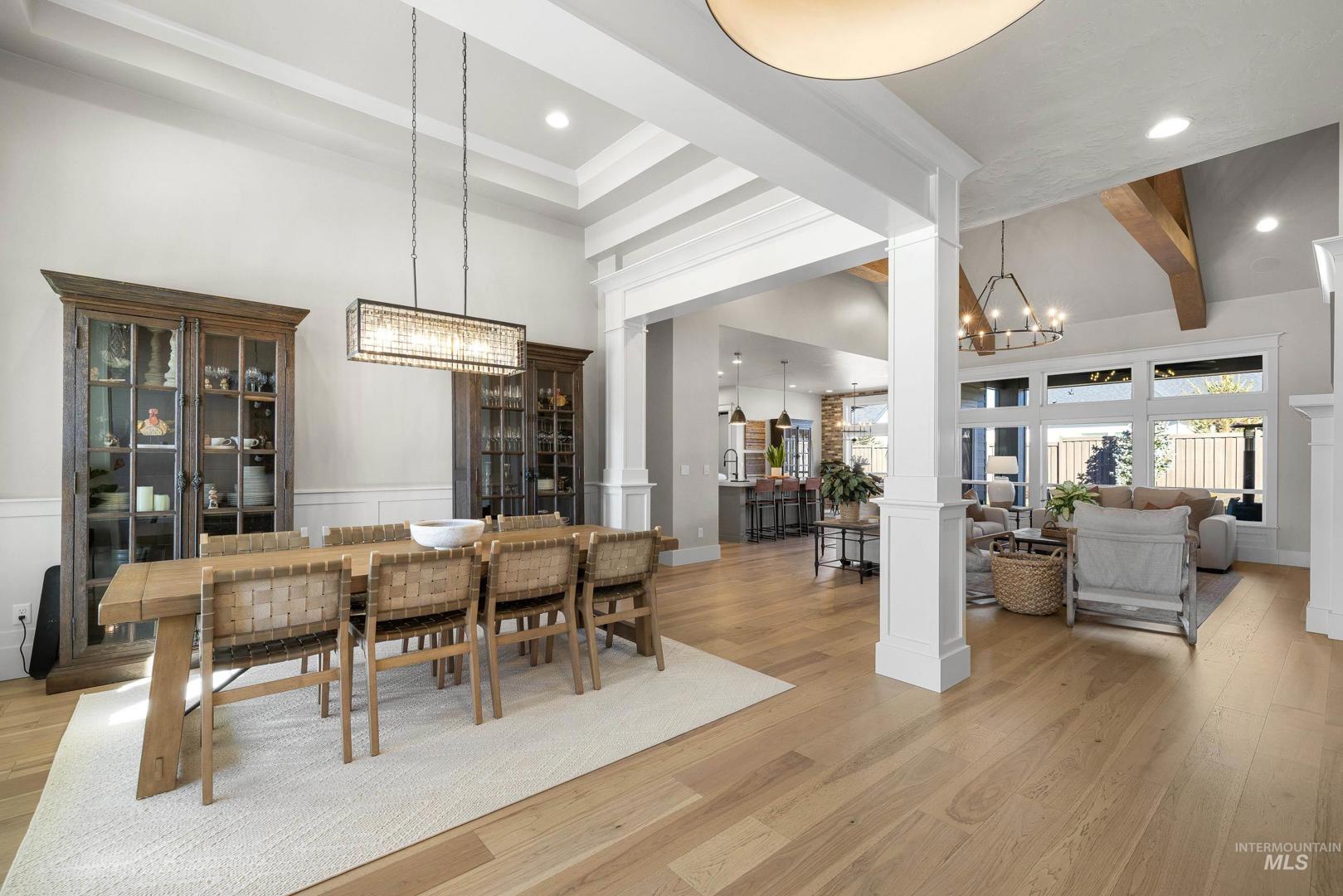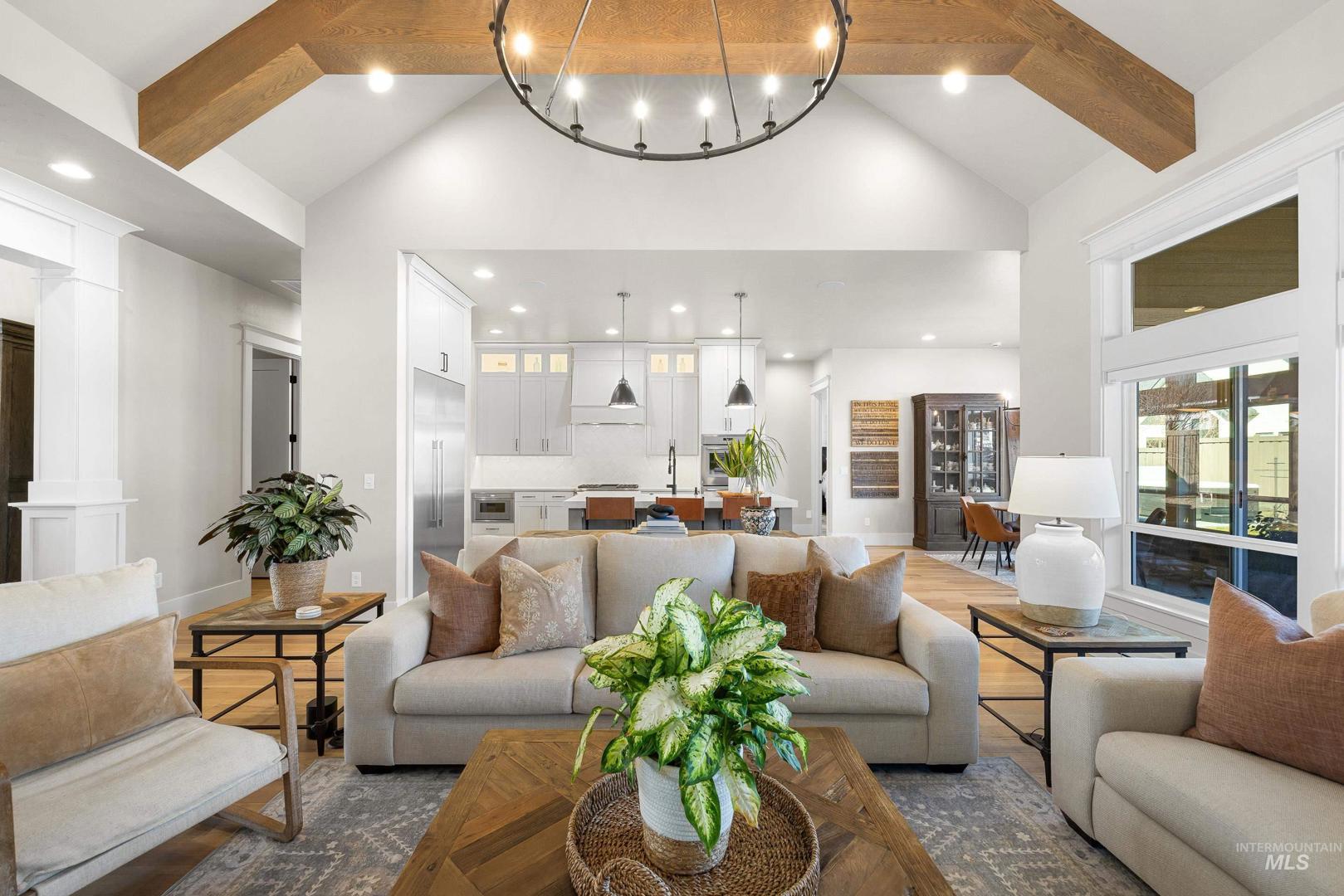 Welcome to a beautifully crafted home by renowned builder James Clyde Homes, where exceptional craftsmanship and comfort are woven into every detail. Thoughtfully designed with 4 spacious bedrooms plus a dedicated office/flex space, this home offers the versatility to fit a variety of lifestyles. From the moment you step inside, rich hardwood floors create a warm, refined foundation throughout the main living spaces. The great room makes a stunning first impression with soaring vaulted ceilings and exposed beam detail, offering both scale and character. The chef’s kitchen is a true centerpiece—featuring professional-grade Thermador appliances, custom cabinetry, and a layout designed for both elevated entertaining and everyday functionality. Whether hosting an intimate dinner or a lively gathering, this space delivers effortlessly. Additional highlights include an oversized garage with durable epoxy flooring, whole-home automated roller shades, a hardwired Unifi exterior security system, and a f ull whole-house audio system with surround sound extending to the patio. Step outside to enjoy the built-in gas fireplace—perfect for year-round outdoor living. Ideally situated in one of Eagle’smost desirable areas, this home offers the perfect blend of lifestyle and convenience. Enjoy easy access to the Boise River Greenbelt, Eagle Island State Park, and a nearby community park.