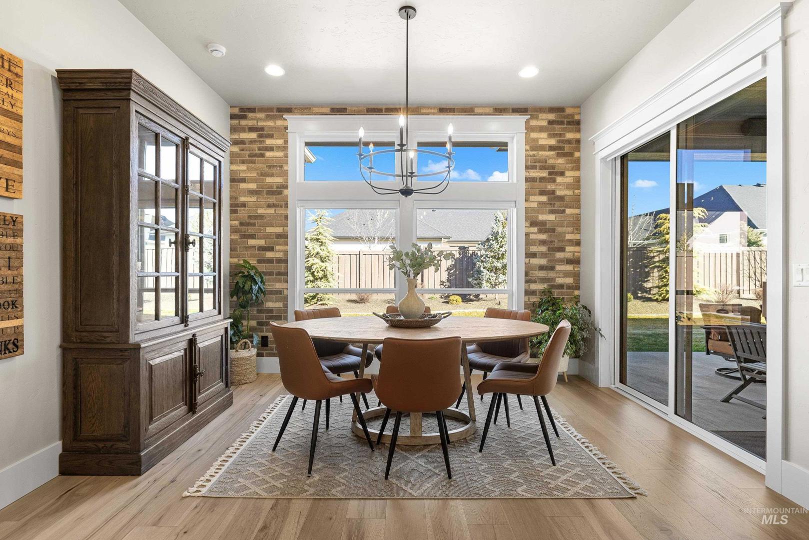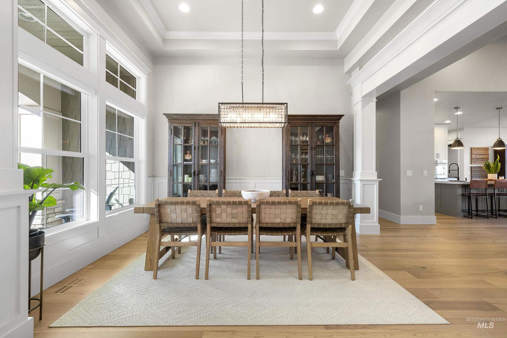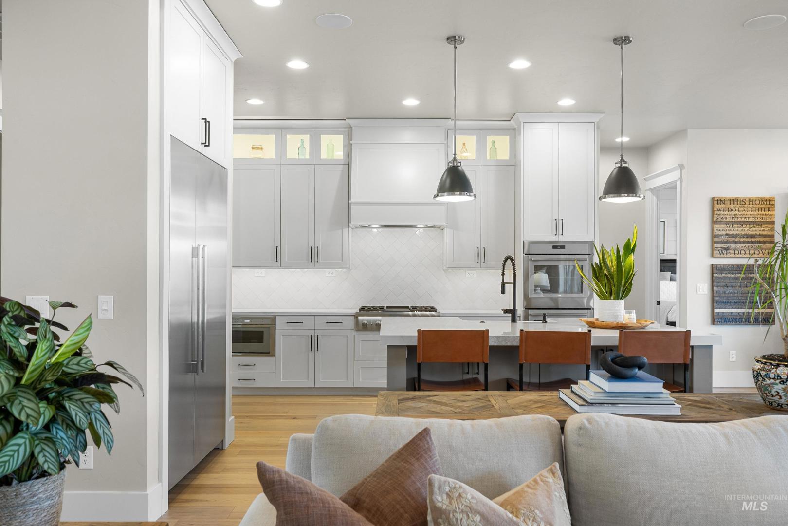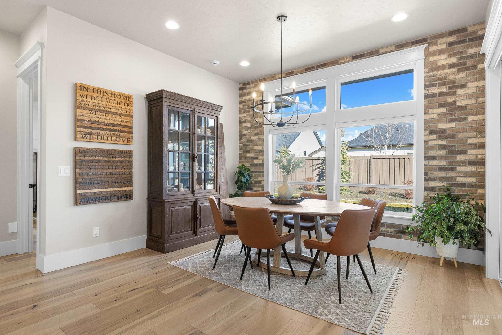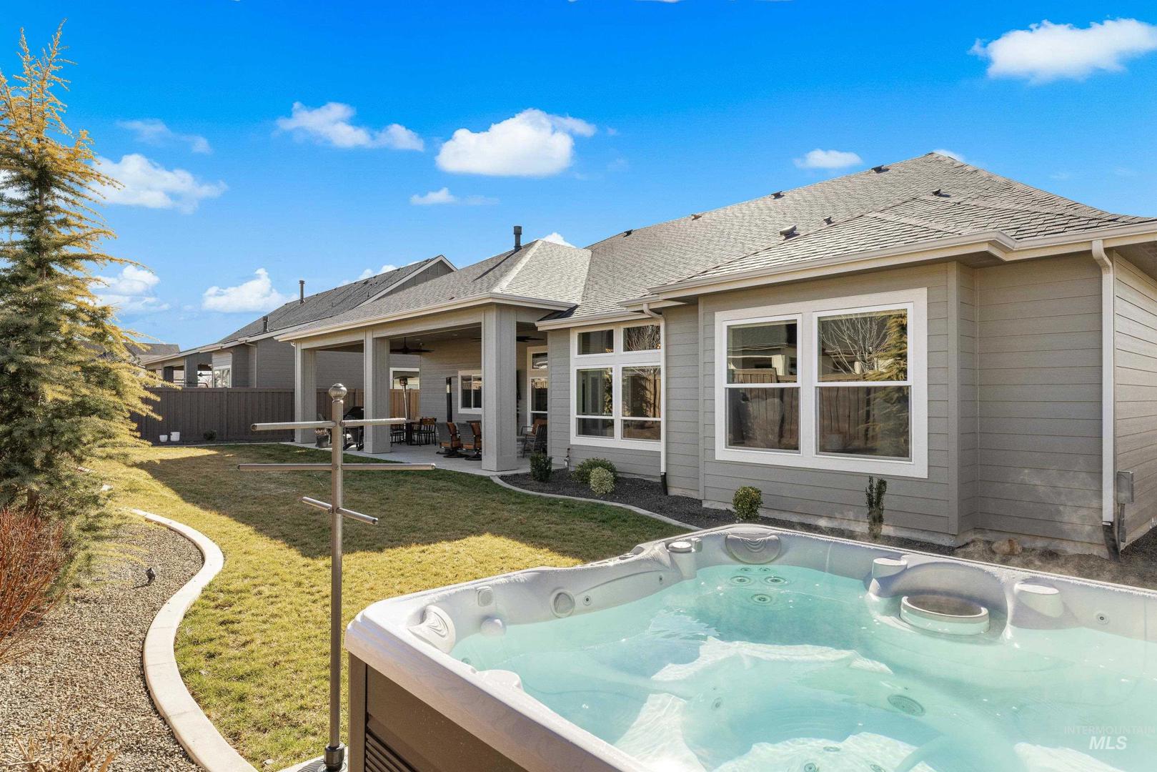 Welcome to a beautifully crafted home by renowned builder James Clyde Homes, where exceptional craftsmanship and comfort are woven into every detail. Thoughtfully designed with 4 spacious bedrooms plus a dedicated office/flex space, this home offers the versatility to fit a variety of lifestyles. From the moment you step inside, rich hardwood floors create a warm, refined foundation throughout the main living spaces. The great room makes a stunning first impression with soaring vaulted ceilings and exposed beam detail, offering both scale and character. The chef’s kitchen is a true centerpiece—featuring professional-grade Thermador appliances, custom cabinetry, and a layout designed for both elevated entertaining and everyday functionality. Whether hosting an intimate dinner or a lively gathering, this space delivers effortlessly. Additional highlights include an oversized garage with durable epoxy flooring, whole-home automated roller shades, a hardwired Unifi exterior security system, and a f ull whole-house audio system with surround sound extending to the patio. Step outside to enjoy the built-in gas fireplace—perfect for year-round outdoor living. Ideally situated in one of Eagle’smost desirable areas, this home offers the perfect blend of lifestyle and convenience. Enjoy easy access to the Boise River Greenbelt, Eagle Island State Park, and a nearby community park.