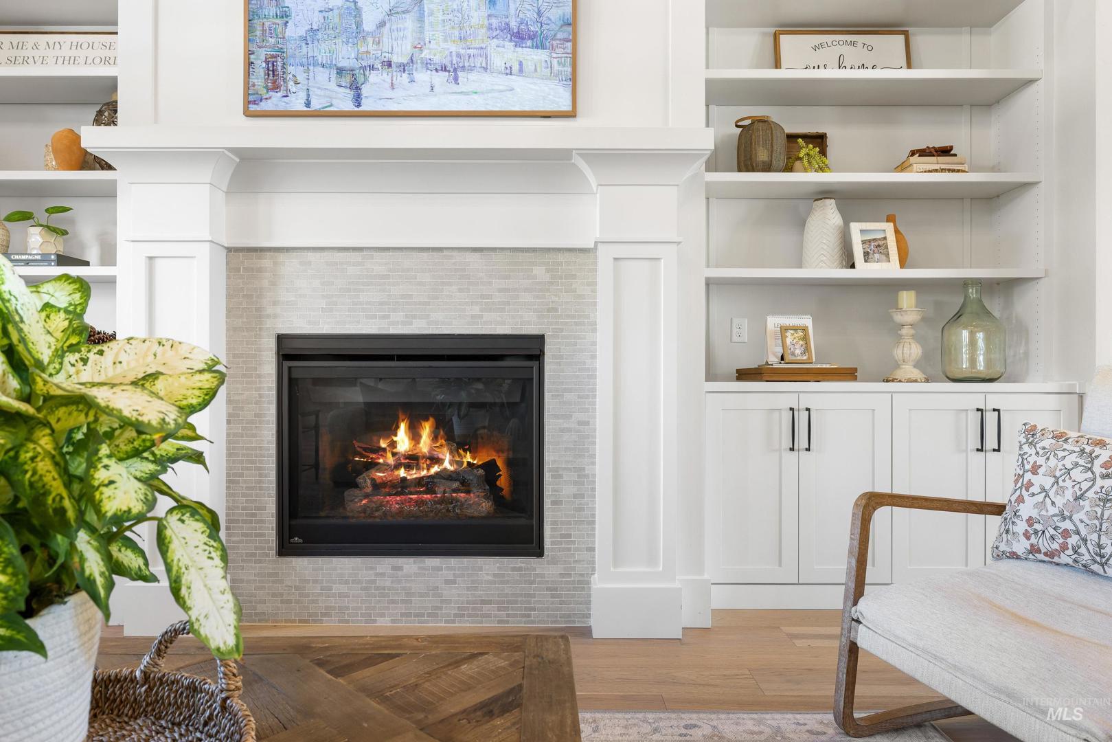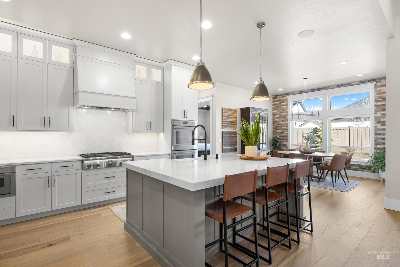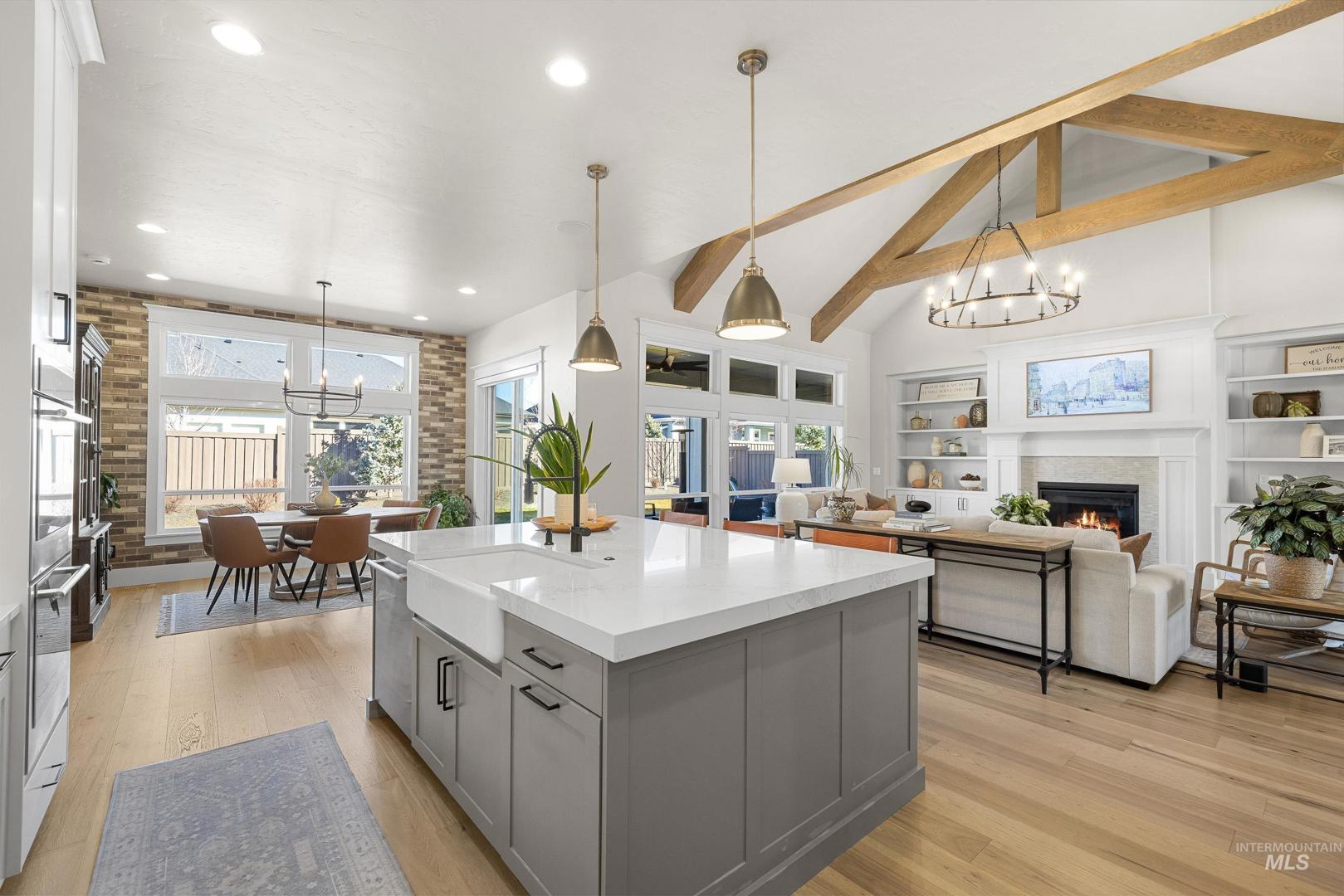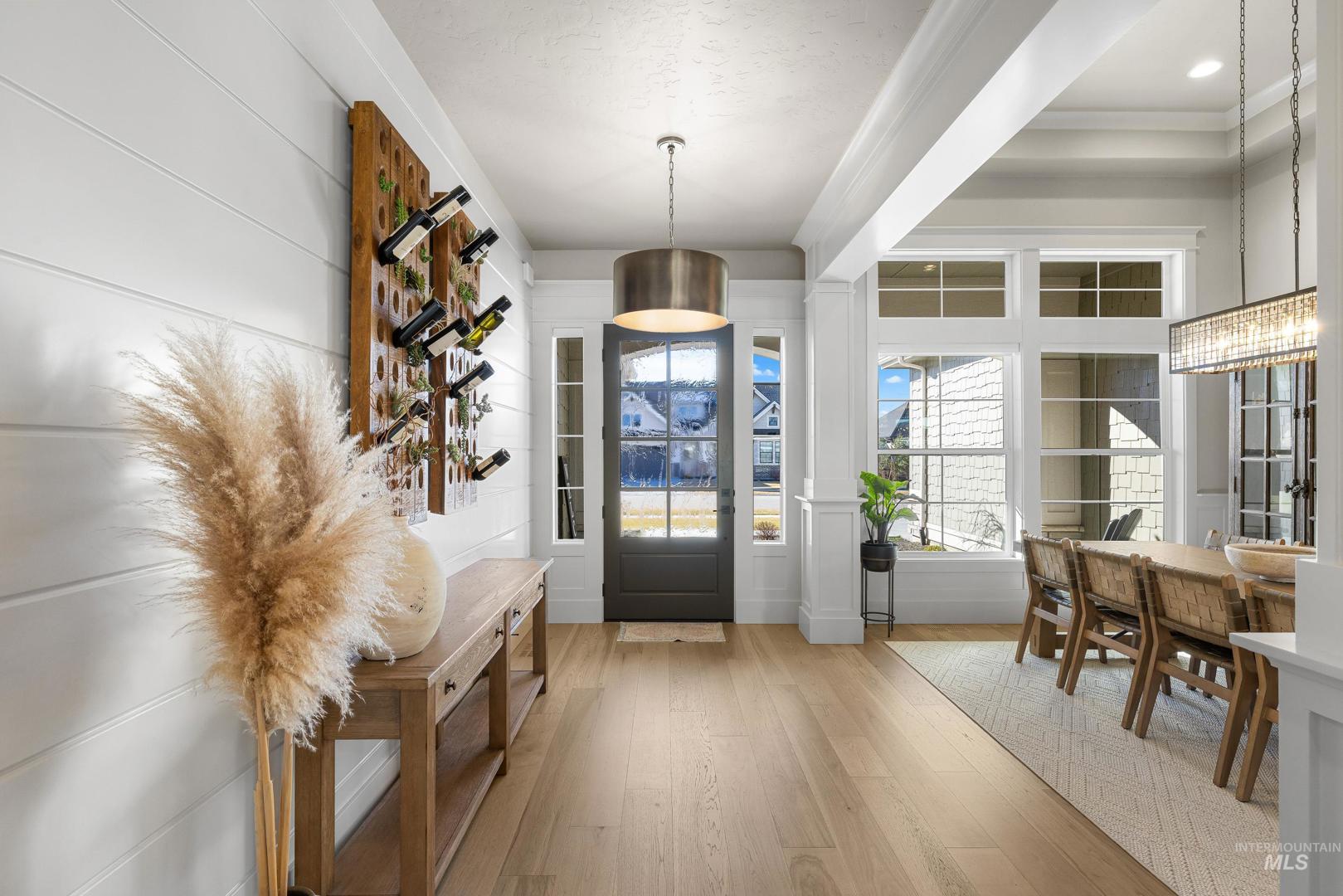 Welcome to a beautifully crafted home by renowned builder James Clyde Homes, where exceptional craftsmanship and comfort are woven into every detail. Thoughtfully designed with 4 spacious bedrooms plus a dedicated office/flex space, this home offers the versatility to fit a variety of lifestyles. From the moment you step inside, rich hardwood floors create a warm, refined foundation throughout the main living spaces. The great room makes a stunning first impression with soaring vaulted ceilings and exposed beam detail, offering both scale and character. The chef’s kitchen is a true centerpiece—featuring professional-grade Thermador appliances, custom cabinetry, and a layout designed for both elevated entertaining and everyday functionality. Whether hosting an intimate dinner or a lively gathering, this space delivers effortlessly. Additional highlights include an oversized garage with durable epoxy flooring, whole-home automated roller shades, a hardwired Unifi exterior security system, and a f ull whole-house audio system with surround sound extending to the patio. Step outside to enjoy the built-in gas fireplace—perfect for year-round outdoor living. Ideally situated in one of Eagle’smost desirable areas, this home offers the perfect blend of lifestyle and convenience. Enjoy easy access to the Boise River Greenbelt, Eagle Island State Park, and a nearby community park.