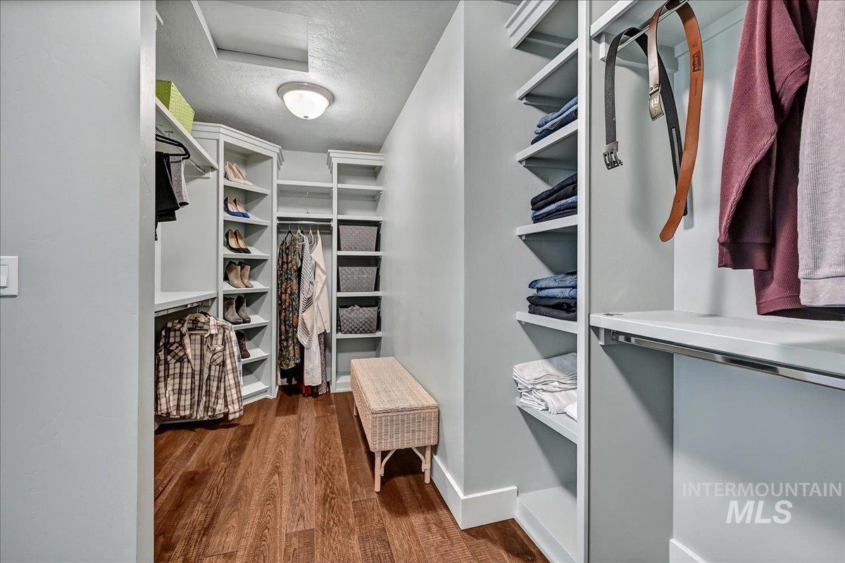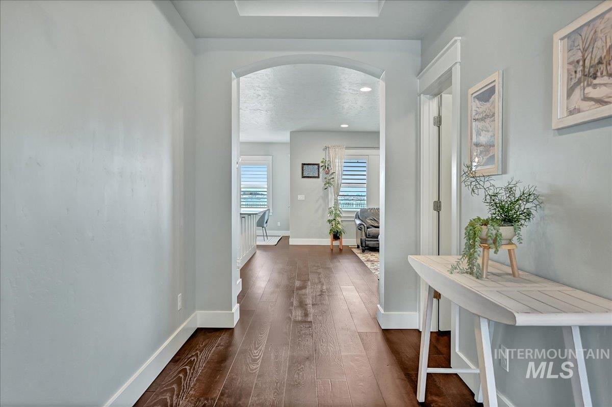 Beautifully upgraded and thoughtfully designed, this home blends comfort, craftsmanship, and modern refinement. A covered front patio and low-maintenance landscaping create welcoming curb appeal. Inside, engineered hardwood floors extend throughout all living areas and bedrooms, complemented by plantation shutters, detailed trim moldings, and a beautiful floor-to-ceiling brick gas fireplace.The kitchen is both elegant and functional, featuring quartz countertops, tile backsplash, custom full-height cabinetry, under and upper cabinet lighting, and a large island with storage and seating. Sleek stainless steel appliances include a NEW gas stove, oven and dishwasher, plus a statement vent hood and farmhouse sink. A spacious walk-in baker’s pantry adds exceptional storage. The expansive primary suite offers tray ceilings, dual vanities, a soaker tub, fully tiled walk-in shower, and an oversized custom walk-in closet. Flexible living spaces include a main-level fourth bedroom or office, bonus loft, mudroom with built-ins, and convenient laundry room with cabinetry & counter-space. Additional highlights include a central vacuum system, water softener, and extra-deep garage bay (3 car). Enjoy a covered rear patio, fully fenced yard with garden space, and no rear neighbors—all just minutes from the Boise Foothills, the Boise River, Greenbelt, Lucky Peak, shopping, dining, and recreation.