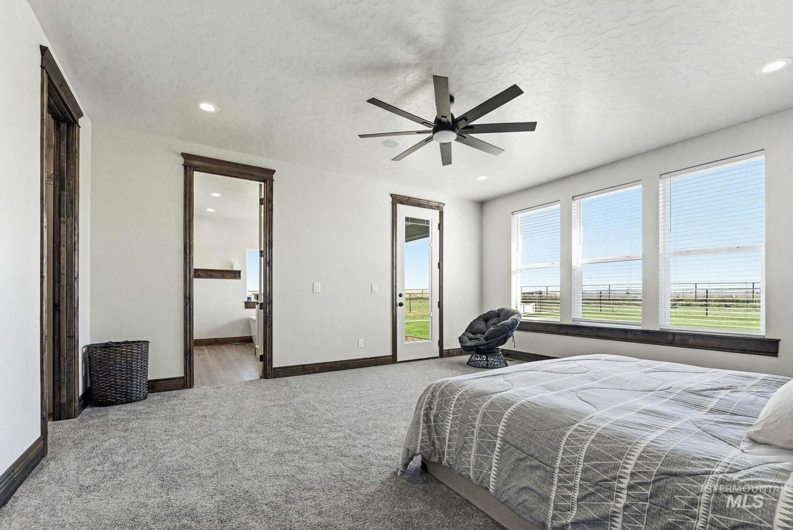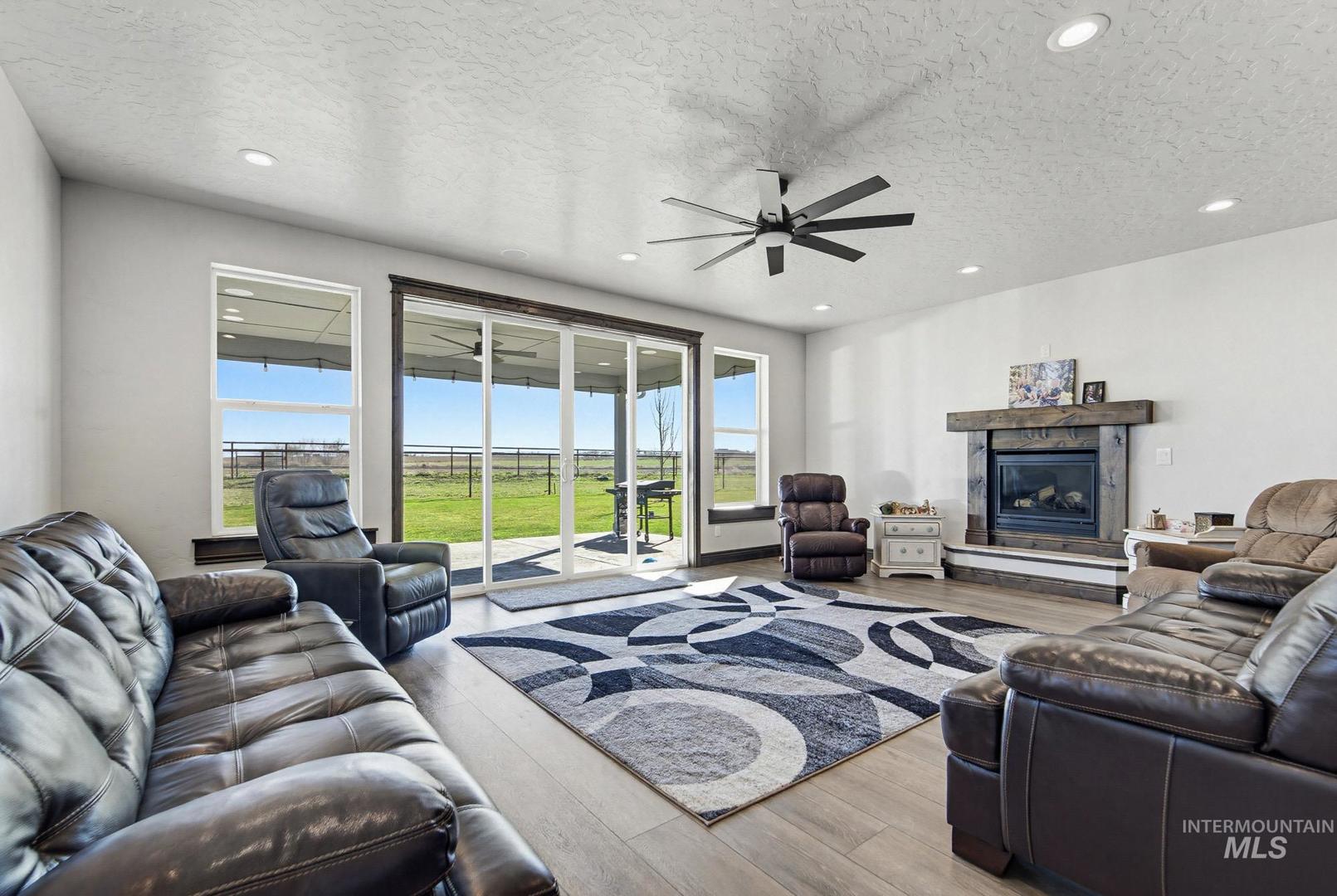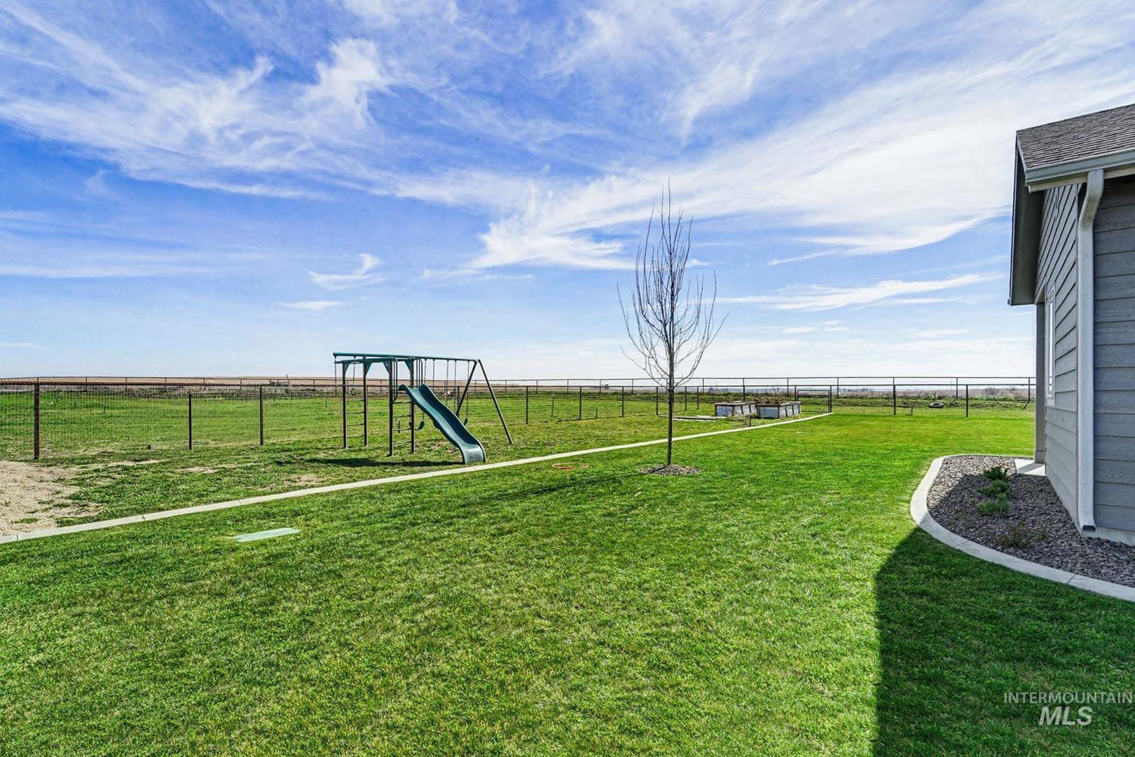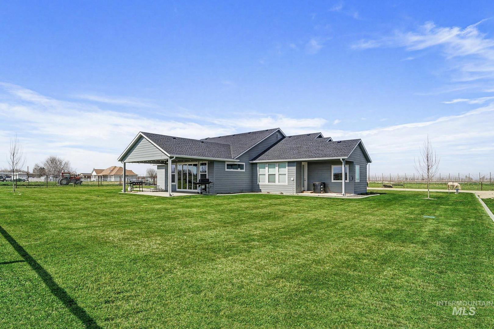Stunning country living awaits on this fully usable 5-acre homesite just minutes from downtown Caldwell. This thoughtfully designed single-level home offers 2,900 sq ft with 3 bedrooms, 2.5 bathrooms, and a large office complete with a built-in safe room. You’ll find an open-concept layout where the kitchen, dining, and living areas flow seamlessly together—creating an inviting space ideal for everyday living and entertaining. The living room features a cozy gas fireplace. The kitchen is a true centerpiece, featuring high-end custom cabinetry with soft-close features, stainless steel appliances, granite countertops, and a full granite backsplash. The split-bedroom design offers added privacy, with the primary suite serving as a quiet retreat with a spacious bedroom and a well-appointed ensuite bathroom with granite finishes and dual vanities. The oversized 3-car garage provides ample room for vehicles, storage, and projects, and the property is wired and plumbed for RV parking. Step outside and enjoy a fully fenced 5-acre setup with pasture, solid-set sprinklers, and pressurized irrigation. Escape the hustle and bustle while still being conveniently located near town.