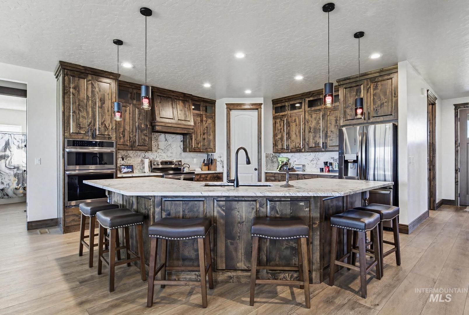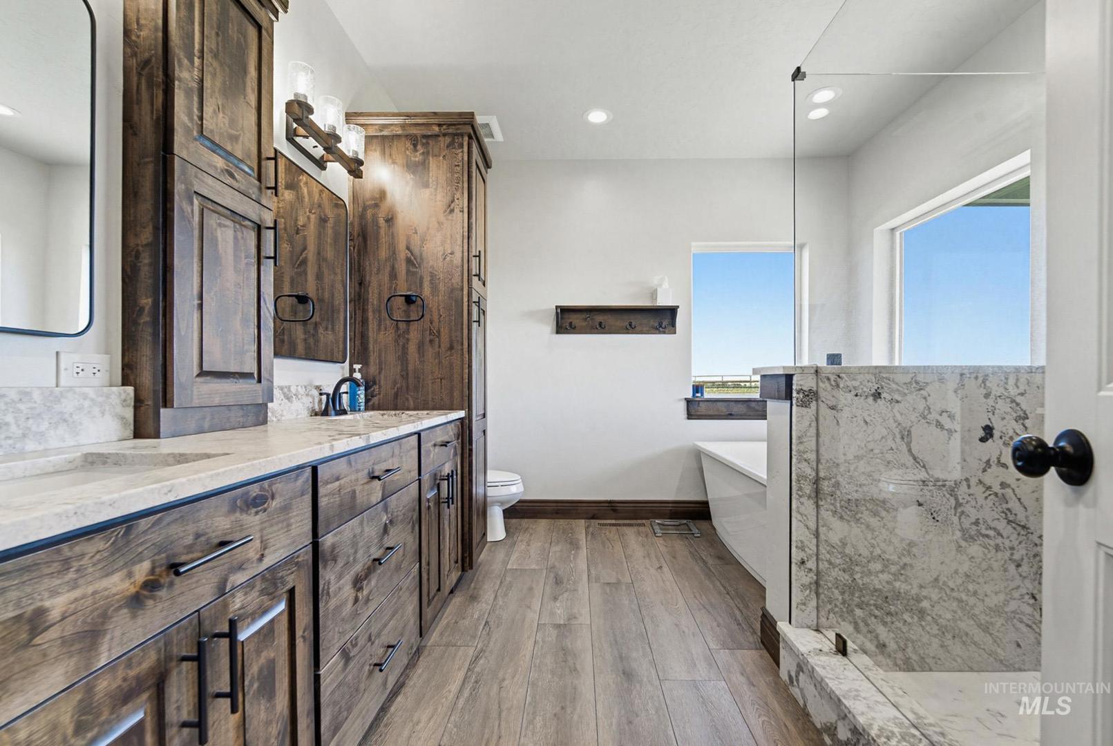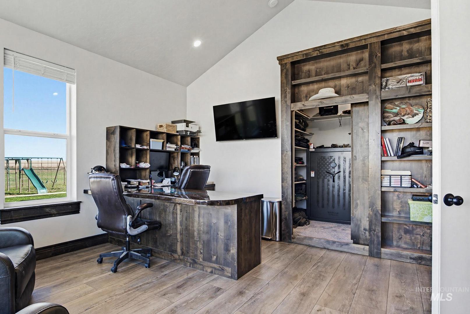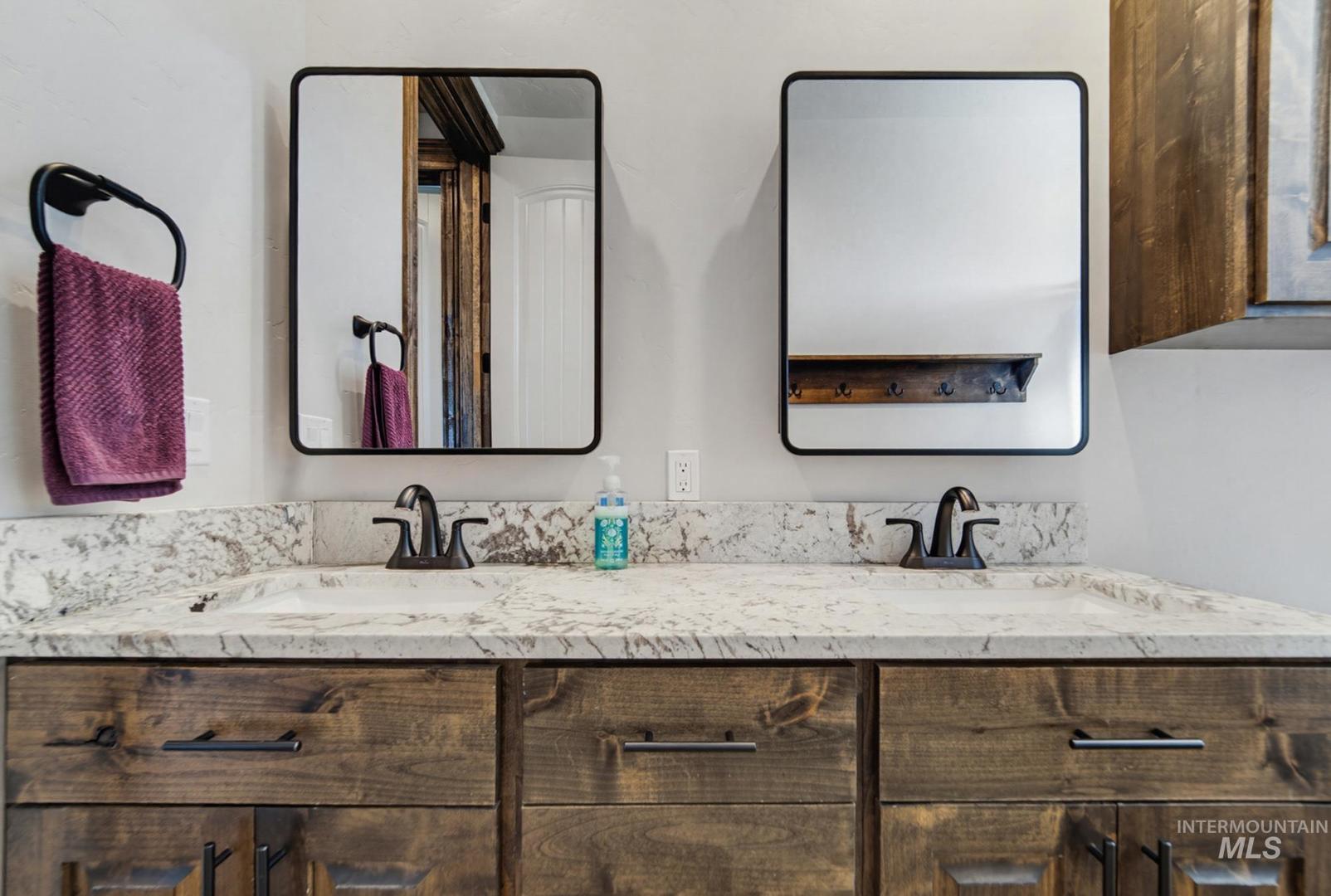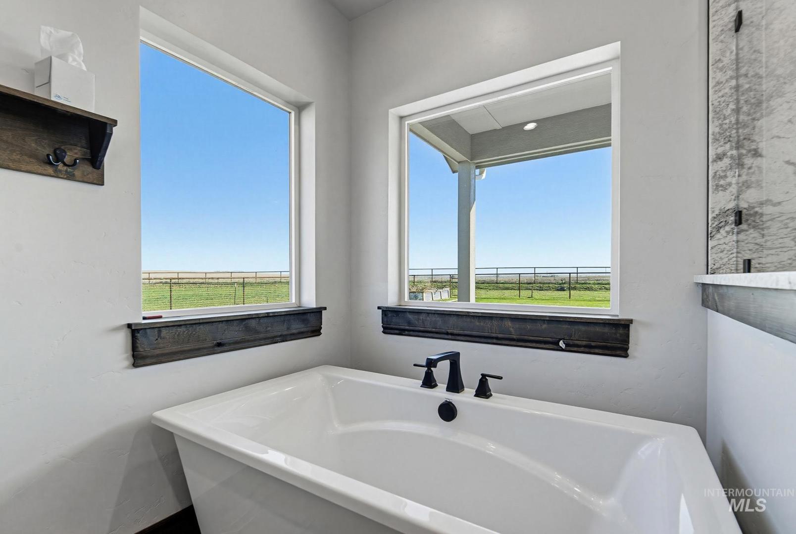 Stunning country living awaits on this fully usable 5-acre homesite just minutes from downtown Caldwell. This thoughtfully designed single-level home offers 2,900 sq ft with 3 bedrooms, 2.5 bathrooms, and a large office complete with a built-in safe room. You’ll find an open-concept layout where the kitchen, dining, and living areas flow seamlessly together—creating an inviting space ideal for everyday living and entertaining. The living room features a cozy gas fireplace. The kitchen is a true centerpiece, featuring high-end custom cabinetry with soft-close features, stainless steel appliances, granite countertops, and a full granite backsplash. The split-bedroom design offers added privacy, with the primary suite serving as a quiet retreat with a spacious bedroom and a well-appointed ensuite bathroom with granite finishes and dual vanities. The oversized 3-car garage provides ample room for vehicles, storage, and projects, and the property is wired and plumbed for RV parking. Step outside and enjoy a fully fenced 5-acre setup with pasture, solid-set sprinklers, and pressurized irrigation. Escape the hustle and bustle while still being conveniently located near town.