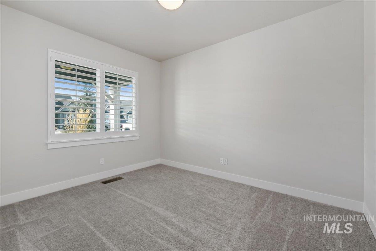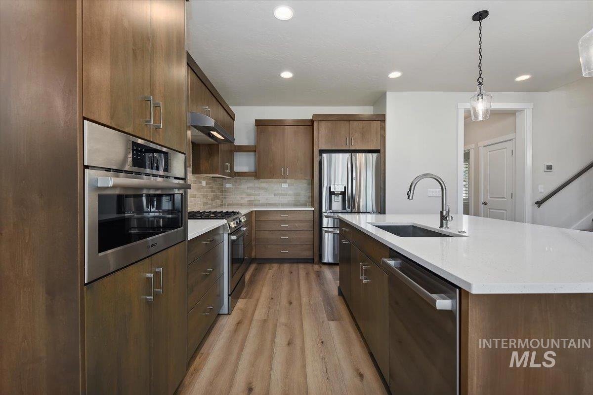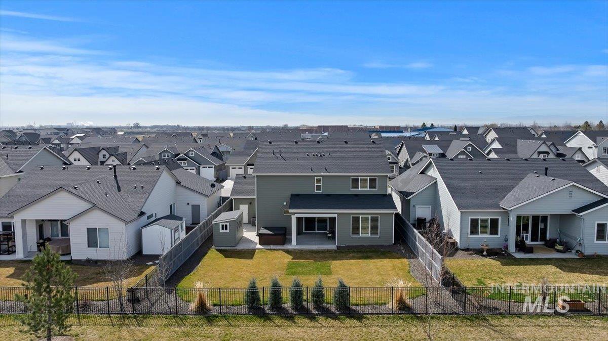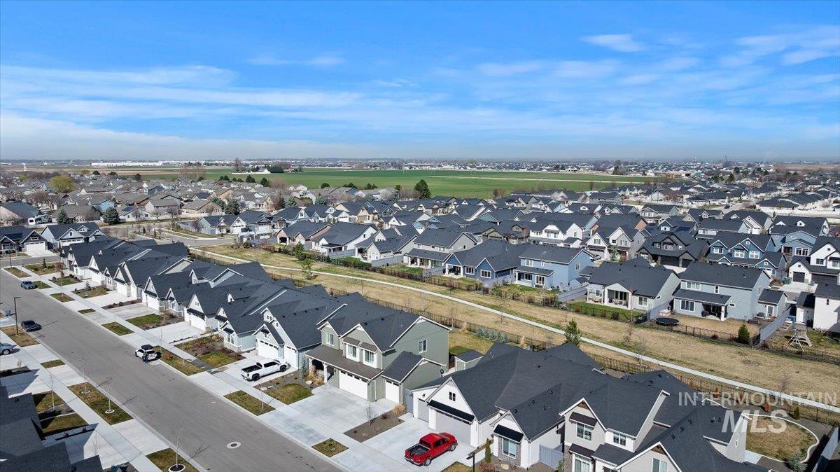 Better than new and designed to stand out. Backing to a common space with no immediate rear neighbors, this home offers a more open yet private setting that’s hard to find. A covered front porch welcomes you into a thoughtfully designed layout featuring SIX distinct spaces for flexible, elevated living. Main level includes a dedicated den/office and open-concept living, dining, and kitchen area anchored by a floor-to-ceiling tiled gas fireplace. Kitchen features quartz countertops, Bosch appliances (gas range, built-in microwave, dishwasher), LG refrigerator, and walk-in pantry with outlet. LVP flooring, plantation shutters, Vertiglide shade, and dual-zone climate control add comfort throughout. TONS of storage. Upstairs offers 4 bedrooms, laundry room, and insulated media/bonus room with closet, ideal as a 5th bedroom or flex space. Primary suite includes dual vanities, tile shower, and walk-in closet with built-ins. Secondary bath offers dual sinks and tub/shower combo. Tankless water heater, extended 3-car garage with epoxy floors and storage system. Covered patio, extended concrete, and Stor-More shed. Arbor community with pools, parks, and paths. Vallivue School District. Designed for both everyday living and elevated entertaining, this home offers a rare combination of space, comfort, and thoughtful upgrades in a setting that feels open, functional, and refined. Exceptional!