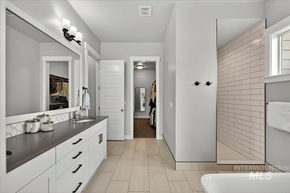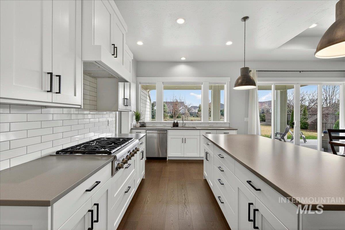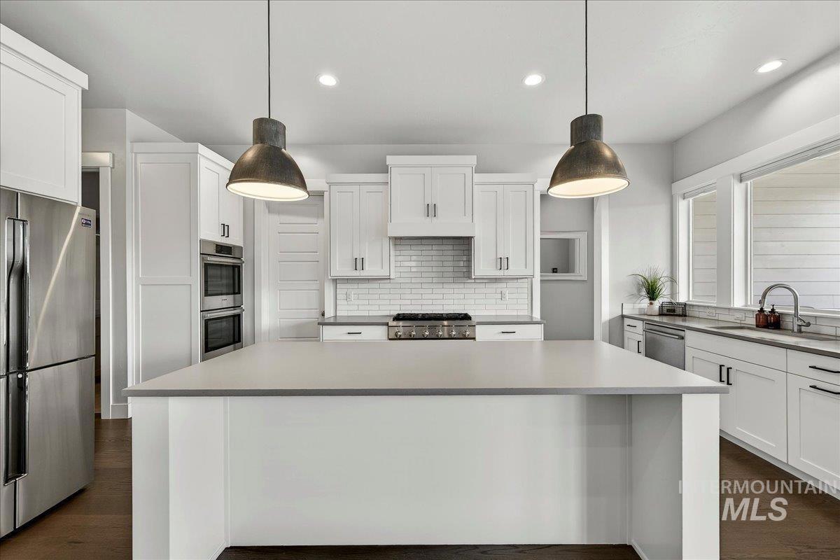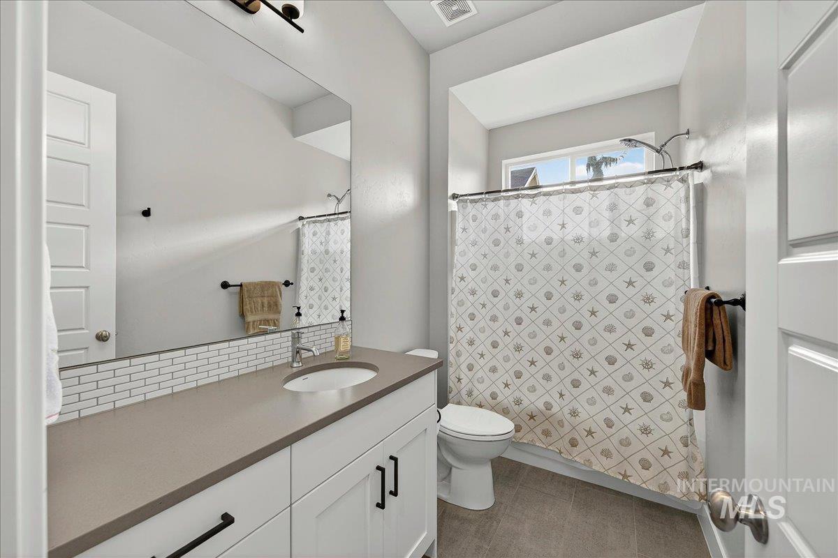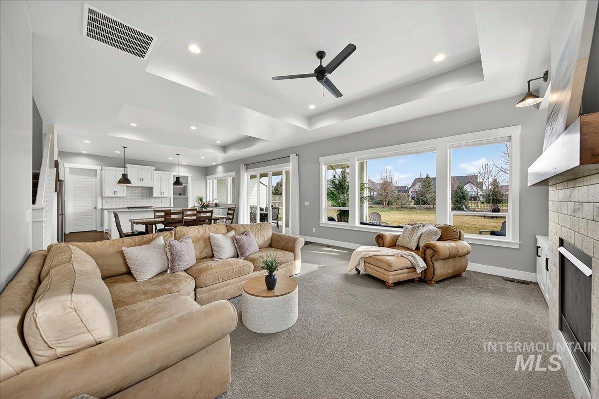 Experience elevated living in this stunning modern farmhouse, situated in the highly sought-after Homestead community in Eagle. Set on a spacious 0.317-acre lot with an east-facing backyard, the property borders community green space—creating a sense of expanded outdoor living, added privacy, & effortless access to the neighborhood pool just steps away. Inside, soaring ceilings, custom millwork, & hardwood floors flow seamlessly throughout the main living. The open-concept great room is filled with natural light & anchored by a cozy gas fireplace with beautiful built-ins, creating a warm yet sophisticated gathering space. The gourmet kitchen is a true showpiece, featuring custom cabinetry, quartz countertops, a Thermador gas range, Bosch double ovens, a walk-in pantry, & fridge included. Dual sliding glass doors create a seamless indoor-outdoor connection, perfect for entertaining or enjoying al fresco dining on the expansive covered patio. The serene main-level primary suite offers a spa-like retreat with a soaking tub, dual vanities, a floor-to-ceiling tiled walk-in shower, & a spacious walk-in closet with convenient access to the laundry room. Upstairs, a generous bonus room provides flexible space for a media room, home gym, office, or playroom—tailored to fit your lifestyle. Garage enthusiasts will appreciate the fully finished, oversized 3-car garage.
