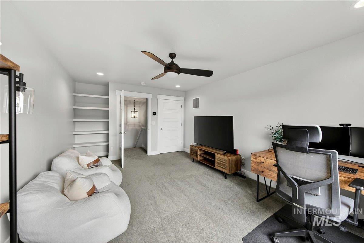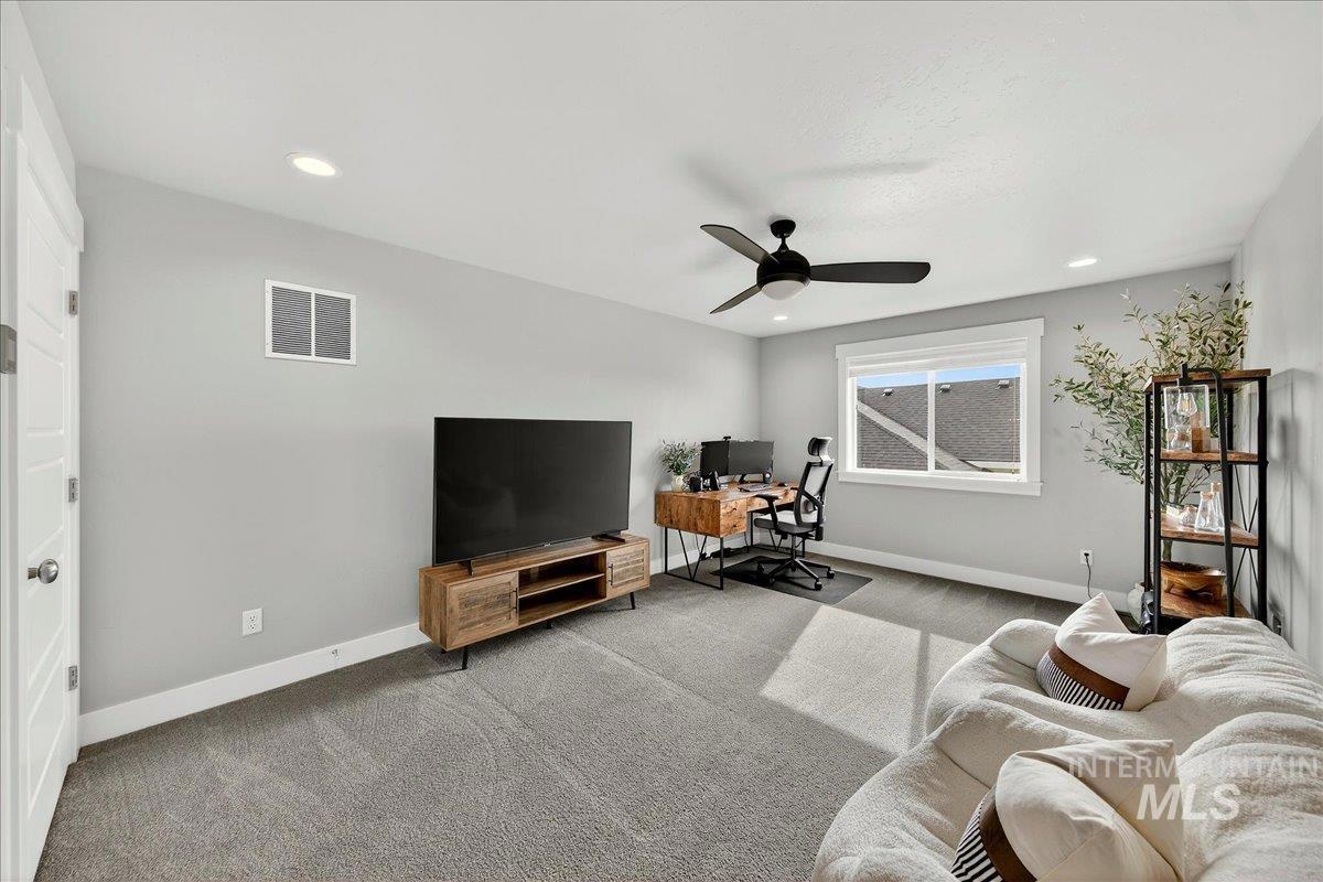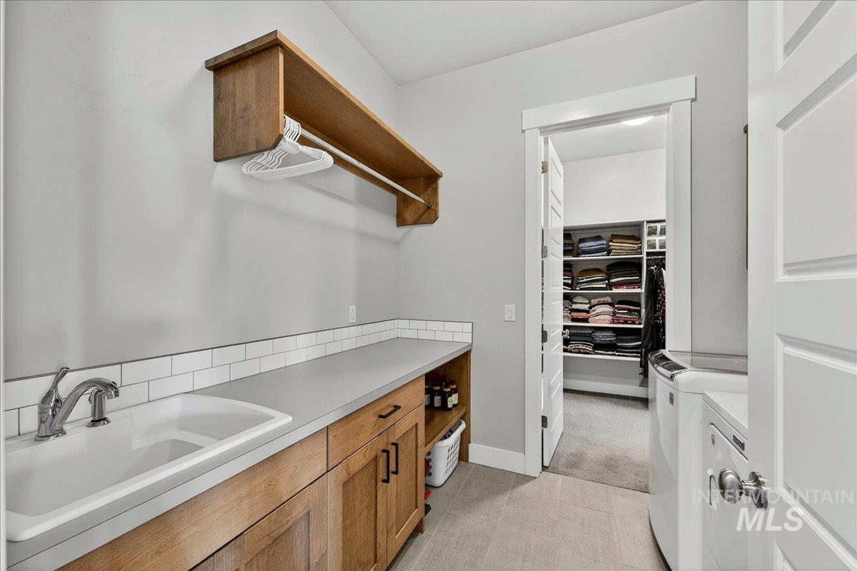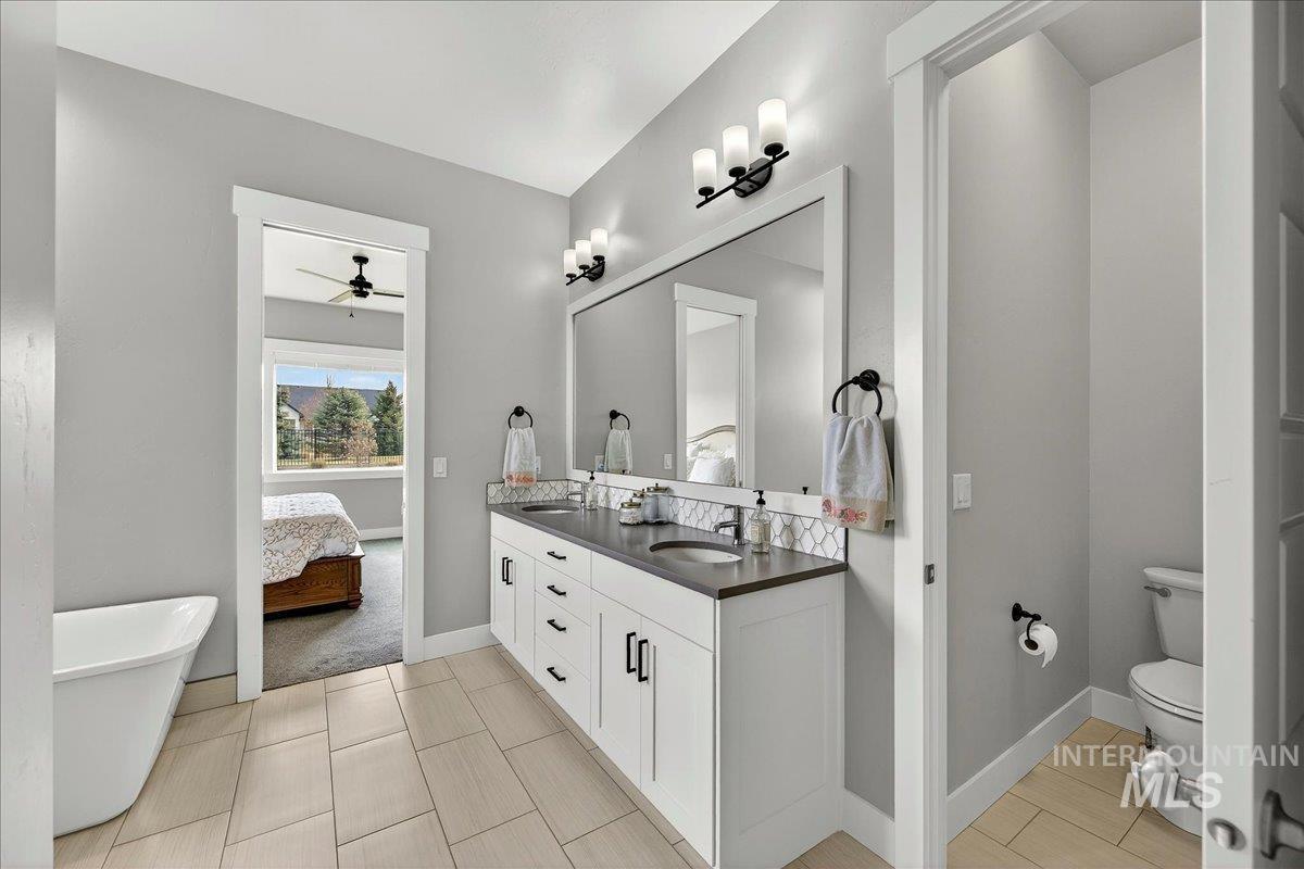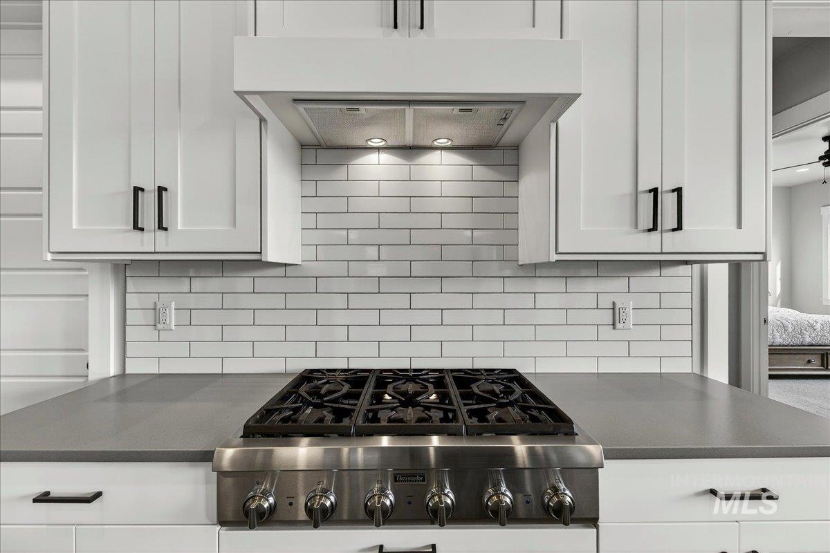 Experience elevated living in this stunning modern farmhouse, situated in the highly sought-after Homestead community in Eagle. Set on a spacious 0.317-acre lot with an east-facing backyard, the property borders community green space—creating a sense of expanded outdoor living, added privacy, & effortless access to the neighborhood pool just steps away. Inside, soaring ceilings, custom millwork, & hardwood floors flow seamlessly throughout the main living. The open-concept great room is filled with natural light & anchored by a cozy gas fireplace with beautiful built-ins, creating a warm yet sophisticated gathering space. The gourmet kitchen is a true showpiece, featuring custom cabinetry, quartz countertops, a Thermador gas range, Bosch double ovens, a walk-in pantry, & fridge included. Dual sliding glass doors create a seamless indoor-outdoor connection, perfect for entertaining or enjoying al fresco dining on the expansive covered patio. The serene main-level primary suite offers a spa-like retreat with a soaking tub, dual vanities, a floor-to-ceiling tiled walk-in shower, & a spacious walk-in closet with convenient access to the laundry room. Upstairs, a generous bonus room provides flexible space for a media room, home gym, office, or playroom—tailored to fit your lifestyle. Garage enthusiasts will appreciate the fully finished, oversized 3-car garage.