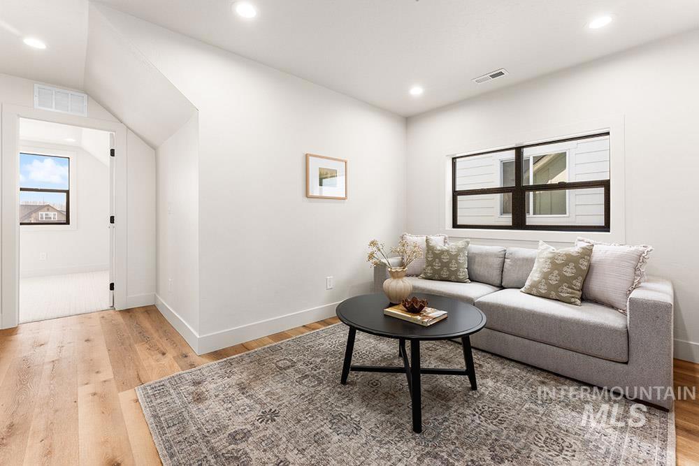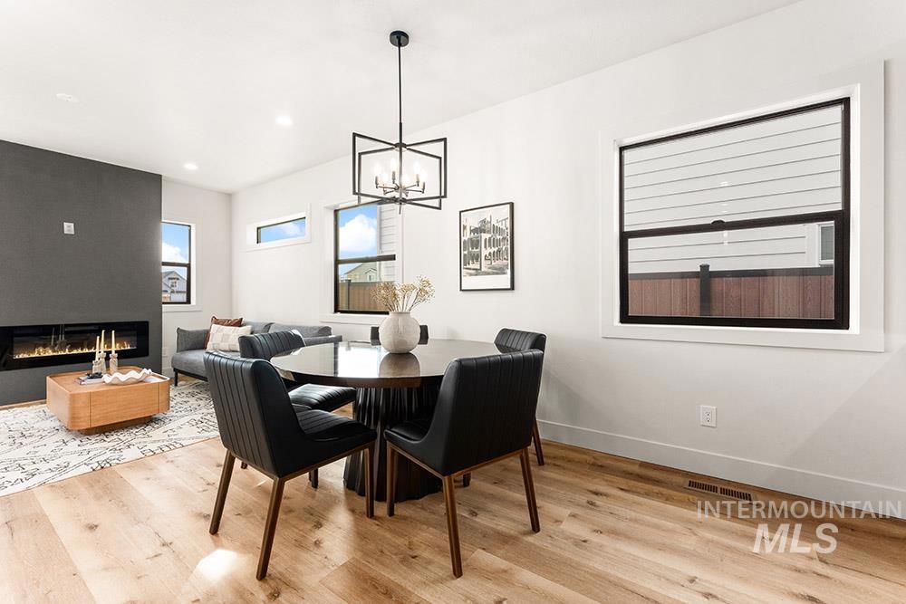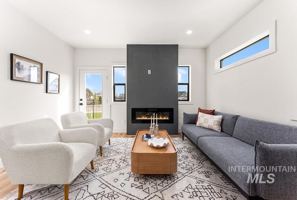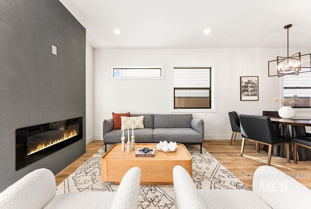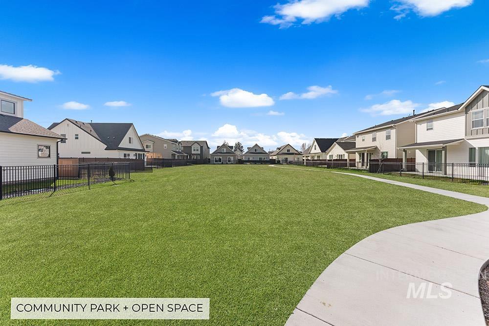Stunning, brand-new “lock-and-leave” construction in a prime Eagle location with no rear neighbors! Ideally situated walking distance from coffee shops and and restaurants, and just minutes from the heart of Eagle’s shopping, dining, and Eagle Island State Park, this home offers both convenience and lifestyle. Inside, you’ll find upscale finishes paired with a functional floorplan featuring three true bedrooms plus a versatile lounge space, perfect for a home theater, gym, office, or playroom. The kitchen shines with sleek flat-panel cabinetry, sparkling quartz countertops, a marbled tile backsplash, and stainless steel appliances, including a gas range, column refrigerator, and vent hood. The inviting living room centers around a floor-to-ceiling fireplace and offers direct access to the outdoor space. The light-filled primary suite also opens to the outdoors and features a luxurious en suite with heated flooring, dual vanities, a walk-in shower, and a spacious walk-in closet. Upstairs, you’ll find additional bedrooms and the flexible lounge area, creating a perfect separation of living spaces. HOA maintains the low-maintenance yard with room for pets and play without the hassle of upkeep. Backing to open space, the gated community includes a park, dog-friendly areas, walking paths, and a covered pavilion.