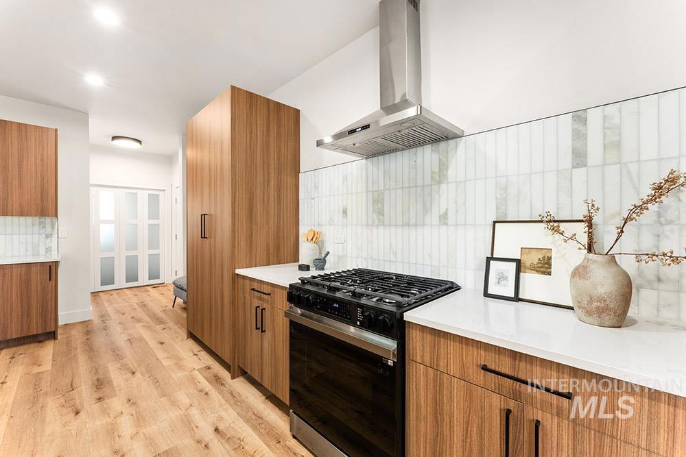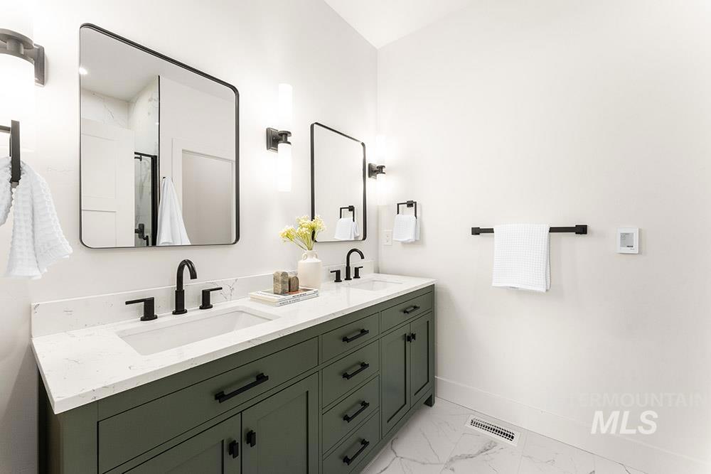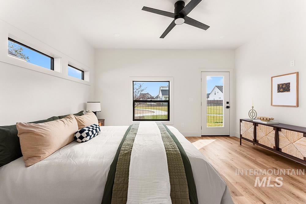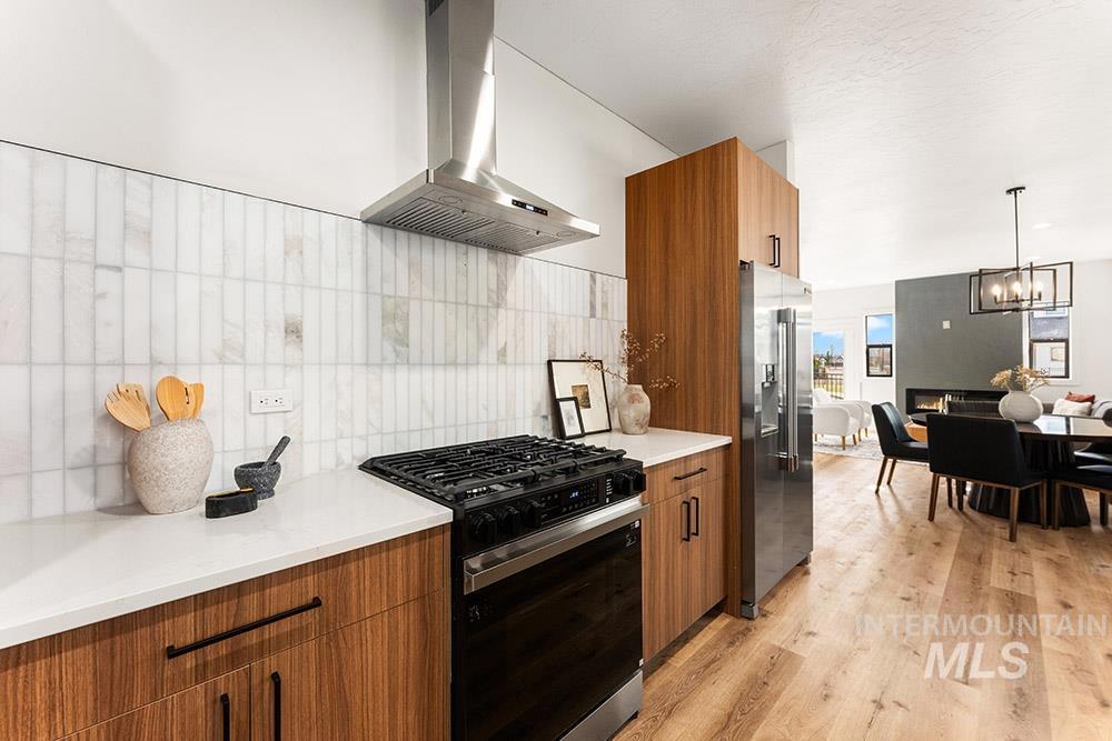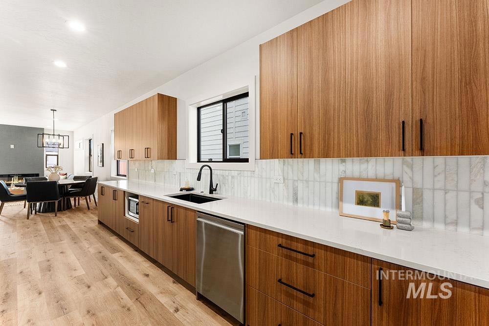 Stunning, brand-new “lock-and-leave” construction in a prime Eagle location with no rear neighbors! Ideally situated walking distance from coffee shops and and restaurants, and just minutes from the heart of Eagle’s shopping, dining, and Eagle Island State Park, this home offers both convenience and lifestyle. Inside, you’ll find upscale finishes paired with a functional floorplan featuring three true bedrooms plus a versatile lounge space, perfect for a home theater, gym, office, or playroom. The kitchen shines with sleek flat-panel cabinetry, sparkling quartz countertops, a marbled tile backsplash, and stainless steel appliances, including a gas range, column refrigerator, and vent hood. The inviting living room centers around a floor-to-ceiling fireplace and offers direct access to the outdoor space. The light-filled primary suite also opens to the outdoors and features a luxurious en suite with heated flooring, dual vanities, a walk-in shower, and a spacious walk-in closet. Upstairs, you’ll find additional bedrooms and the flexible lounge area, creating a perfect separation of living spaces. HOA maintains the low-maintenance yard with room for pets and play without the hassle of upkeep. Backing to open space, the gated community includes a park, dog-friendly areas, walking paths, and a covered pavilion.